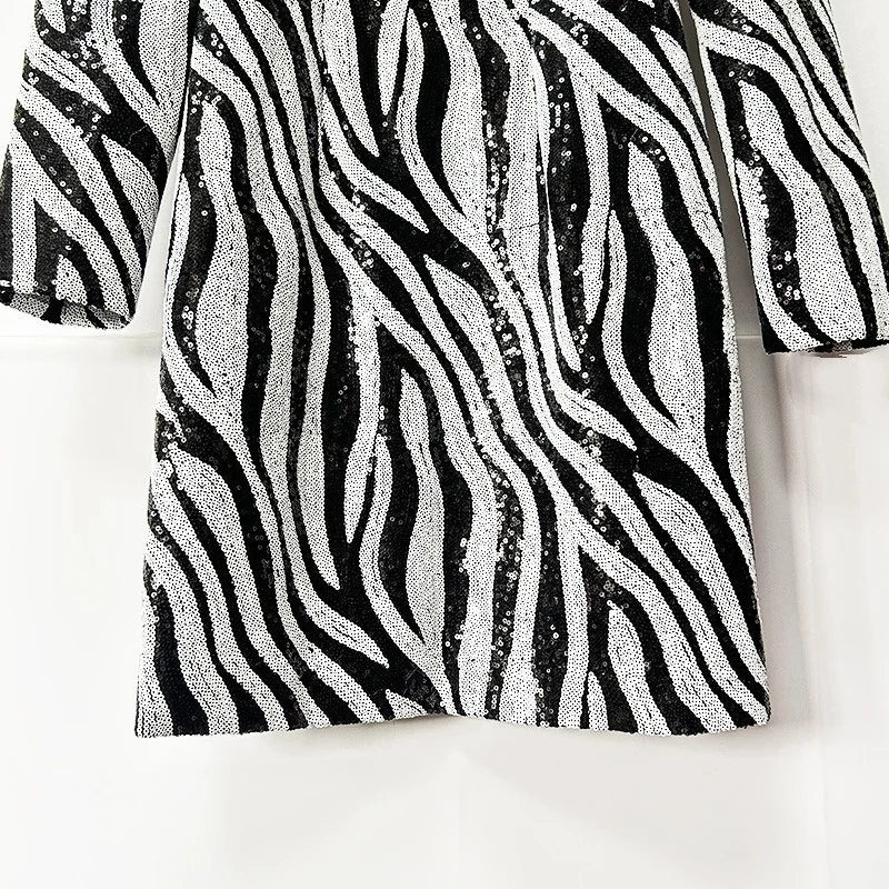 Make a bold entrance in the Trend4us Sequin Zebra Print Long Sleeve Mini Dress, a dazzling fusion of wild style and glamour. This fitted mini dress features an eye-catching black and white zebra pattern fully embellished with sequins for high-shine impact. Designed with long sleeves, a crew neckline, and a back zipper closure, it offers a sleek, structured silhouette perfect for parties, nightlife, and standout occasions.