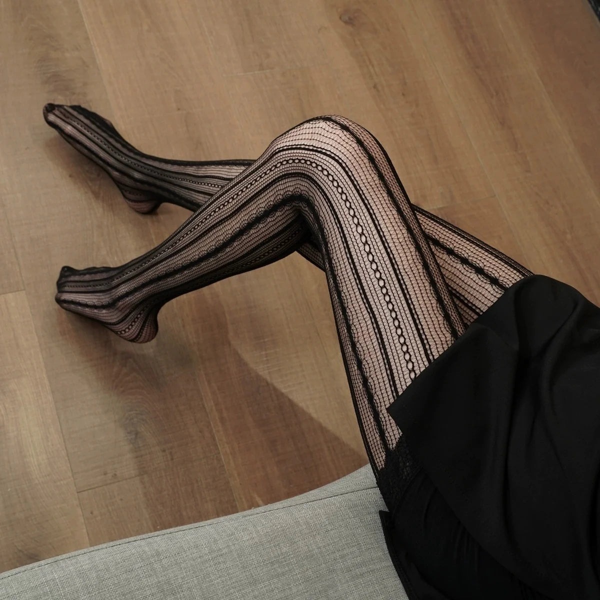 Step into timeless elegance with the Trend4us Vintage Striped Lace Knit Pantyhose. Featuring a delicate lace-knit design with vertical stripe detailing, these pantyhose effortlessly elongate your legs while adding a touch of vintage-inspired charm. Crafted from soft, stretch-knit fabric, they offer a comfortable fit and breathable wear — perfect for pairing with skirts, dresses, or layered under shorts for a chic, retro look.