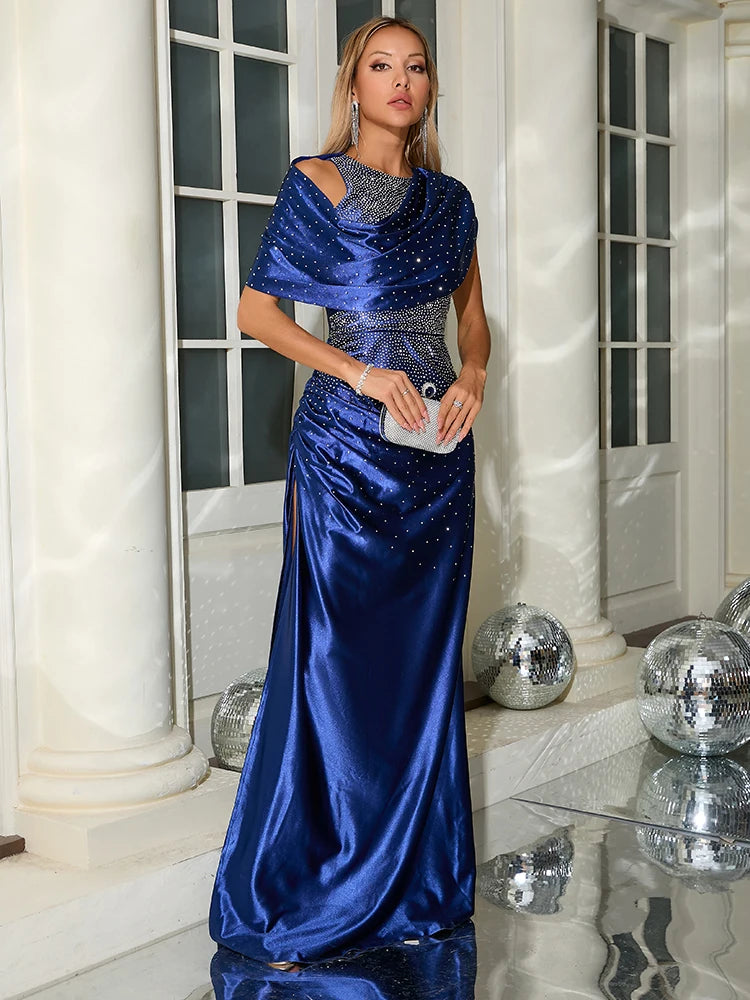 Trend4us Women's Elegant Draped Satin Beaded Evening Gown