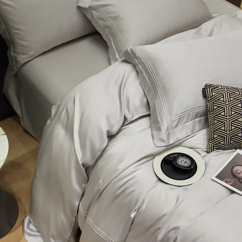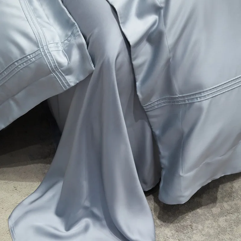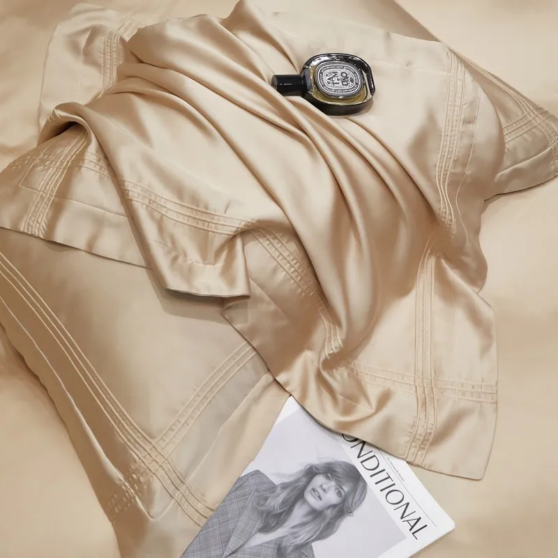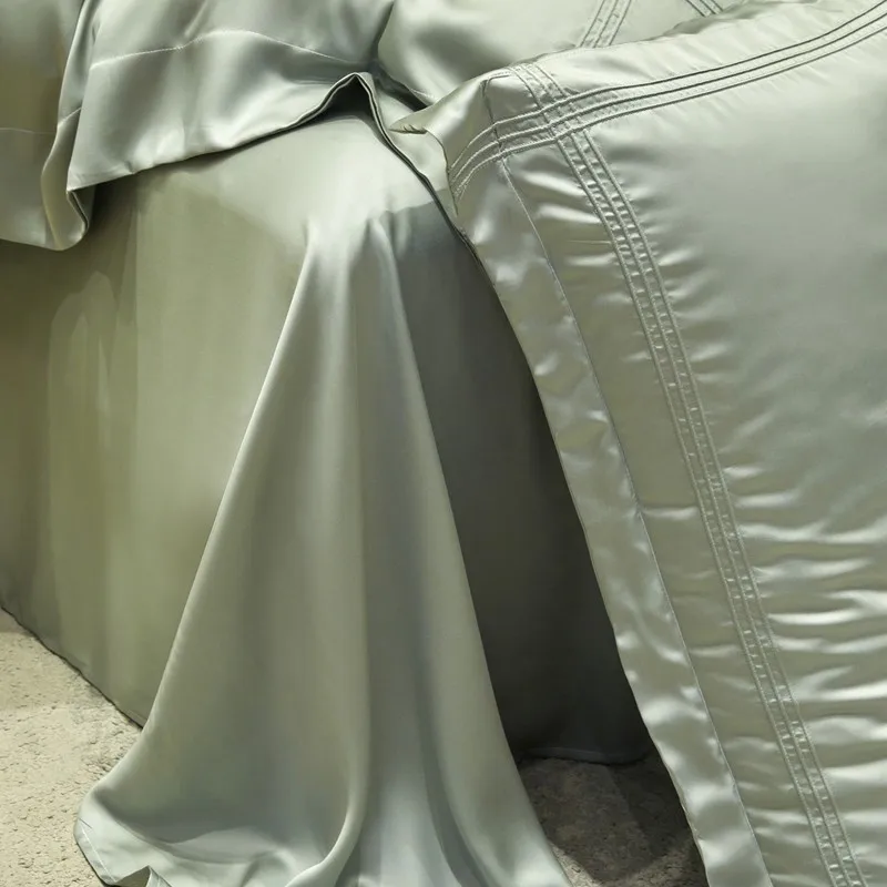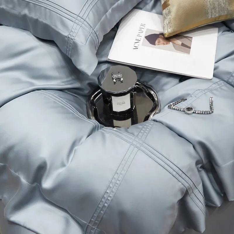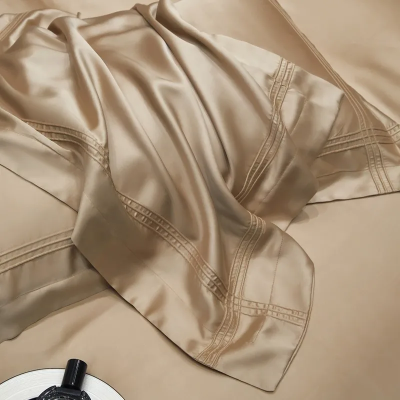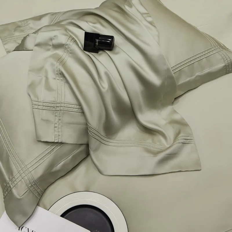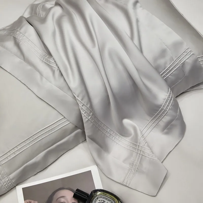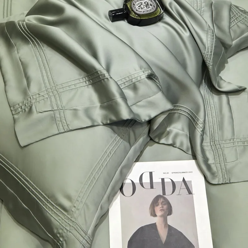 Each piece showcases delicate embroidered border detailing, adding subtle texture and depth to its minimalist silhouette. The high-thread-count satin fabric delivers exceptional breathability, helping regulate temperature for year-round comfort — cool in summer, cozy in winter.