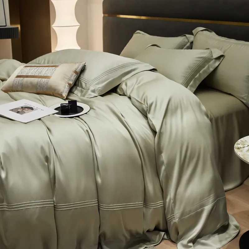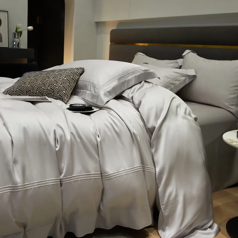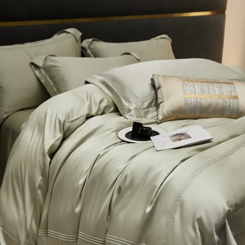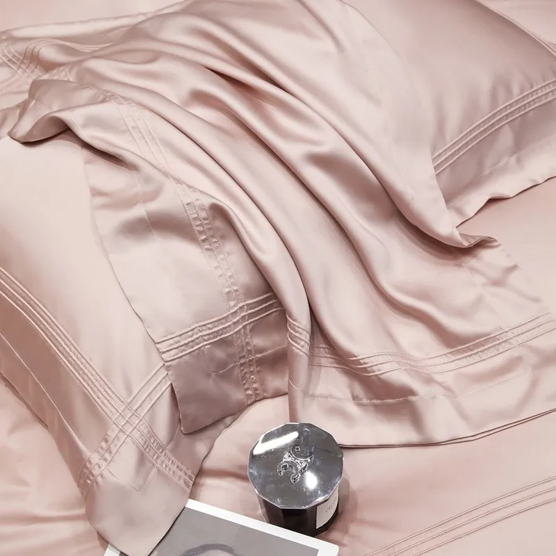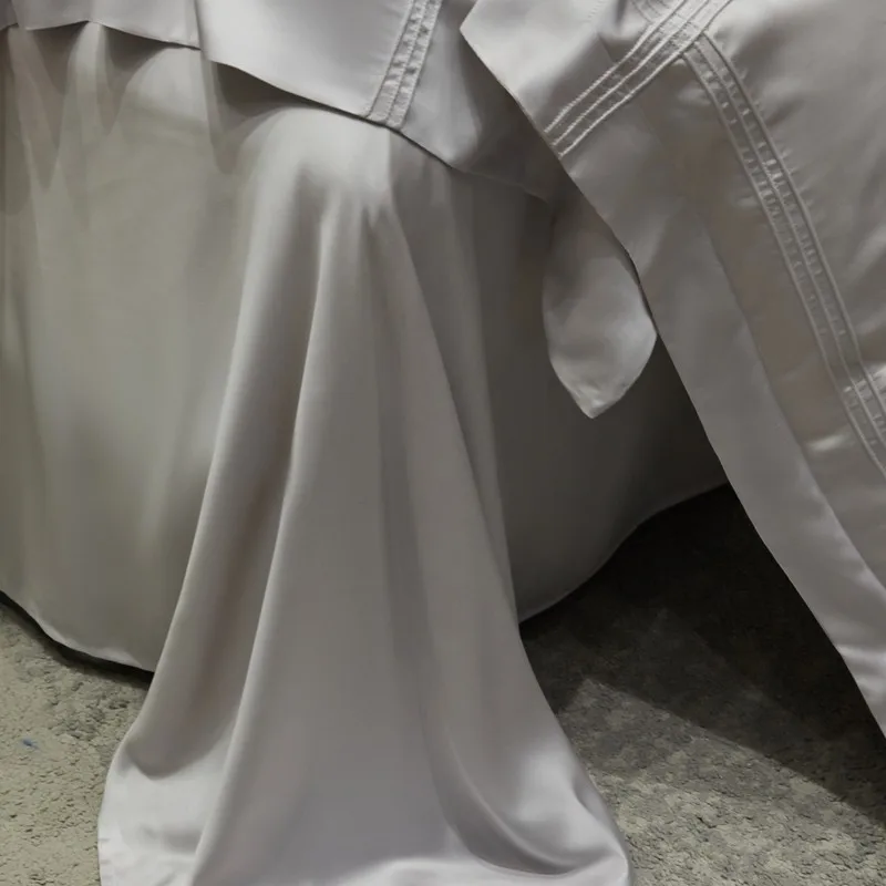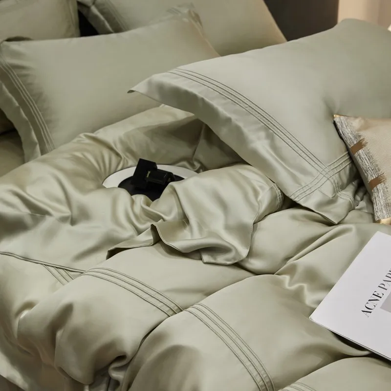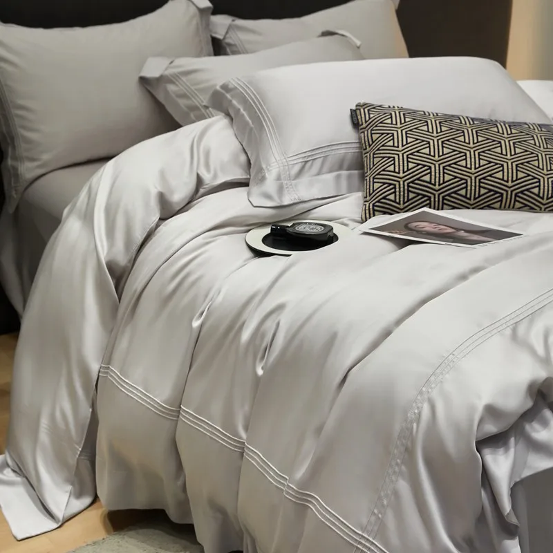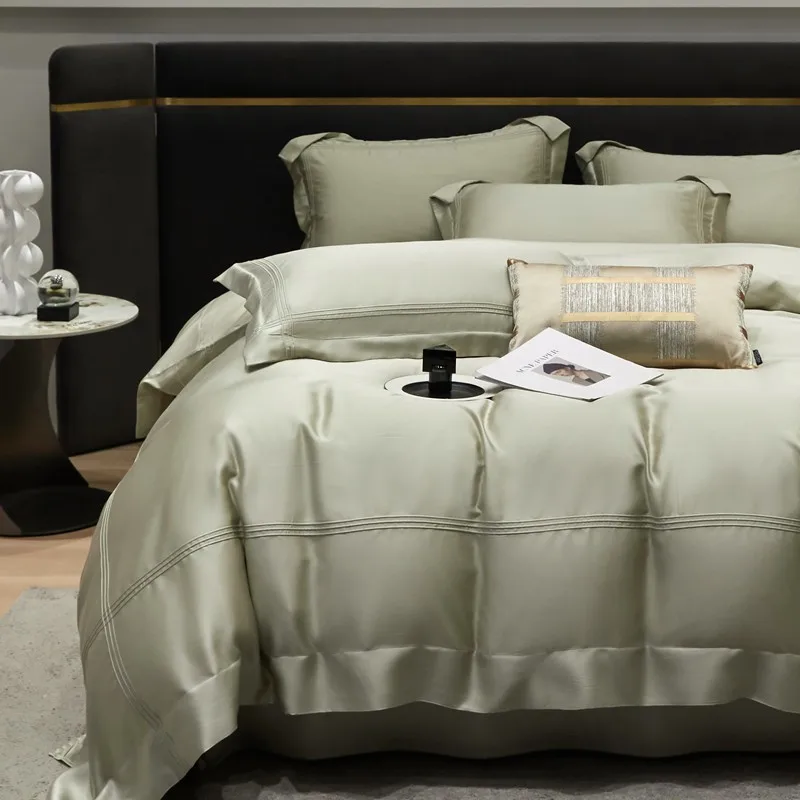 Each piece showcases delicate embroidered border detailing, adding subtle texture and depth to its minimalist silhouette. The high-thread-count satin fabric delivers exceptional breathability, helping regulate temperature for year-round comfort — cool in summer, cozy in winter.