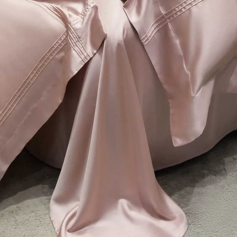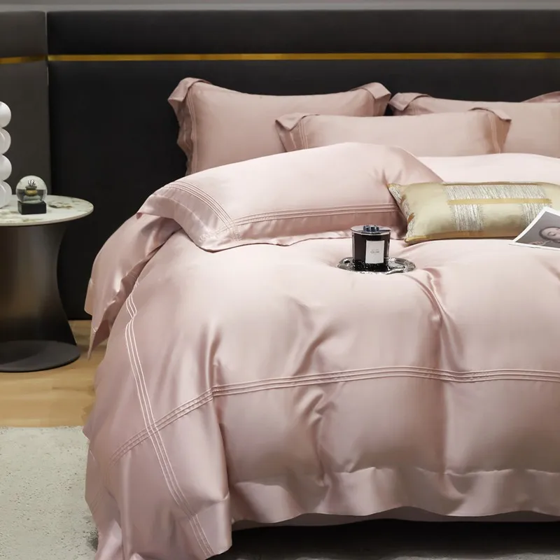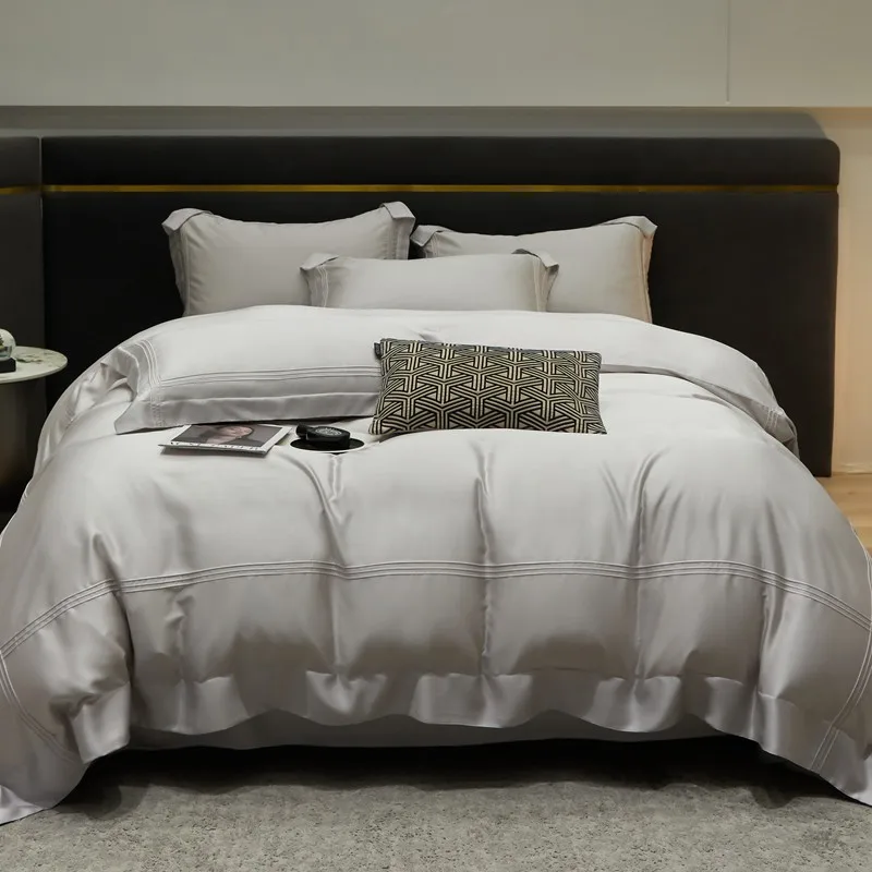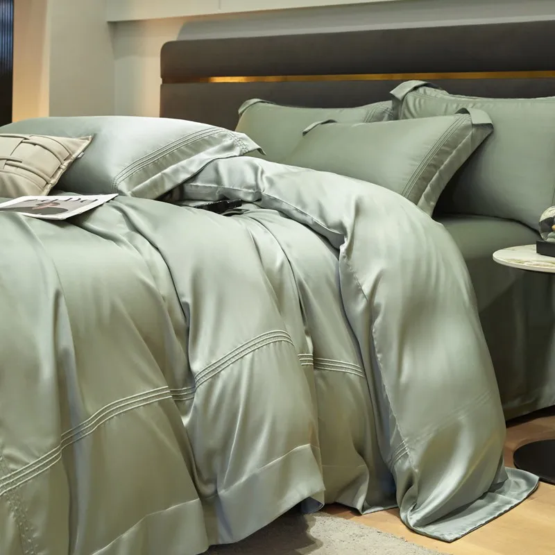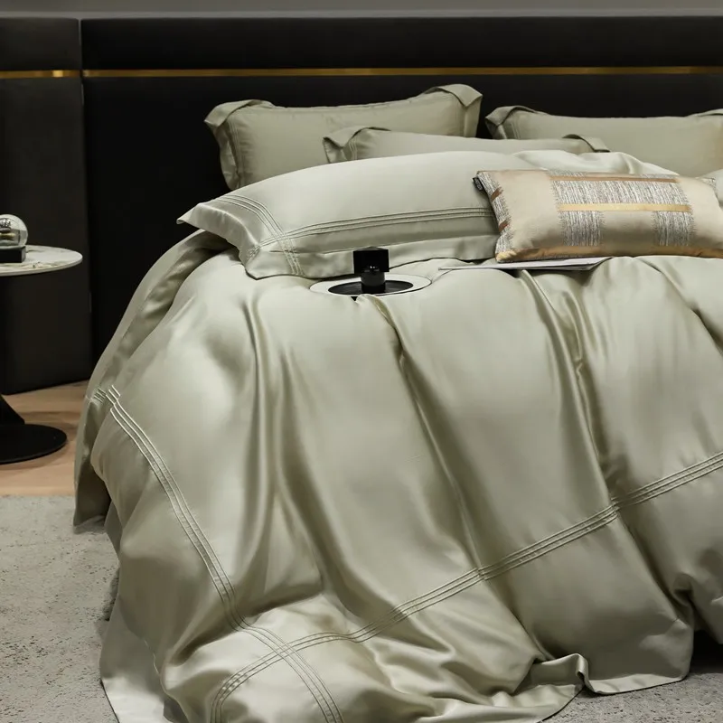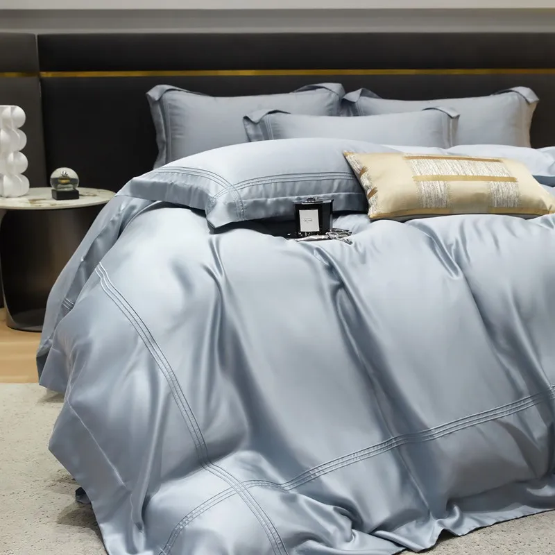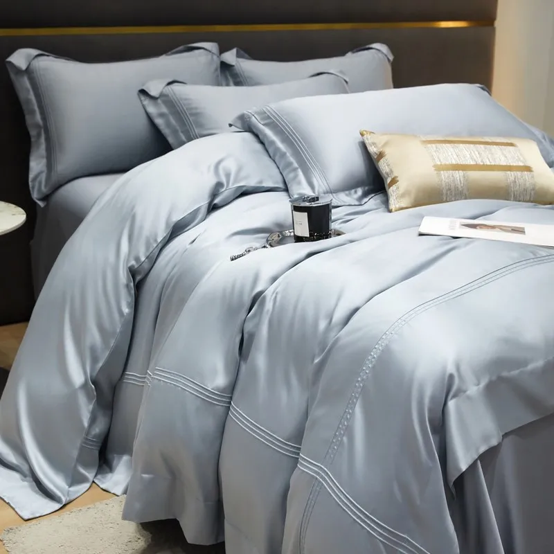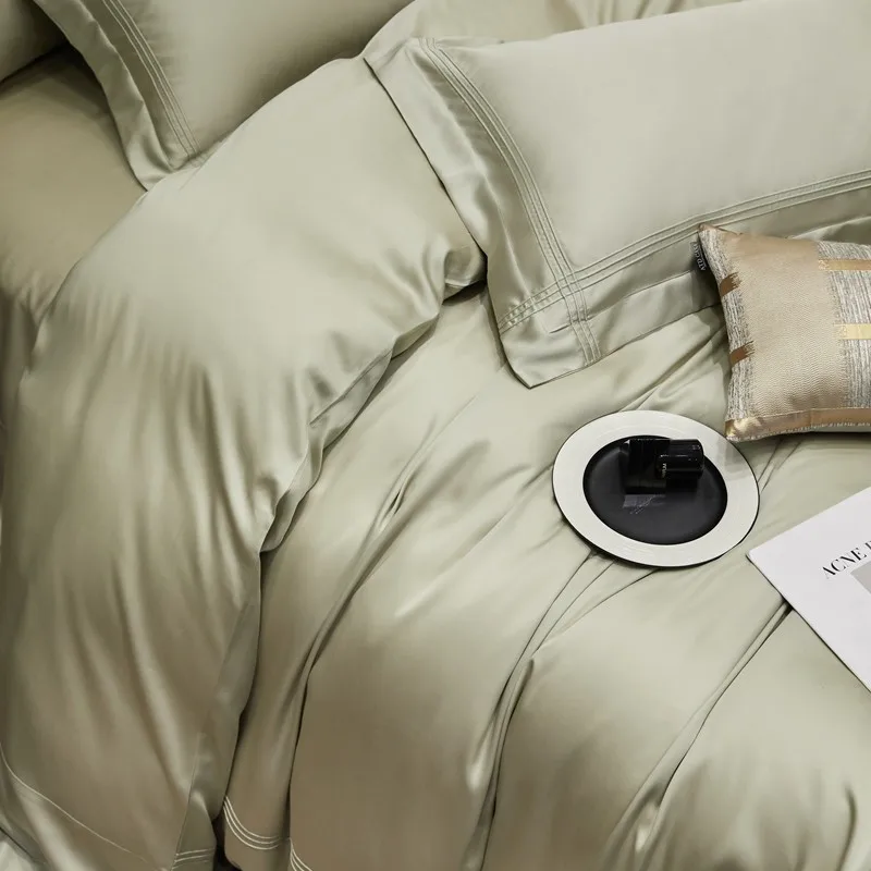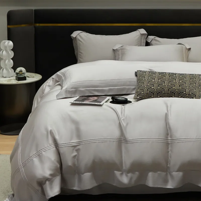Each piece showcases delicate embroidered border detailing, adding subtle texture and depth to its minimalist silhouette. The high-thread-count satin fabric delivers exceptional breathability, helping regulate temperature for year-round comfort — cool in summer, cozy in winter.