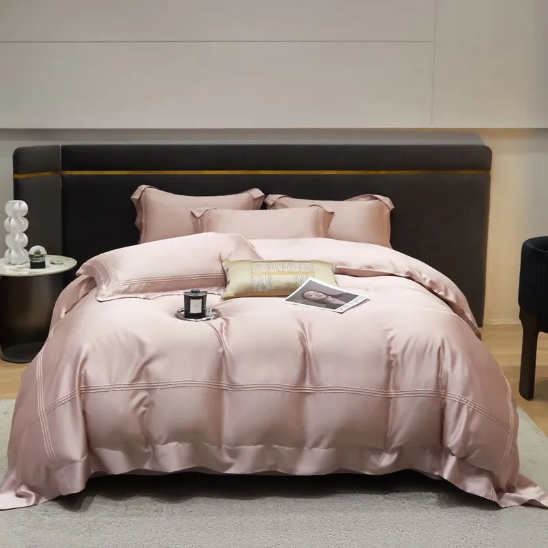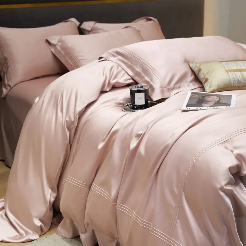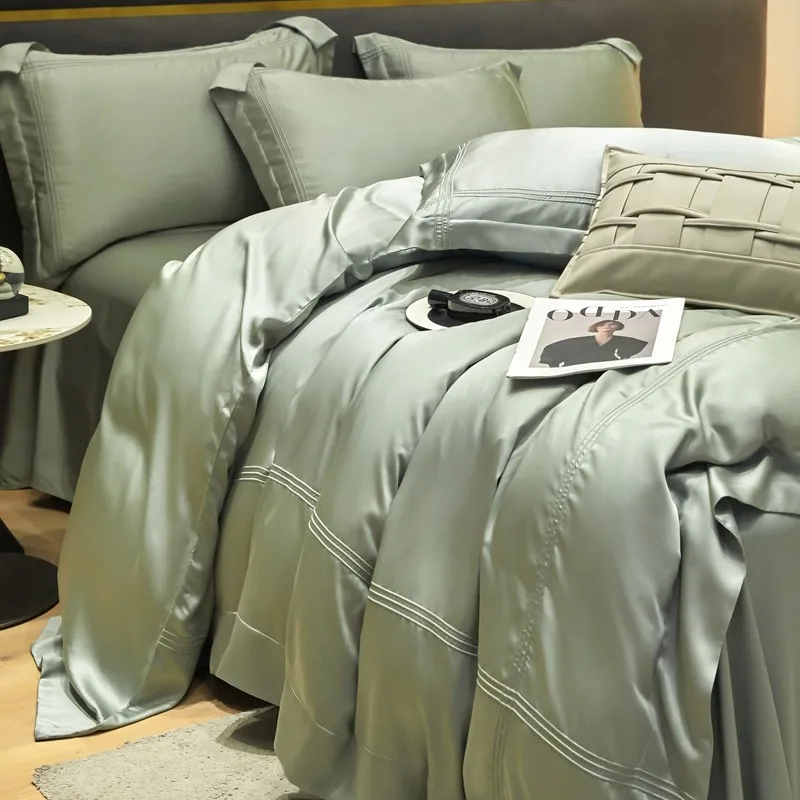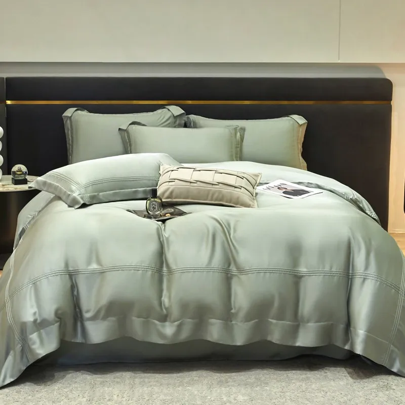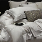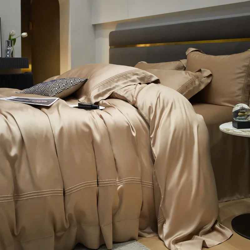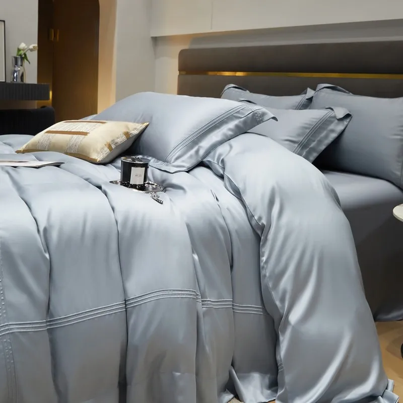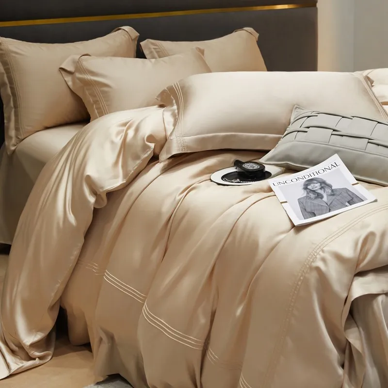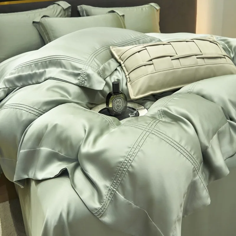 Each piece showcases delicate embroidered border detailing, adding subtle texture and depth to its minimalist silhouette. The high-thread-count satin fabric delivers exceptional breathability, helping regulate temperature for year-round comfort — cool in summer, cozy in winter.
