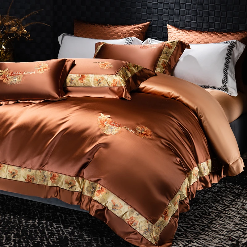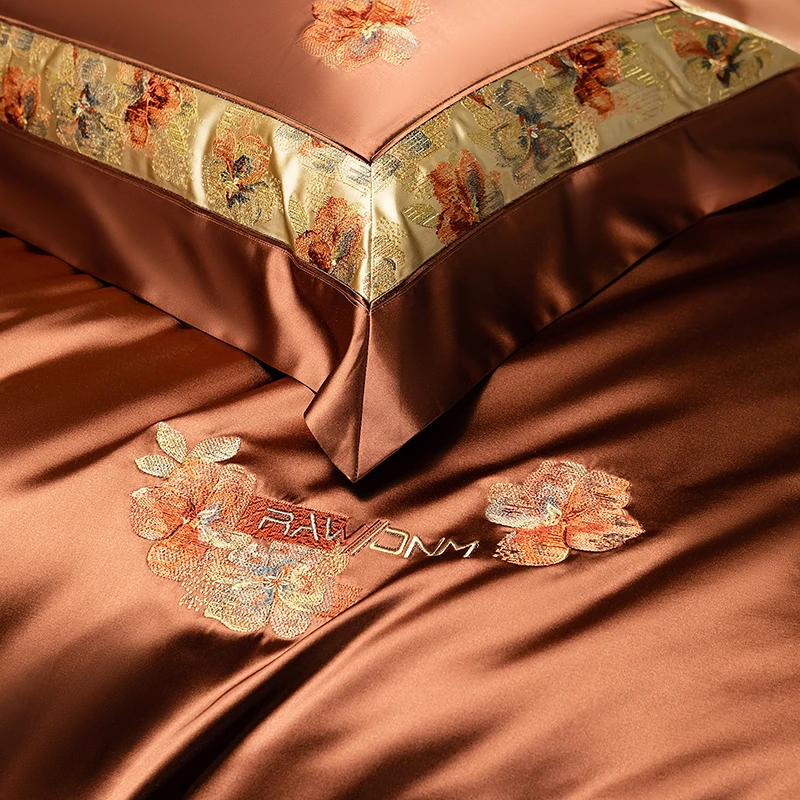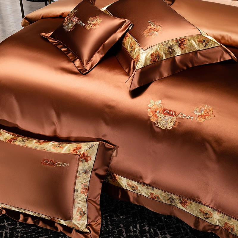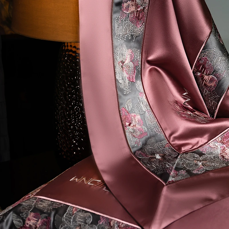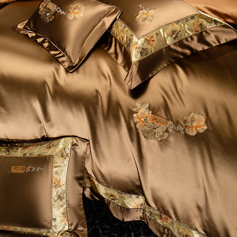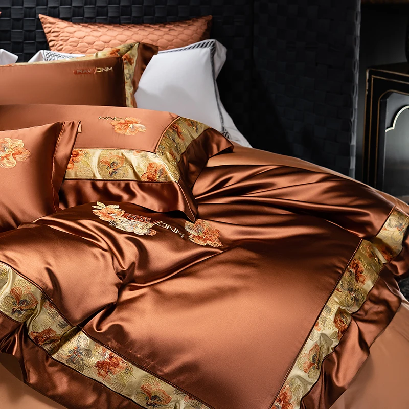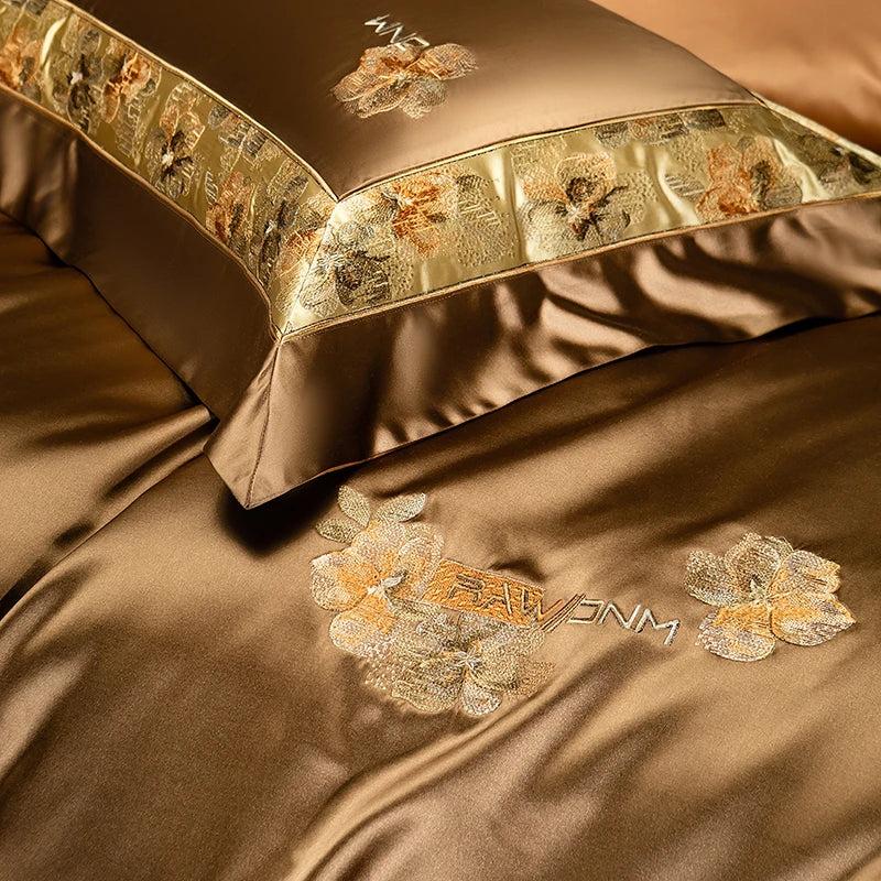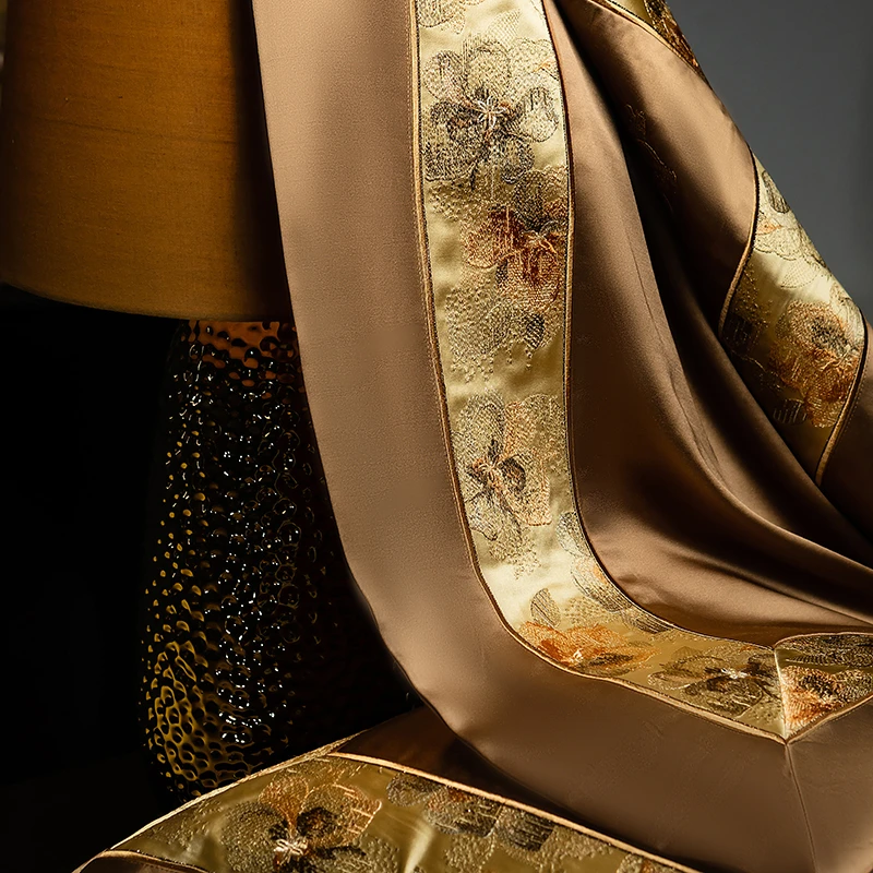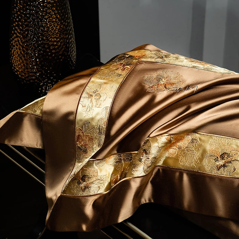 Delicate floral embroidery, intricate jacquard border accents, and a lustrous drape evoke a regal aesthetic — perfect for contemporary or classic interiors. Available in four rich tones — Golden Bronze, Charcoal Gray, Blush Rose, and Copper Amber — this bedding set transforms your bedroom into a sanctuary of sophistication and comfort.