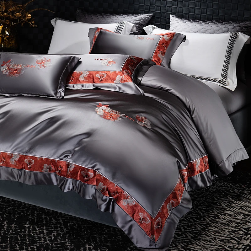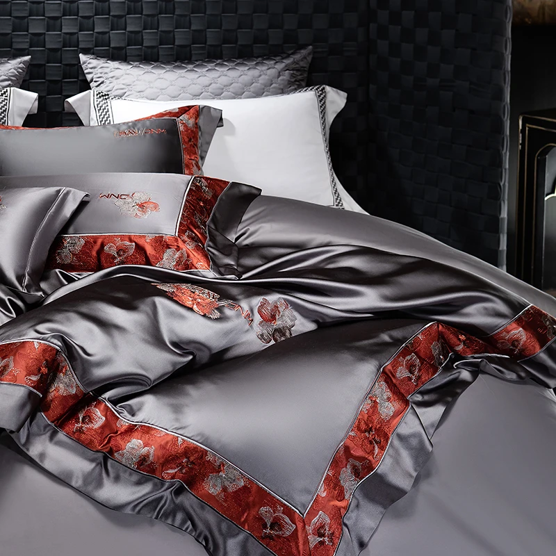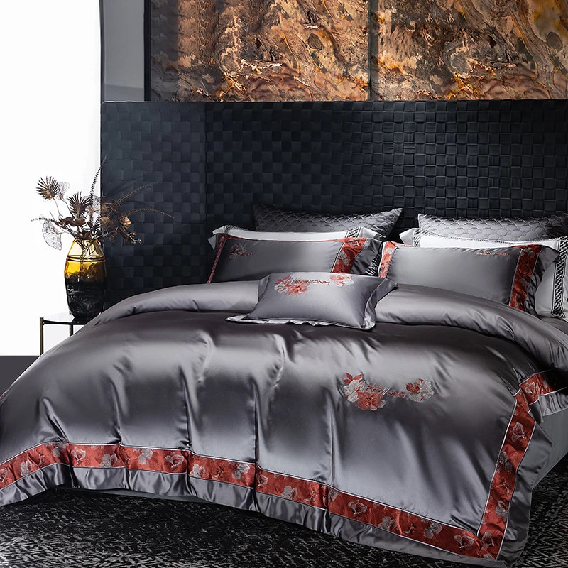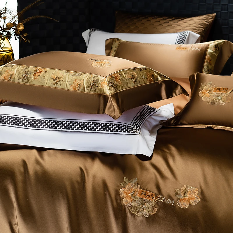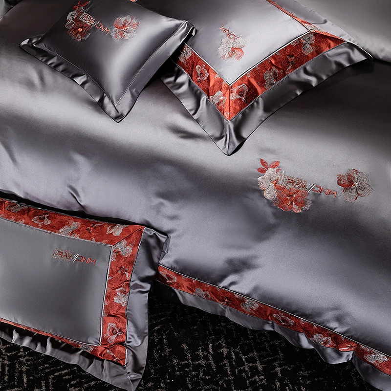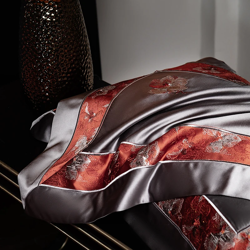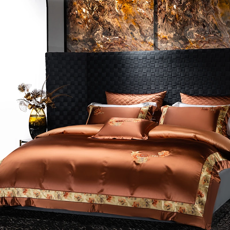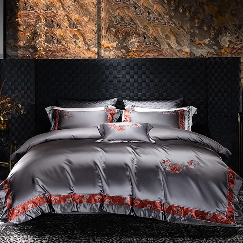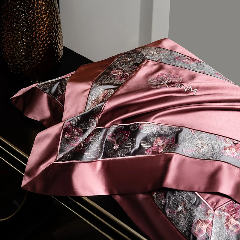 Delicate floral embroidery, intricate jacquard border accents, and a lustrous drape evoke a regal aesthetic — perfect for contemporary or classic interiors. Available in four rich tones — Golden Bronze, Charcoal Gray, Blush Rose, and Copper Amber — this bedding set transforms your bedroom into a sanctuary of sophistication and comfort.