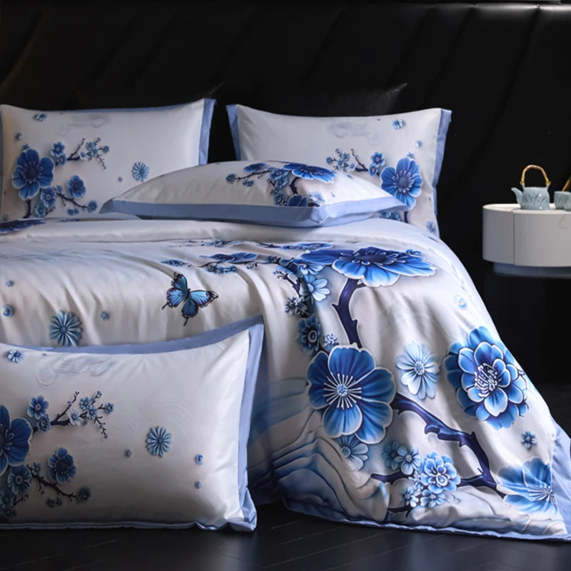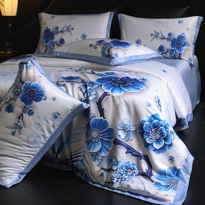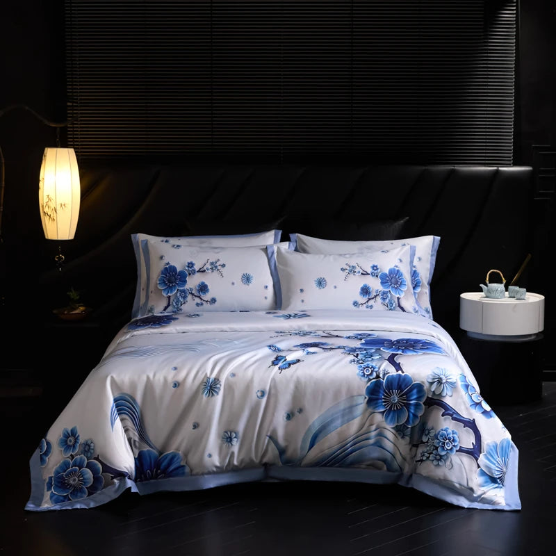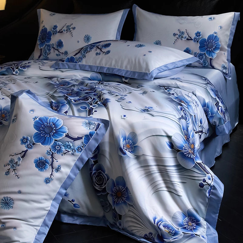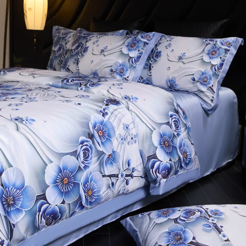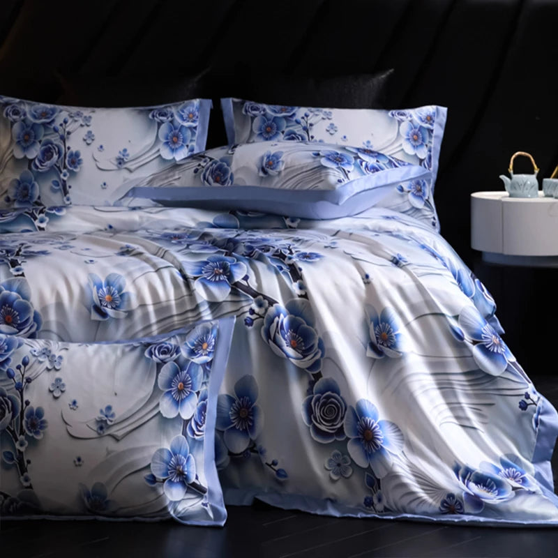 Bring contemporary elegance to your bedroom with the Trend4us Modern Blue Floral Print Bedding Set. Crafted from premium 100% polyester with a silky twill weave and 400 thread count construction, this set offers a smooth, breathable, and durable finish. Featuring a stunning blue floral design against a crisp background, it adds a vibrant yet sophisticated touch to any modern décor. The washed process ensures enhanced softness and a gentle drape over your bed. Designed for everyday luxury, the 4-piece set includes a duvet cover, a fitted sheet, and two pillowcases—perfectly tailored for comfort and style. Ideal for creating a fresh, uplifting atmosphere in any space.
