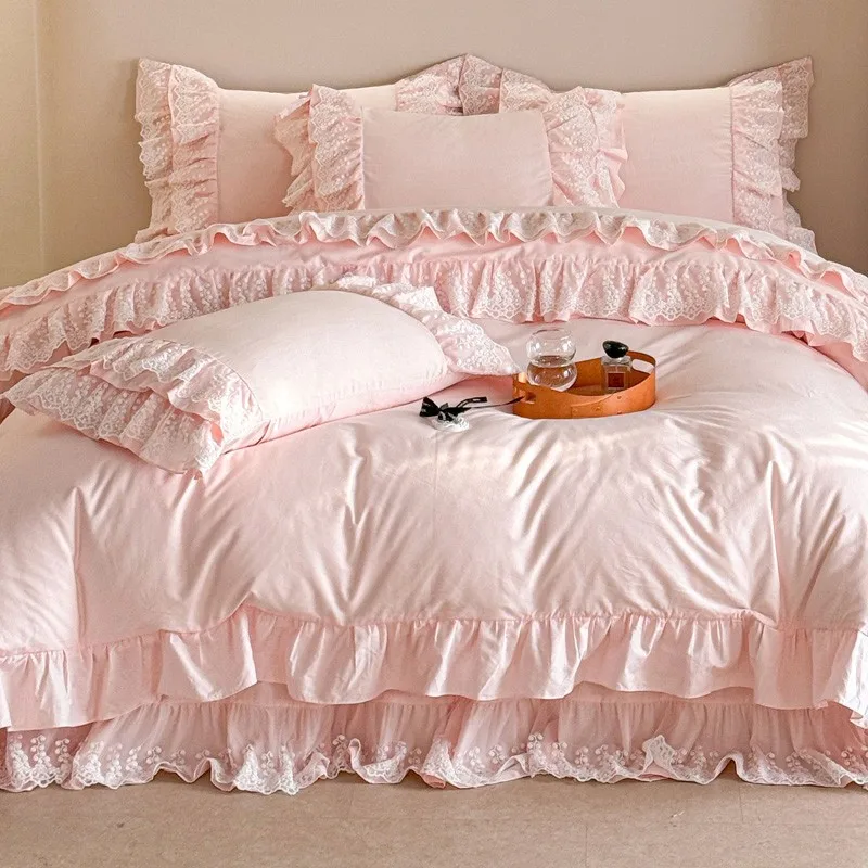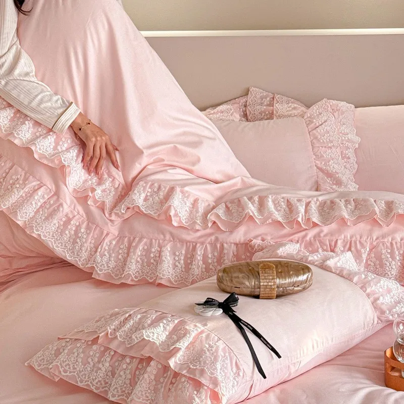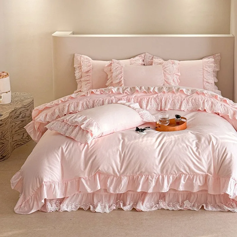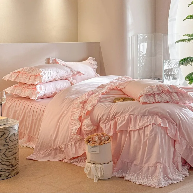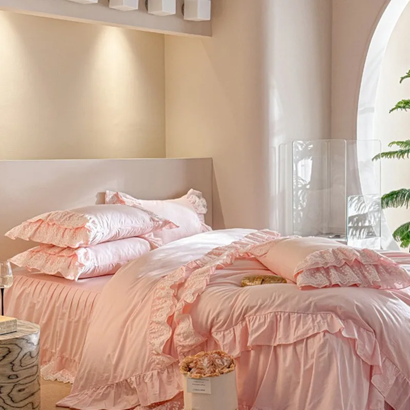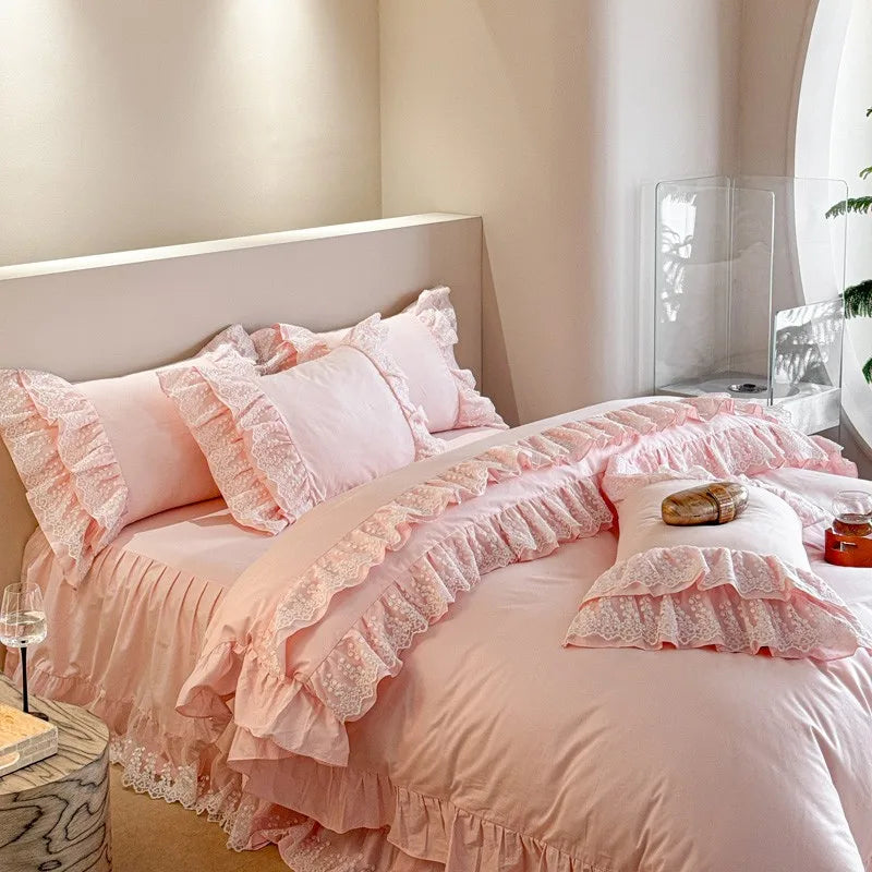 Trend4us Pink Bohemian Ruffle Lace Bedding Set