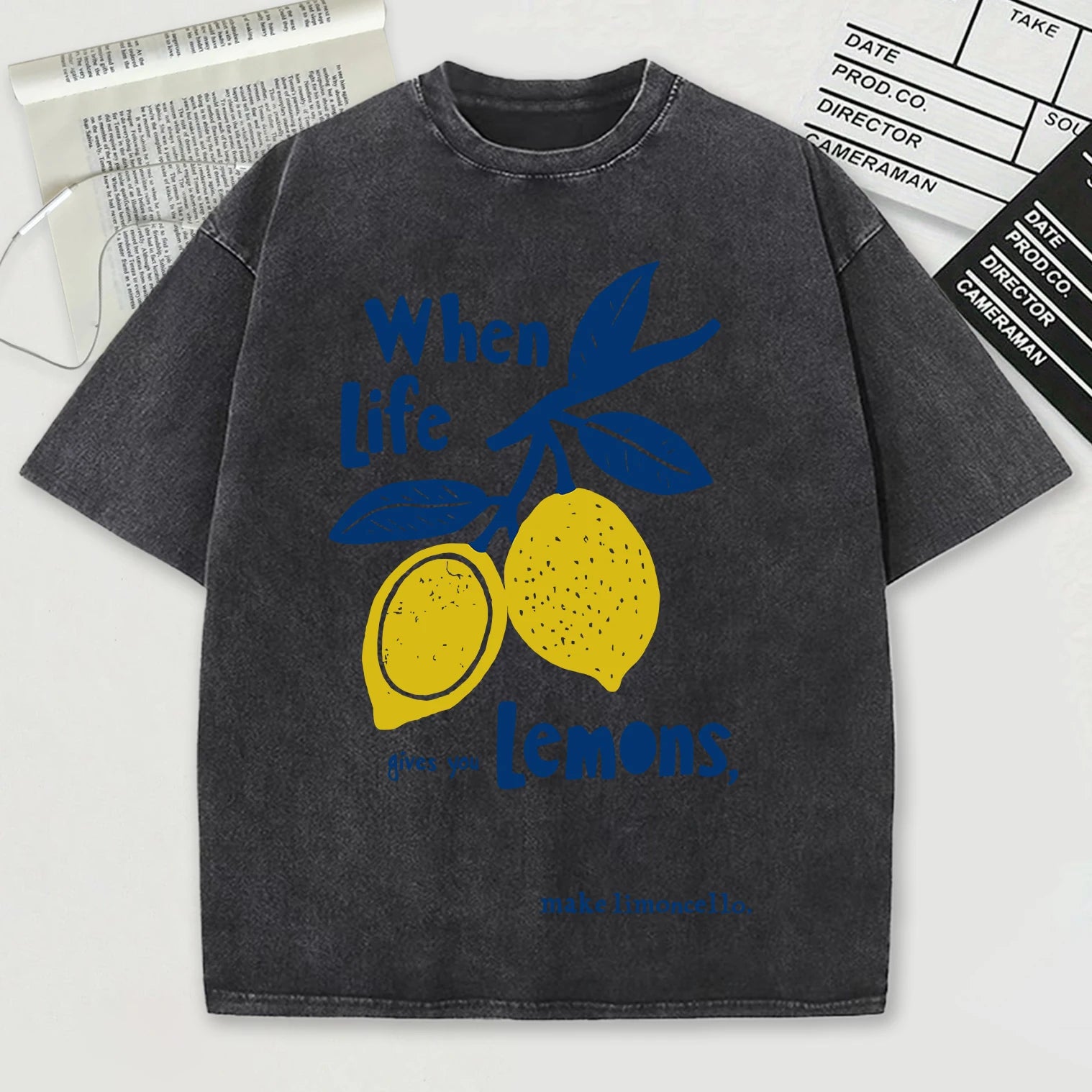 Add some zest to your wardrobe with the Trend4us Unisex “When Life Gives You Lemons” Vintage Washed Graphic T-Shirt. Featuring a bold lemon branch print and the motivational quote "When life gives you lemons, make limoncello," this tee brings humor and positivity to your casual style. Made from soft, breathable cotton with a trendy vintage-washed finish, it delivers comfort with a retro edge—perfect for relaxed days, creative minds, and good vibes only.