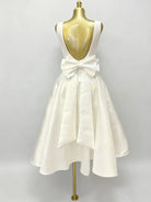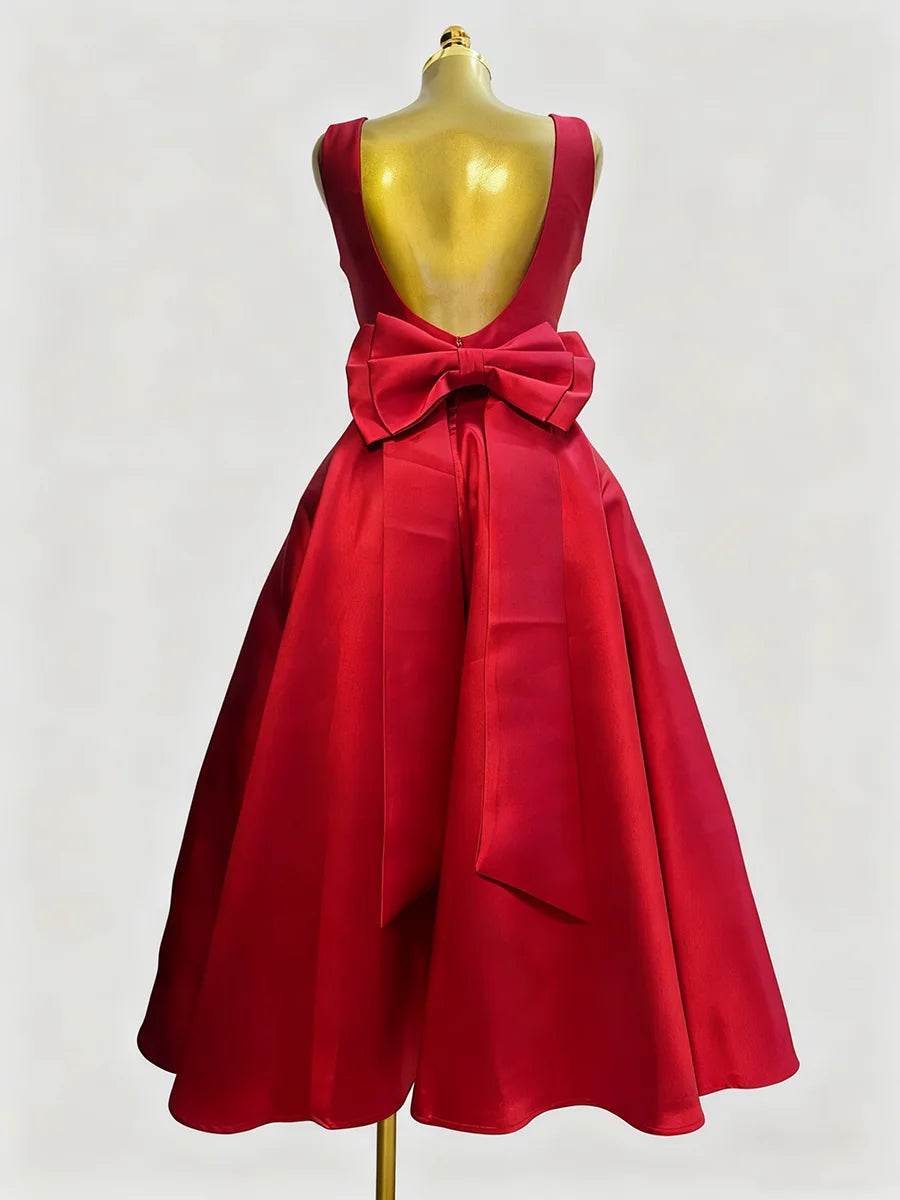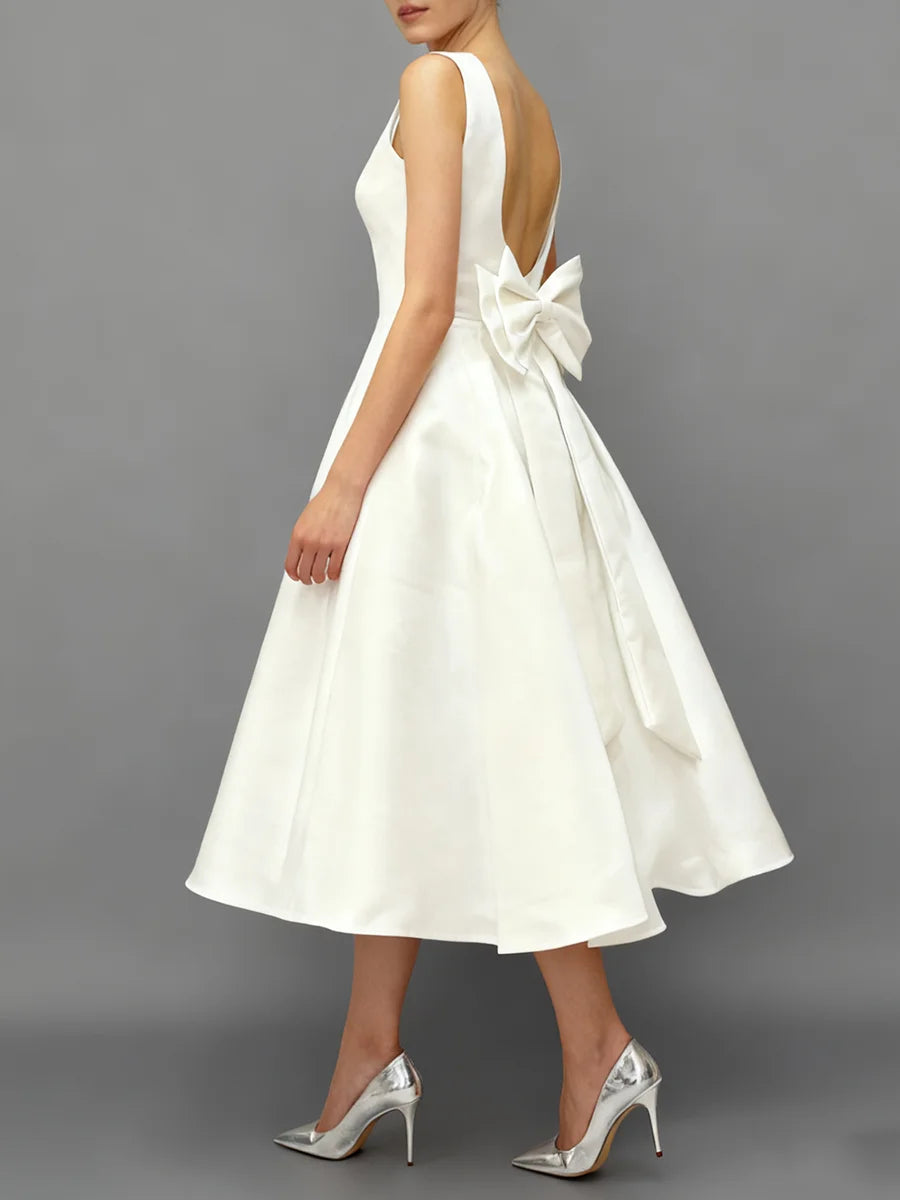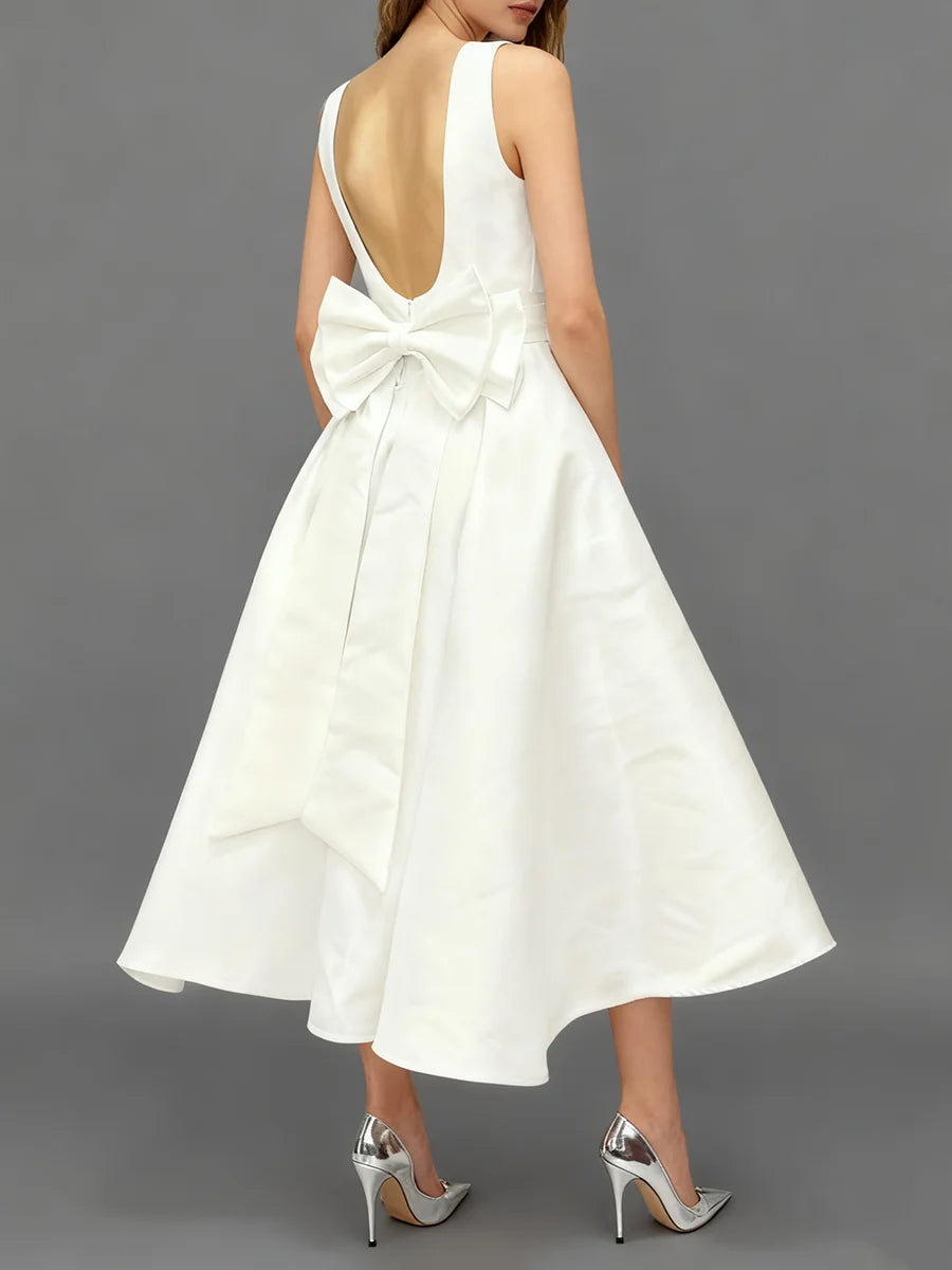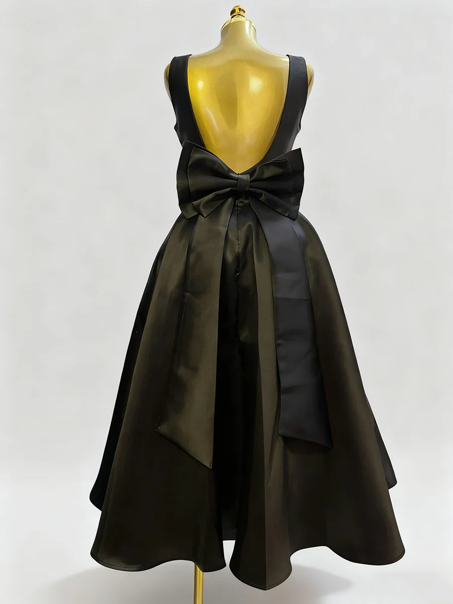 The flattering A-line silhouette is designed to accentuate the waist while the sleeveless, square neckline adds refined simplicity to the front. The real showstopper lies in the back — a deep V-cut open back adorned with a dramatic oversized bow that exudes romantic sophistication.