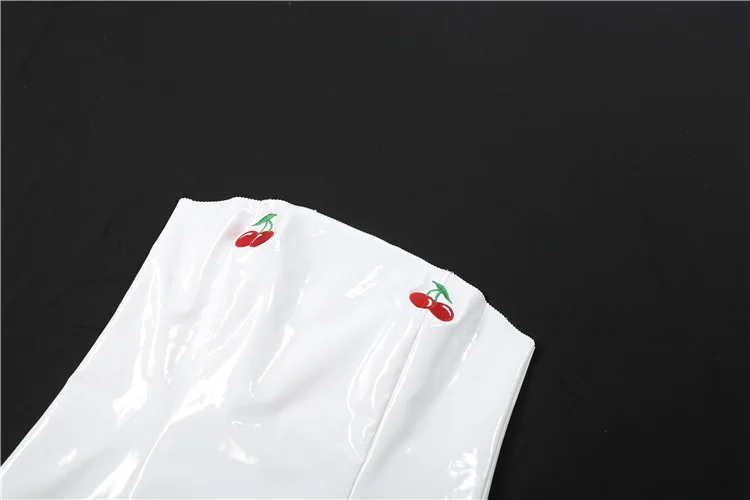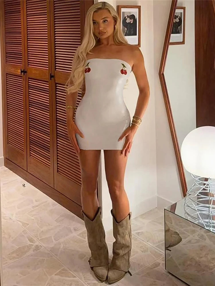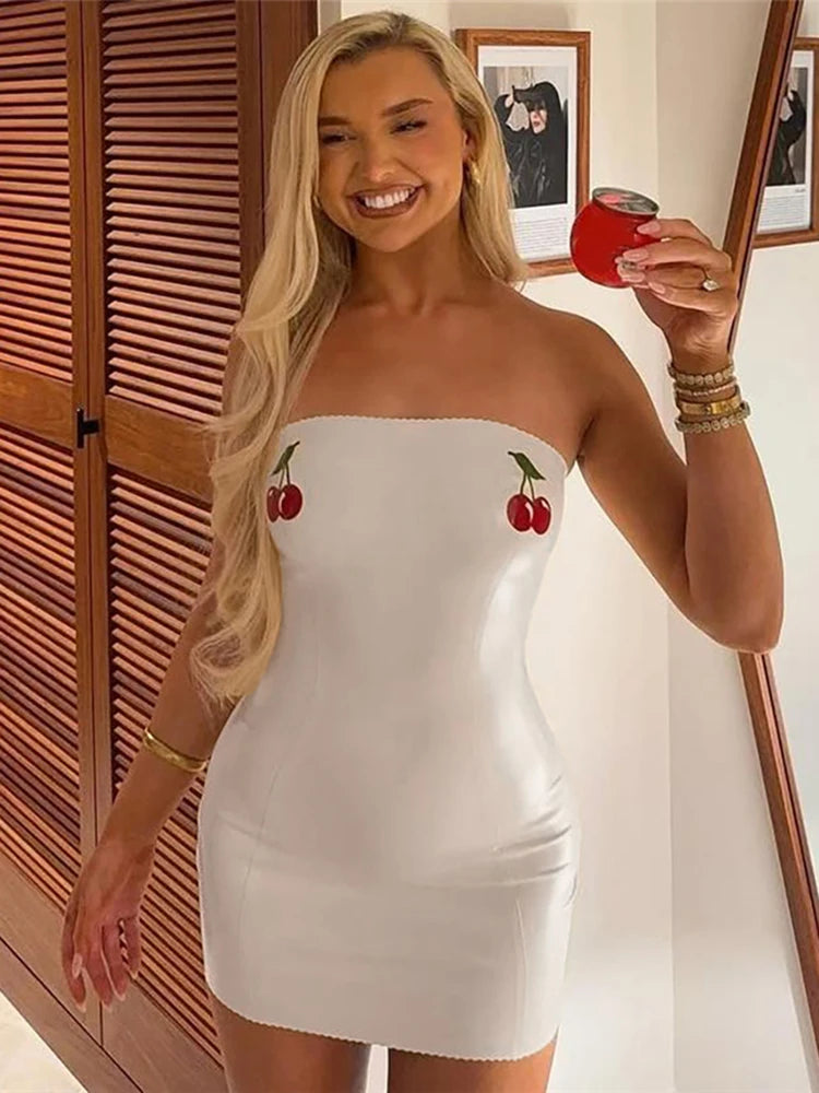 The strapless silhouette highlights the shoulders and neckline, while the minimal cut keeps the focus on the ultra-chic cherry print detailing at the bust — adding a flirty, irresistible touch. A full back zipper ensures easy wear and a secure, body-snatching fit.