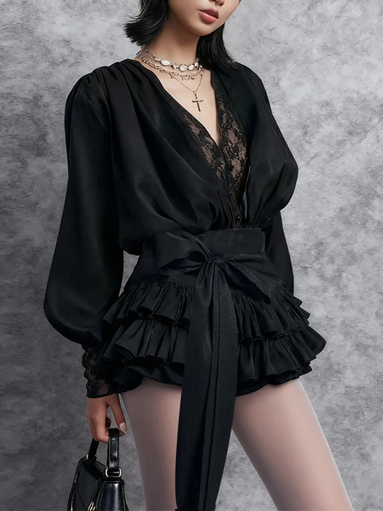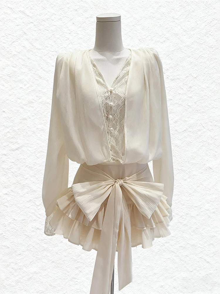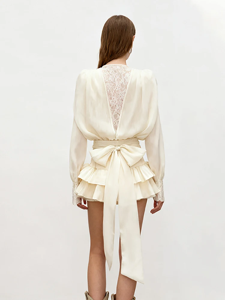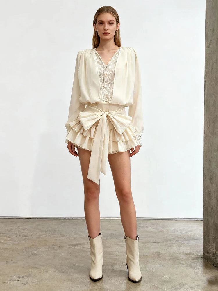 The Trend4us Elegant Lace Bow Layered Mini Dress captures timeless femininity and refined elegance in every detail. Crafted from luxurious chiffon and lace, this mini dress features a romantic plunging lace neckline framed by softly draped long sleeves and intricate lace cuffs.