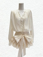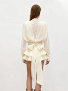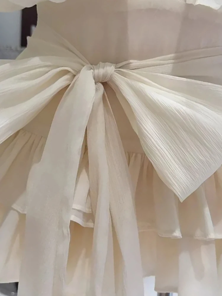 A statement oversized bow cinches the waist, flowing into a tiered ruffled mini skirt that adds graceful movement and volume. The semi-sheer lace back offers a subtle touch of allure while maintaining an elegant silhouette, making it perfect for day-to-night occasions.
