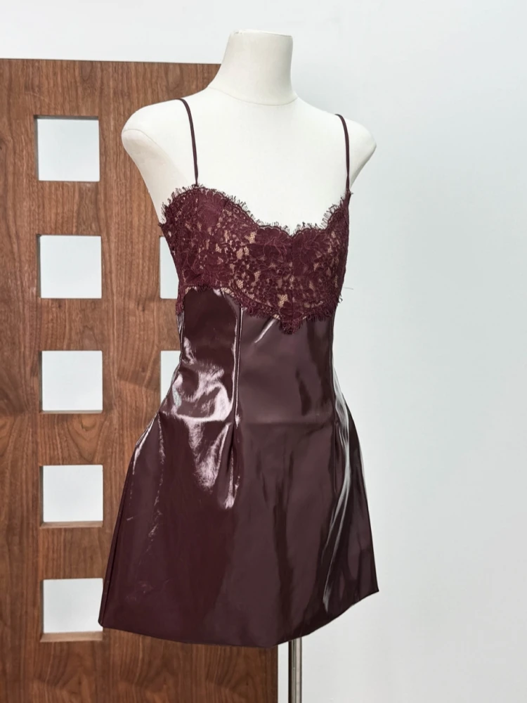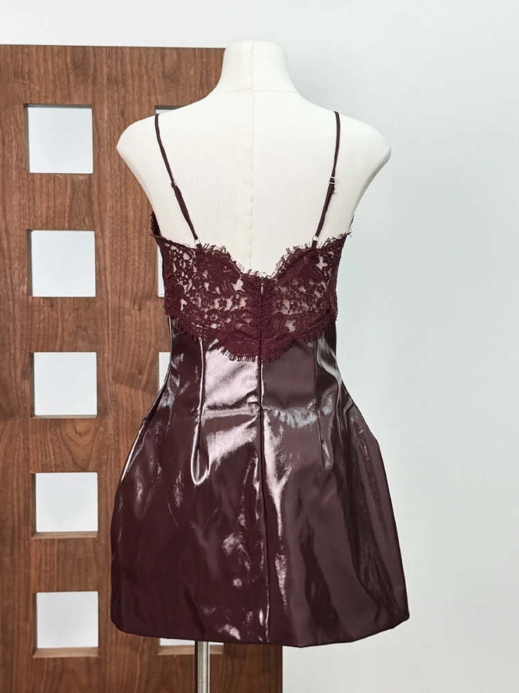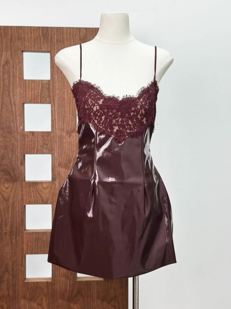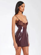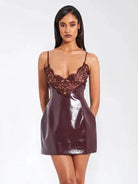Crafted from high-shine faux leather, this sculpting mini dress accentuates your figure while the delicate lace neckline adds a romantic contrast. Adjustable spaghetti straps and a hidden back zipper ensure a sleek, personalized fit.