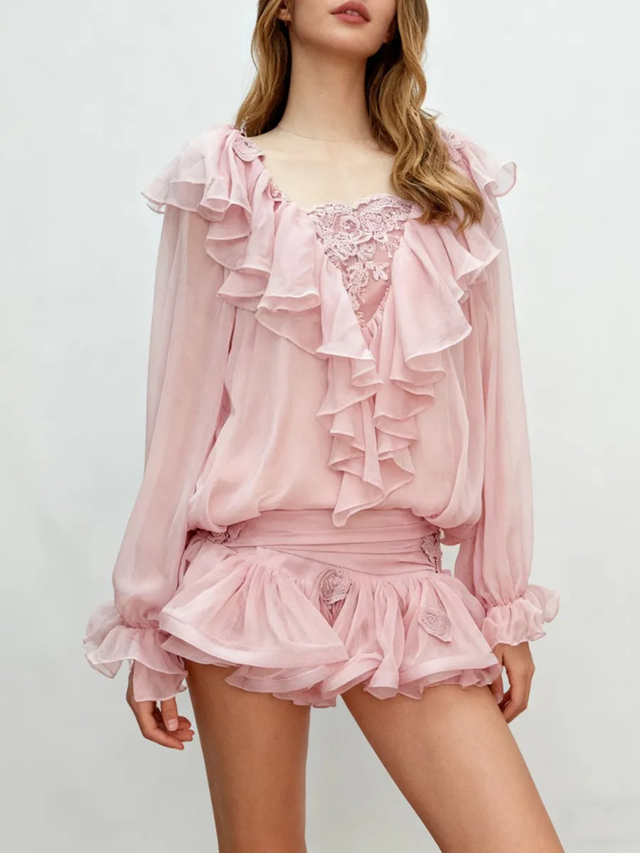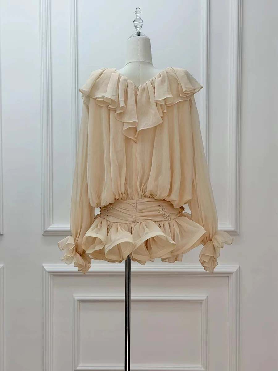 Sleeves: Long, loose chiffon sleeves with ruffle cuffs