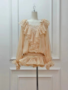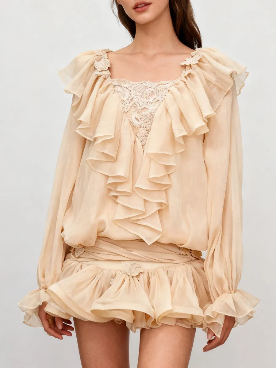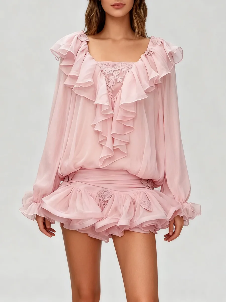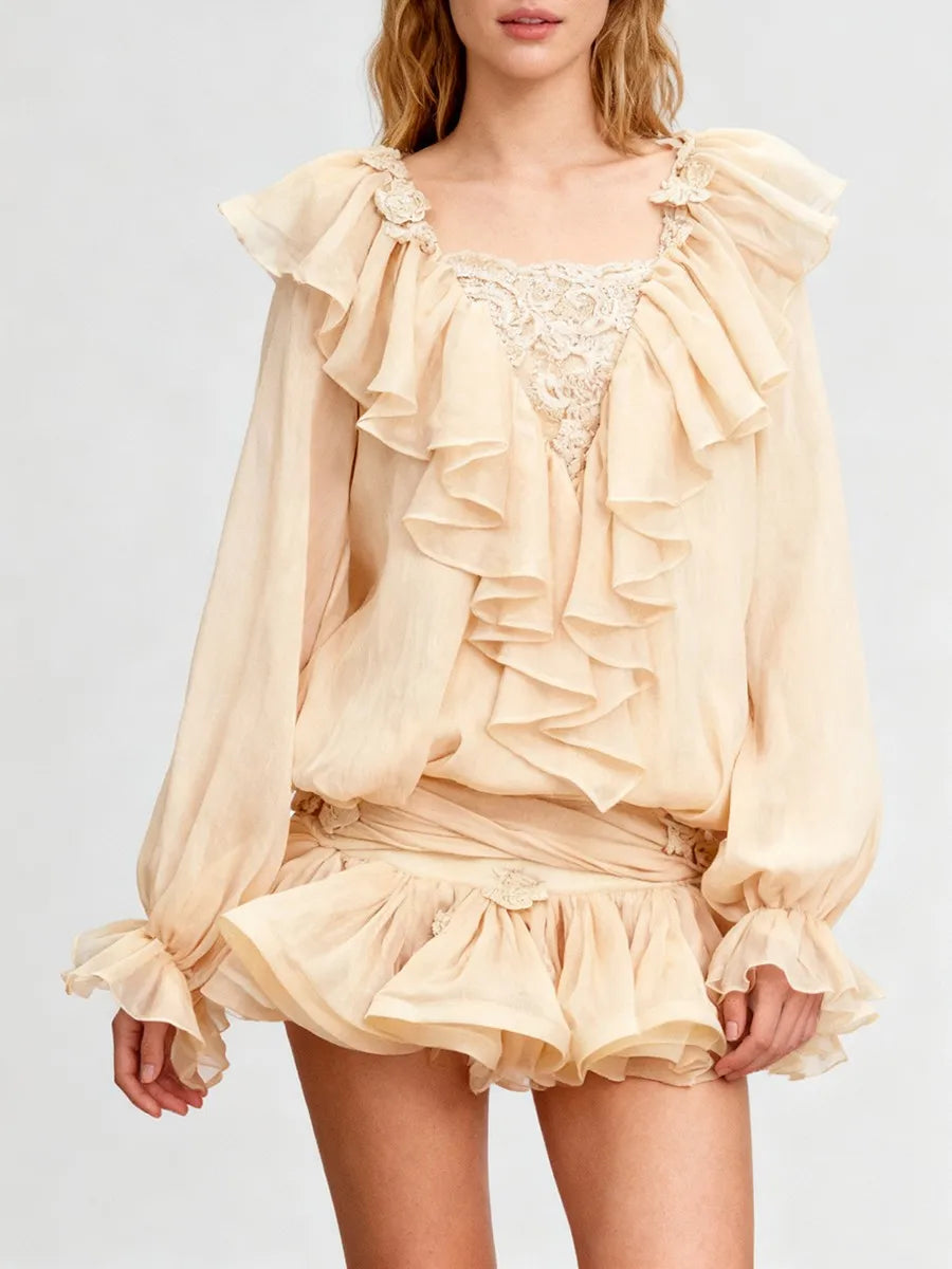 The dress features cascading ruffles along the neckline, sleeves, and hem, creating a layered, ethereal aesthetic. A delicate lace-panelled front adds a touch of vintage romance, while the ruched waistline shapes the body and enhances your natural curves.