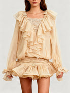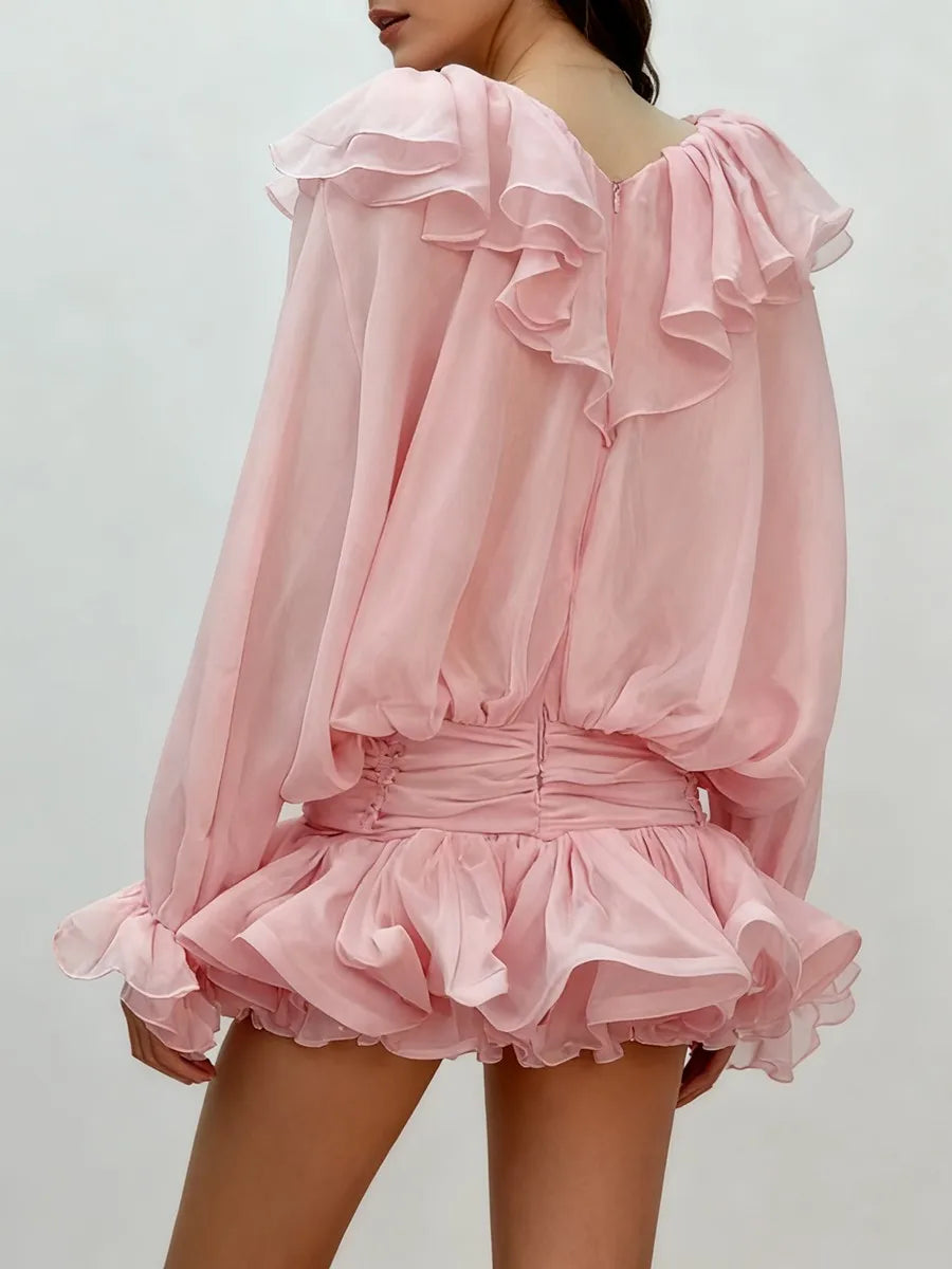 Long, billowy sleeves finish with gathered ruffle cuffs, adding balance and softness to the mini-length skirt. The back zipper ensures an easy fit, and the flowy construction keeps you comfortable while looking stunning from every angle.