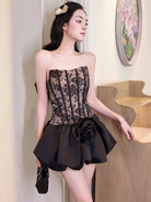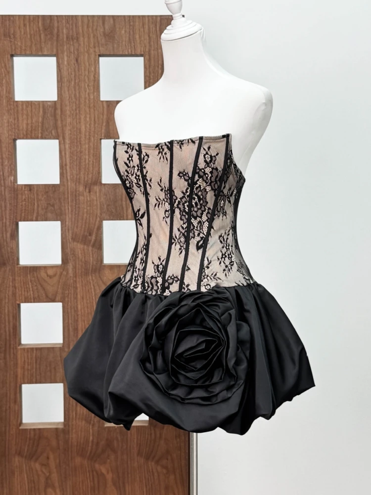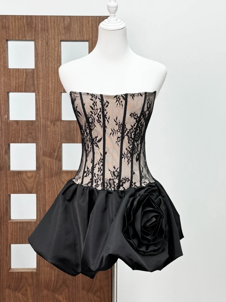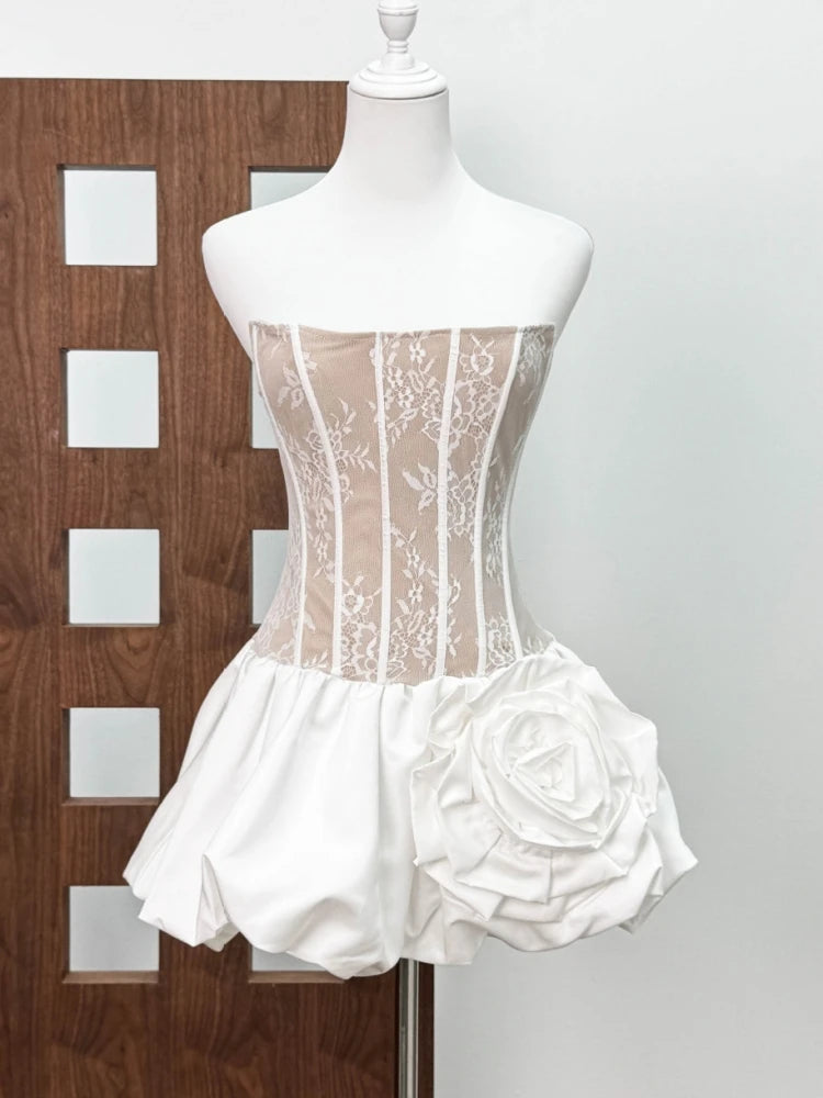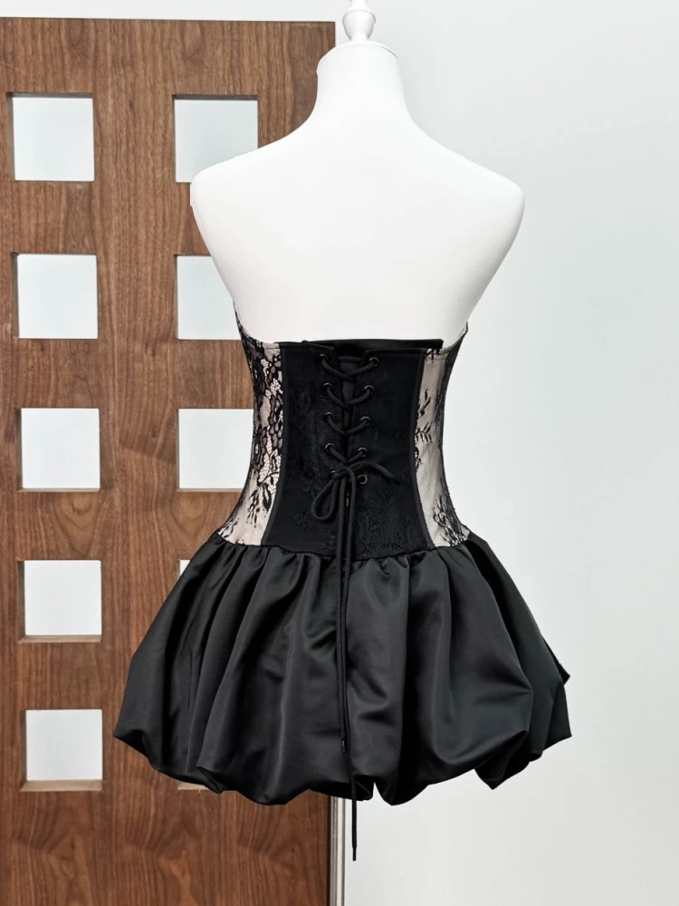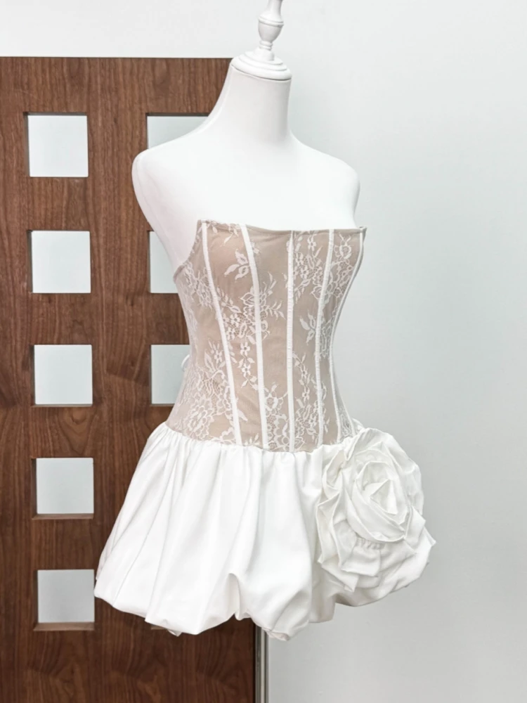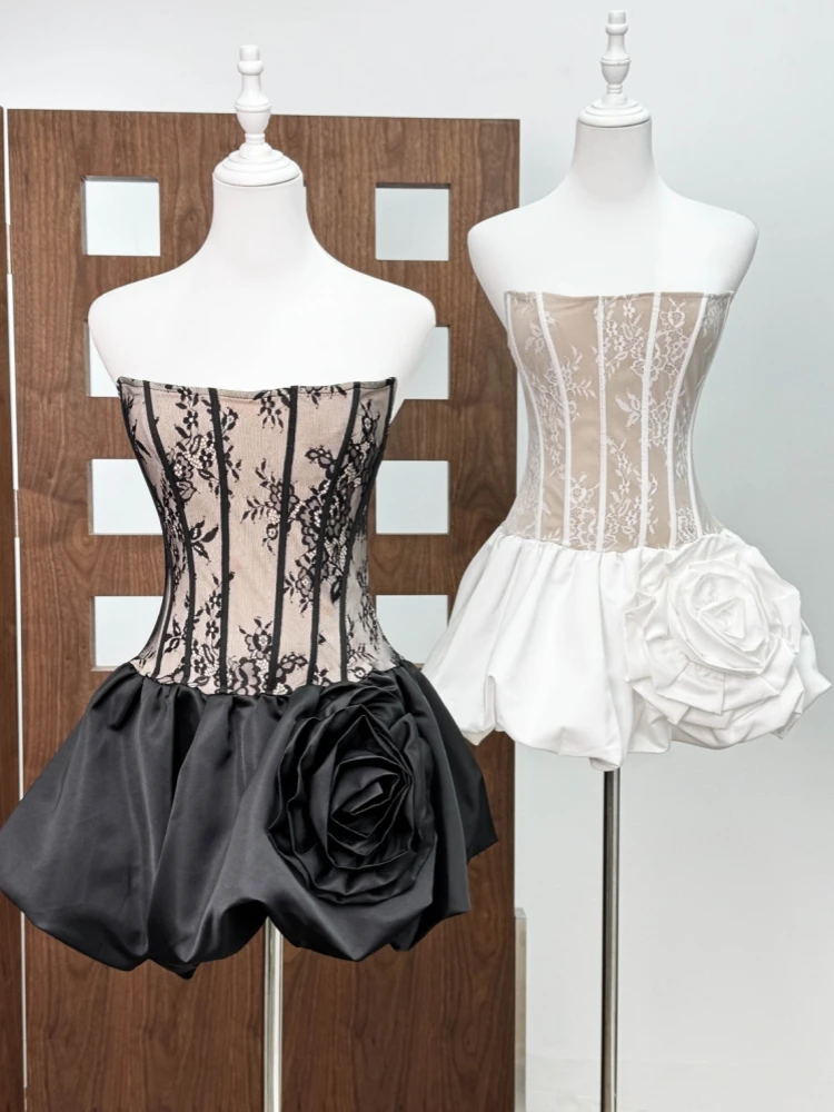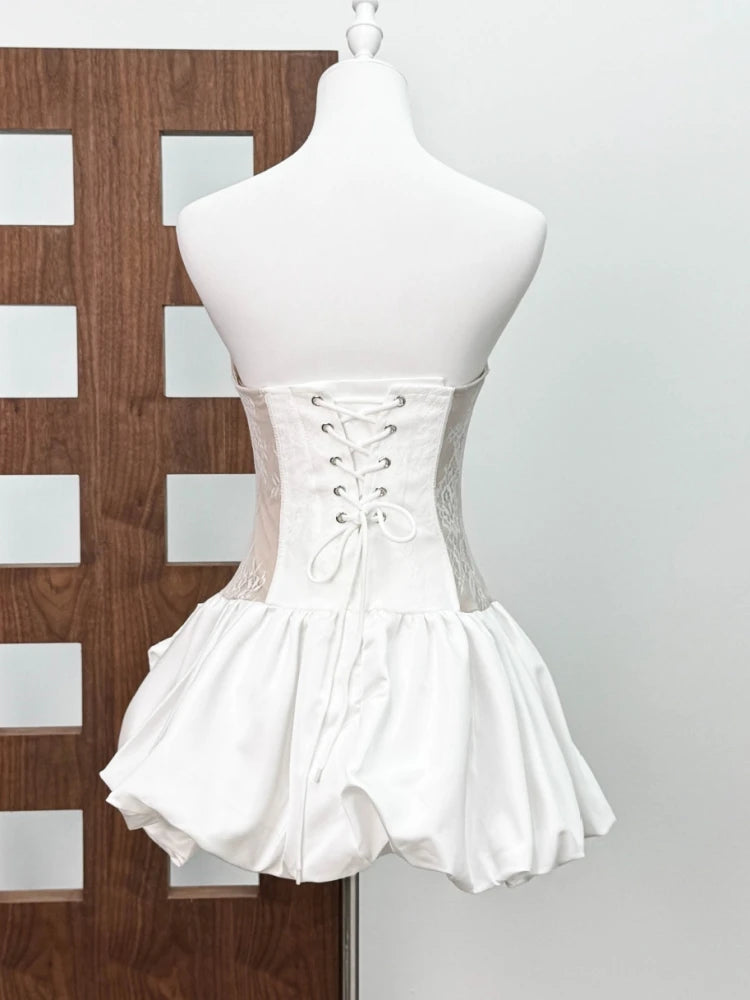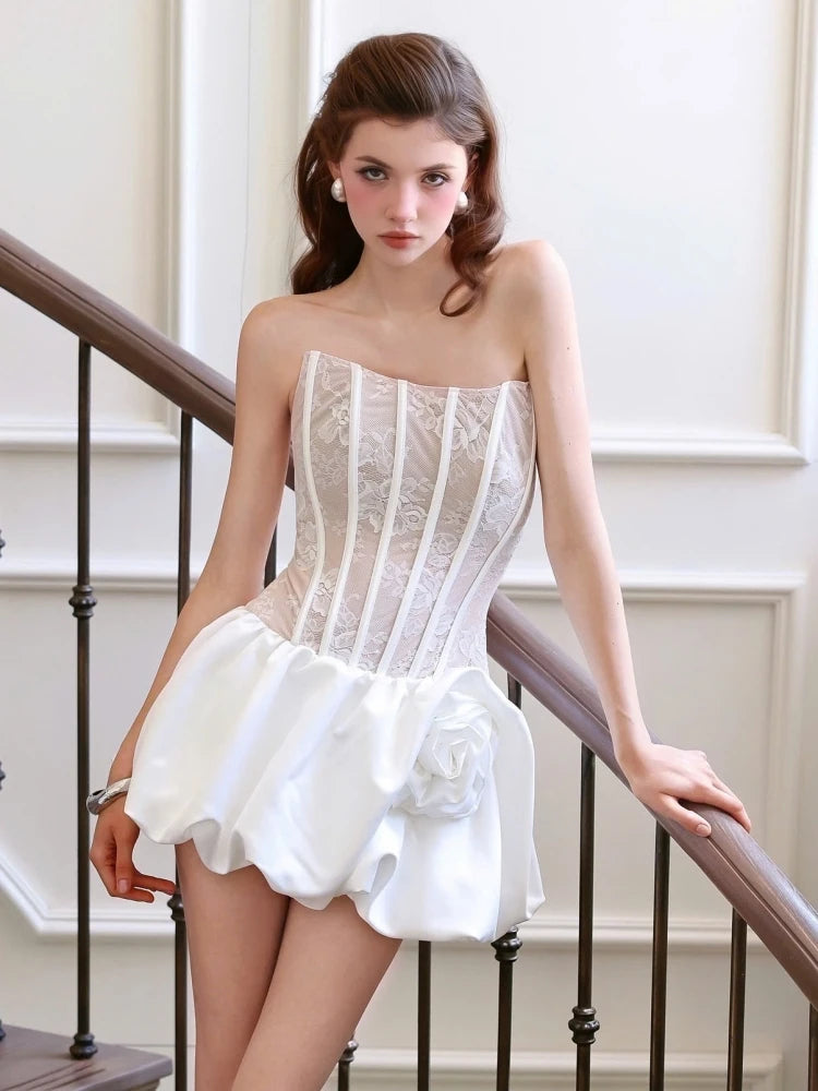 Elevate your elegance with the Trend4us Luxe Strapless Corset Bubble Mini Dress. This enchanting piece blends timeless romance with modern sophistication. Featuring a structured lace corset bodice with boning for a sculpted silhouette, it seamlessly transitions into a voluminous bubble skirt adorned with a statement rosette accent. The back lace-up closure ensures a perfect fit, while the luxurious satin fabric adds a soft sheen ideal for parties, galas, or special evening events. Available in both classic white and bold black colorways for your perfect statement look.