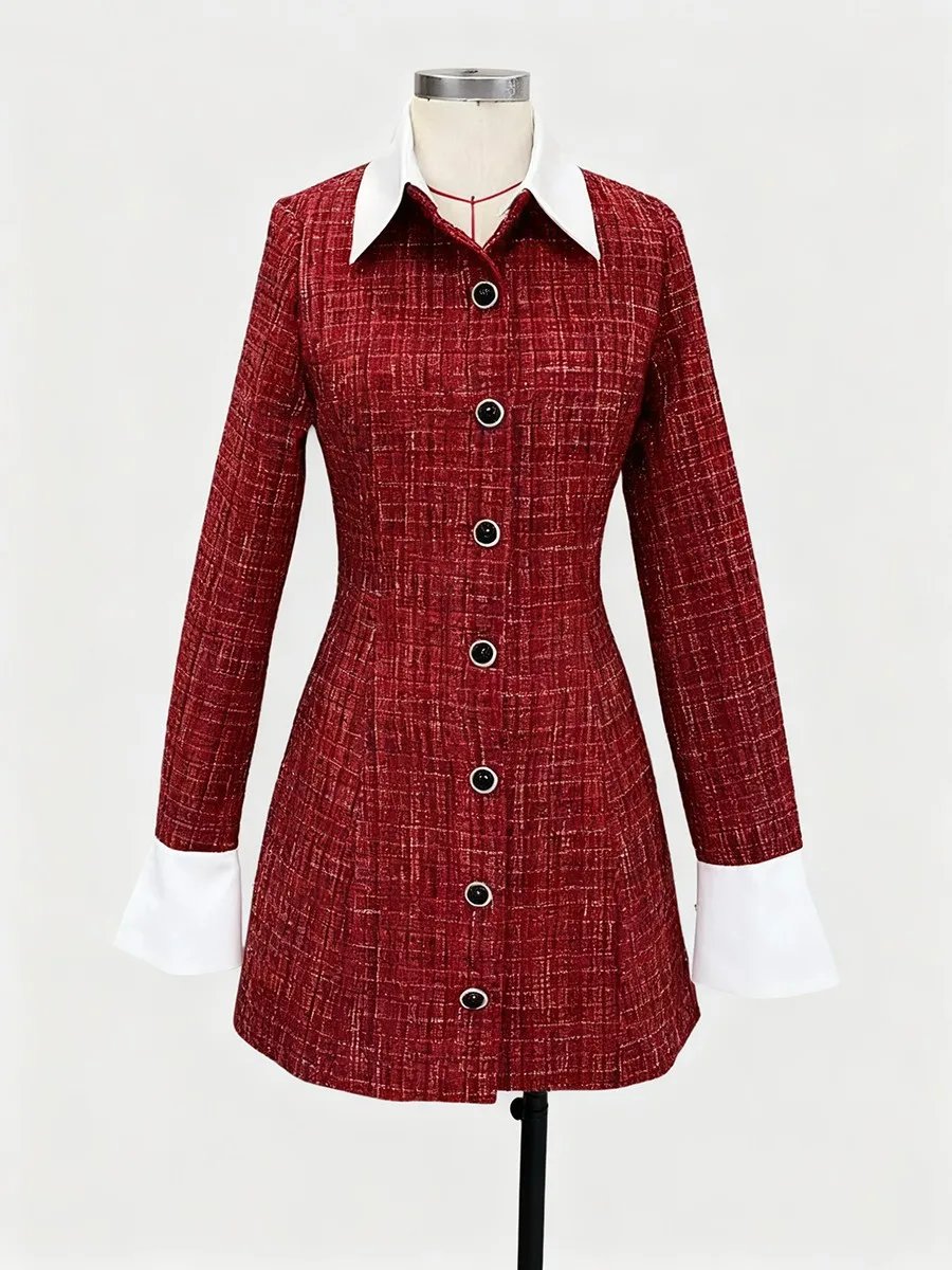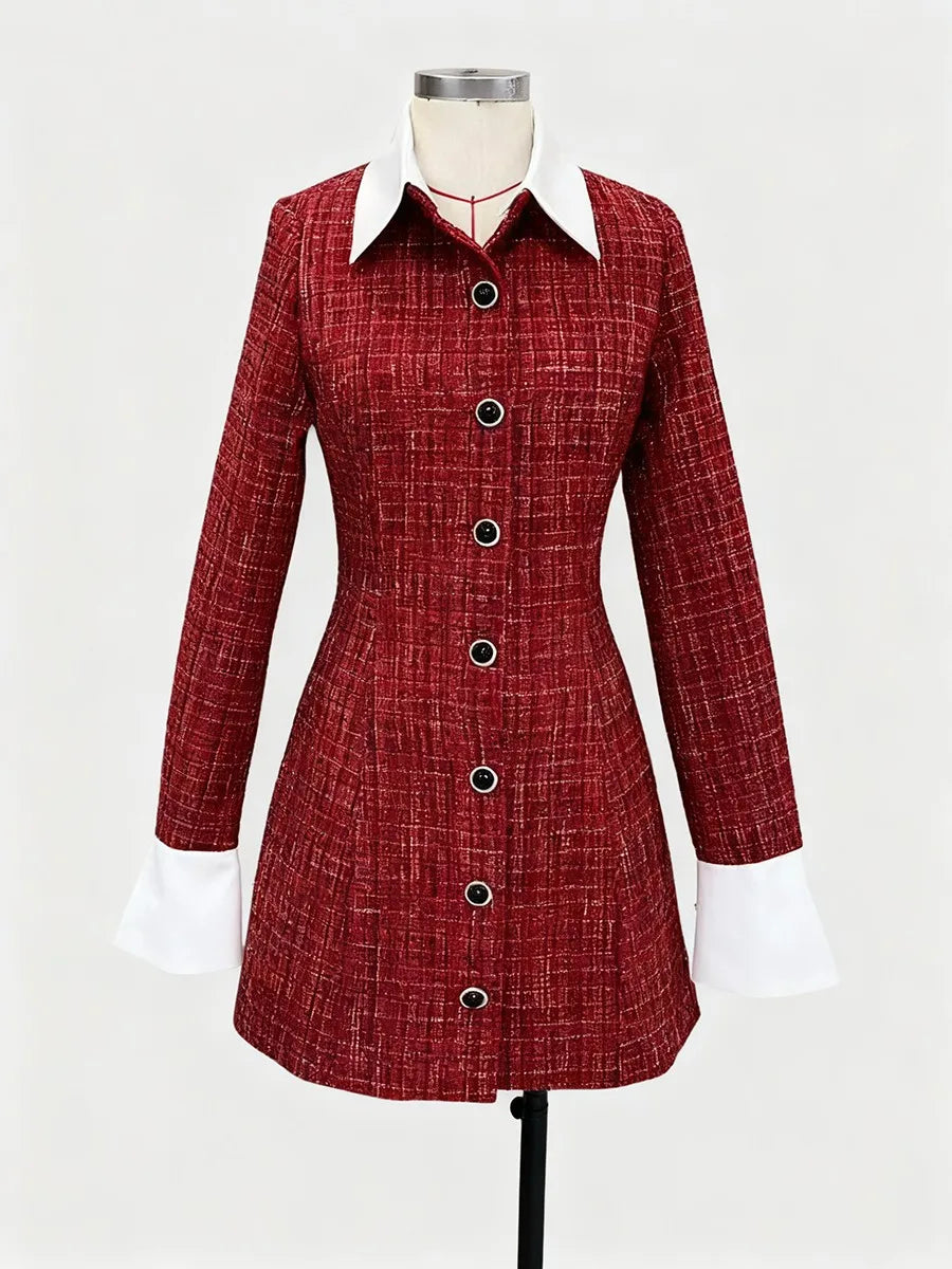 Featuring a striking white contrast collar and matching wide cuffs, this piece brings a bold, editorial-inspired twist to classic tailoring. The shapely waistline and A-line mini hem enhance the figure, creating a beautifully contoured and feminine profile. Decorative statement buttons run down the front, adding depth, structure, and luxury detailing.