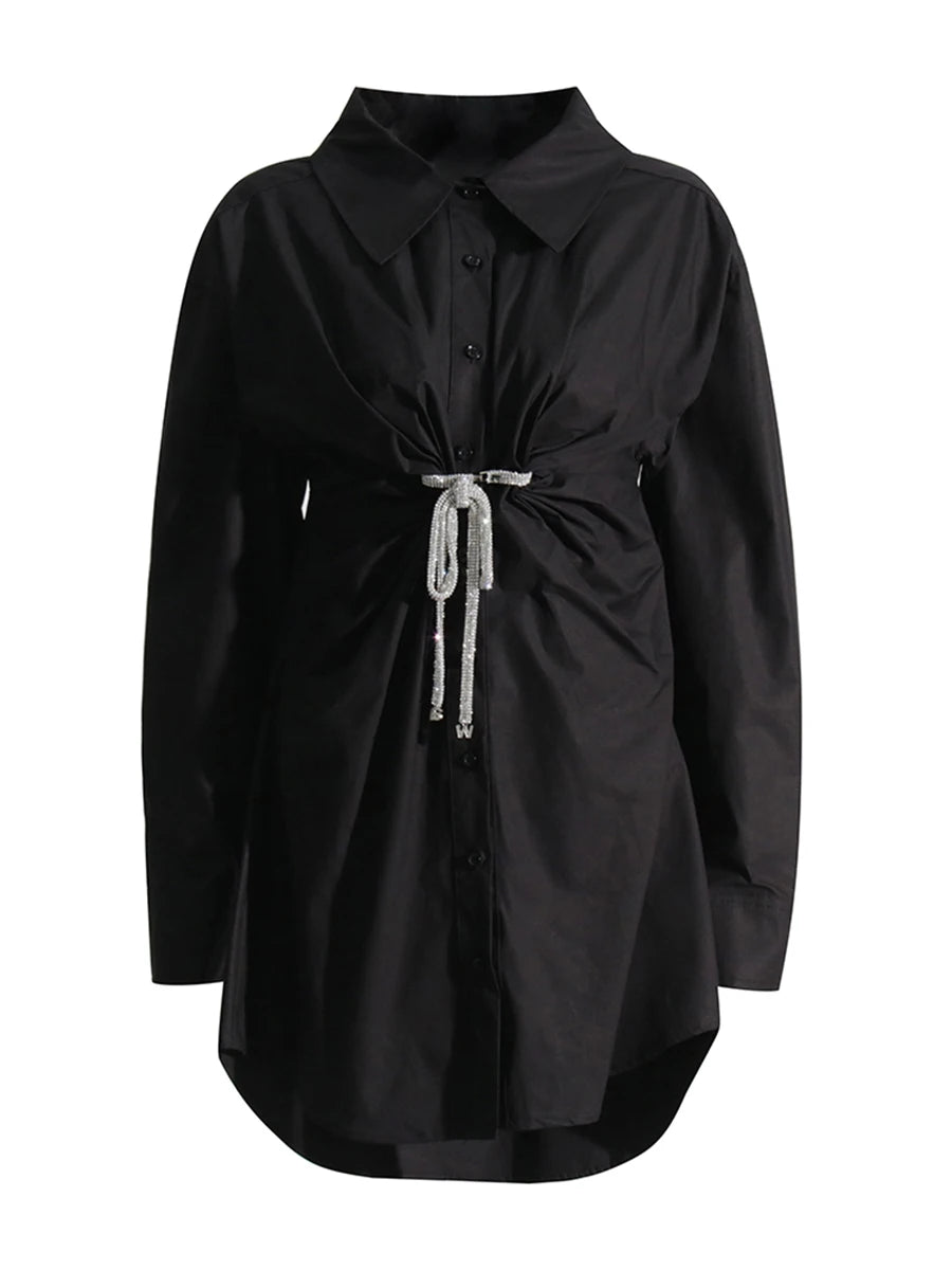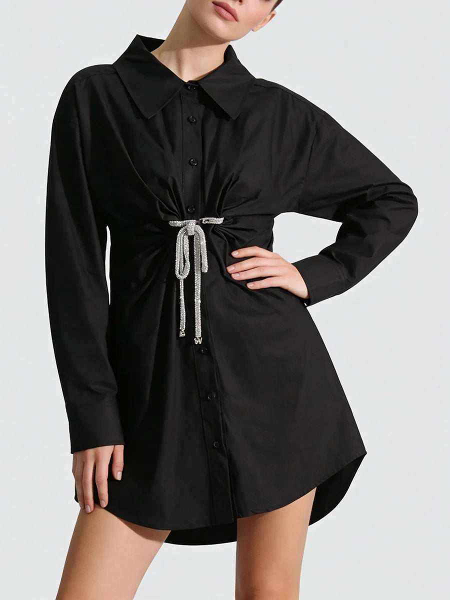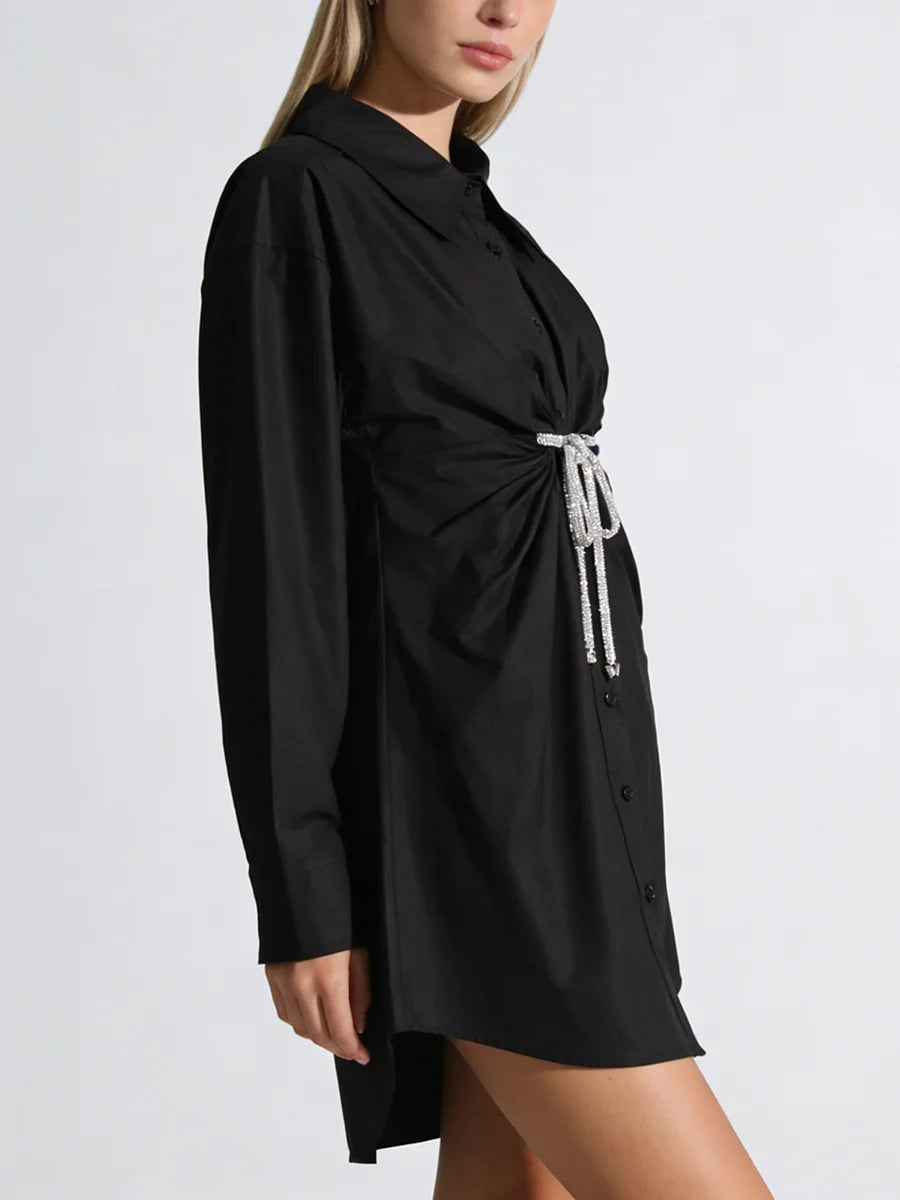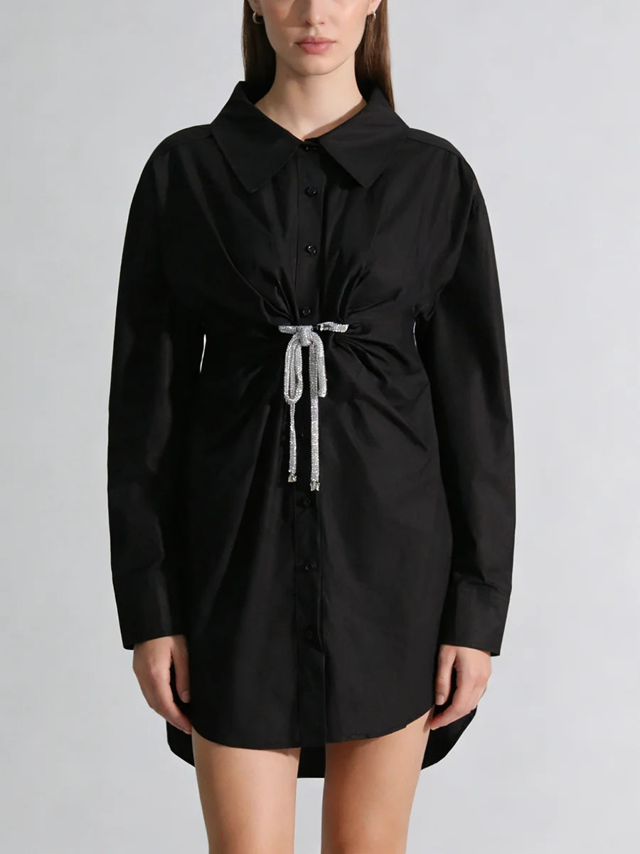 - Crystal Bow Detail: Delicate crystal embellishments add a touch of sparkle and feminine charm to the classic shirt dress silhouette