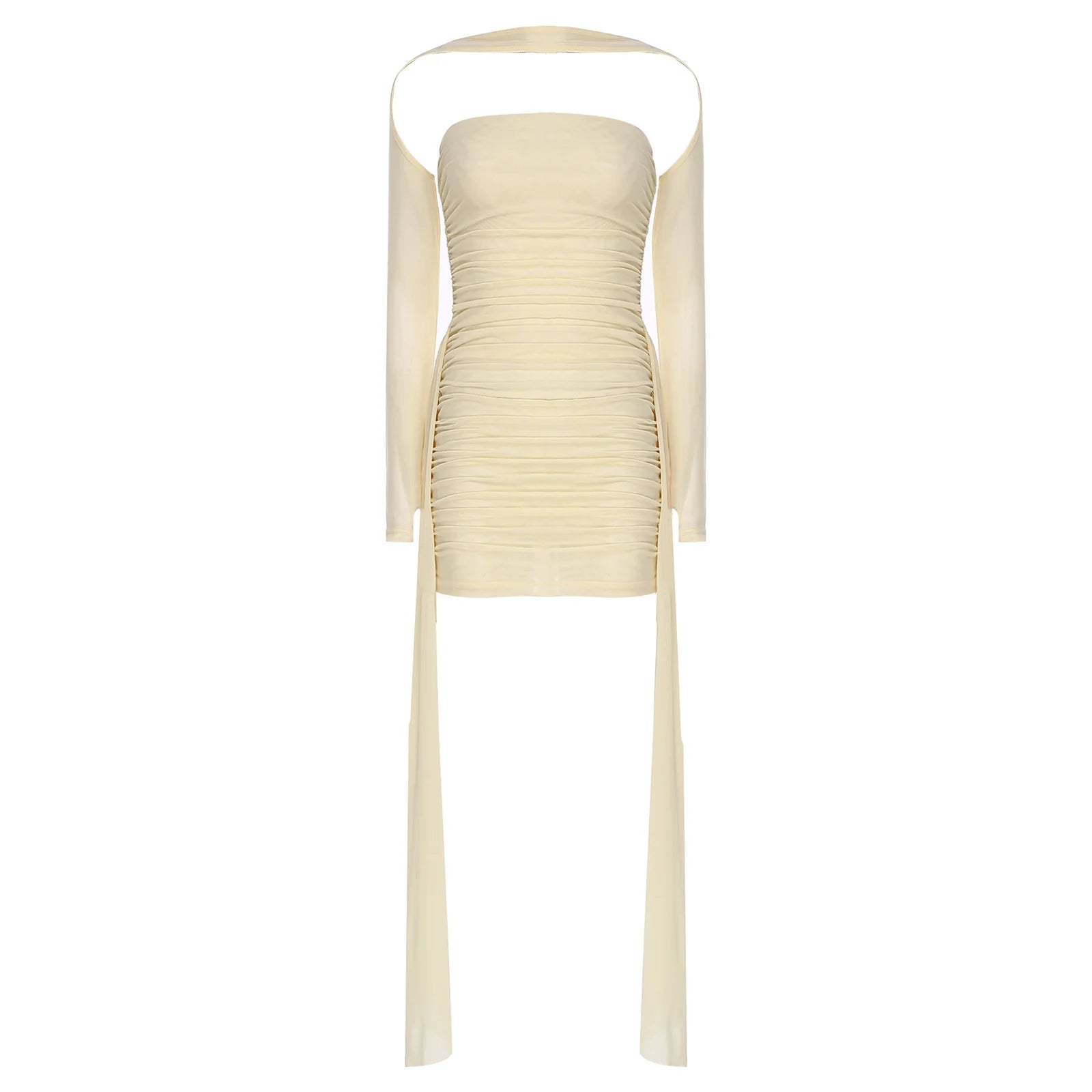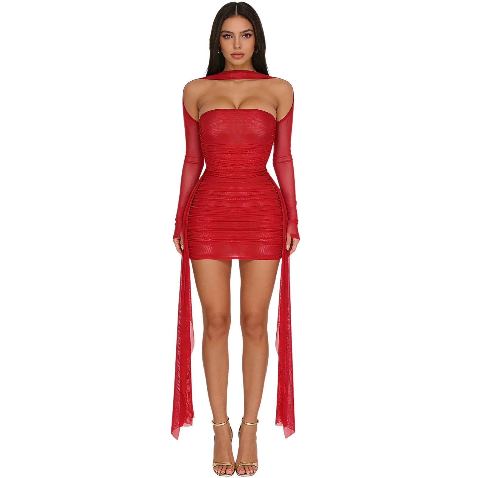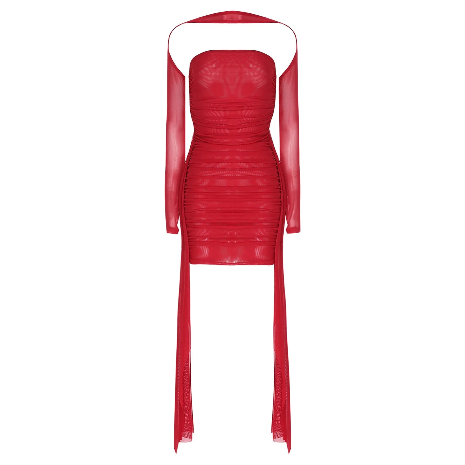 Make a bold statement with this captivating mini dress that artfully blends allure and elegance. The strategic ruching creates a sculpted, body-contouring effect that flatters your curves, while the delicate sheer mesh panels add a touch of daring sophistication that's impossible to ignore.