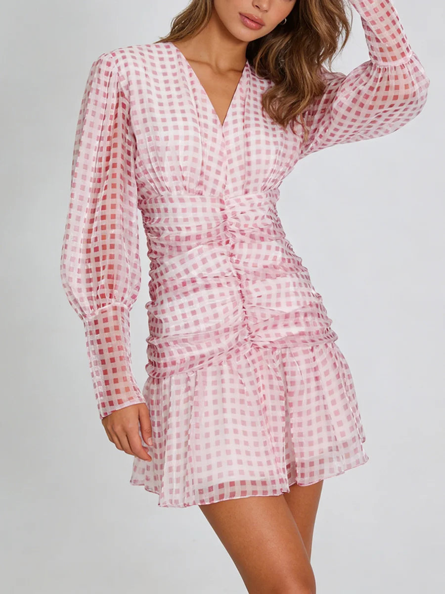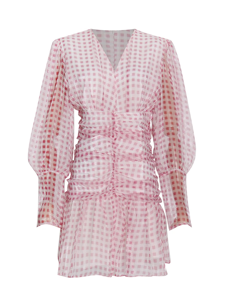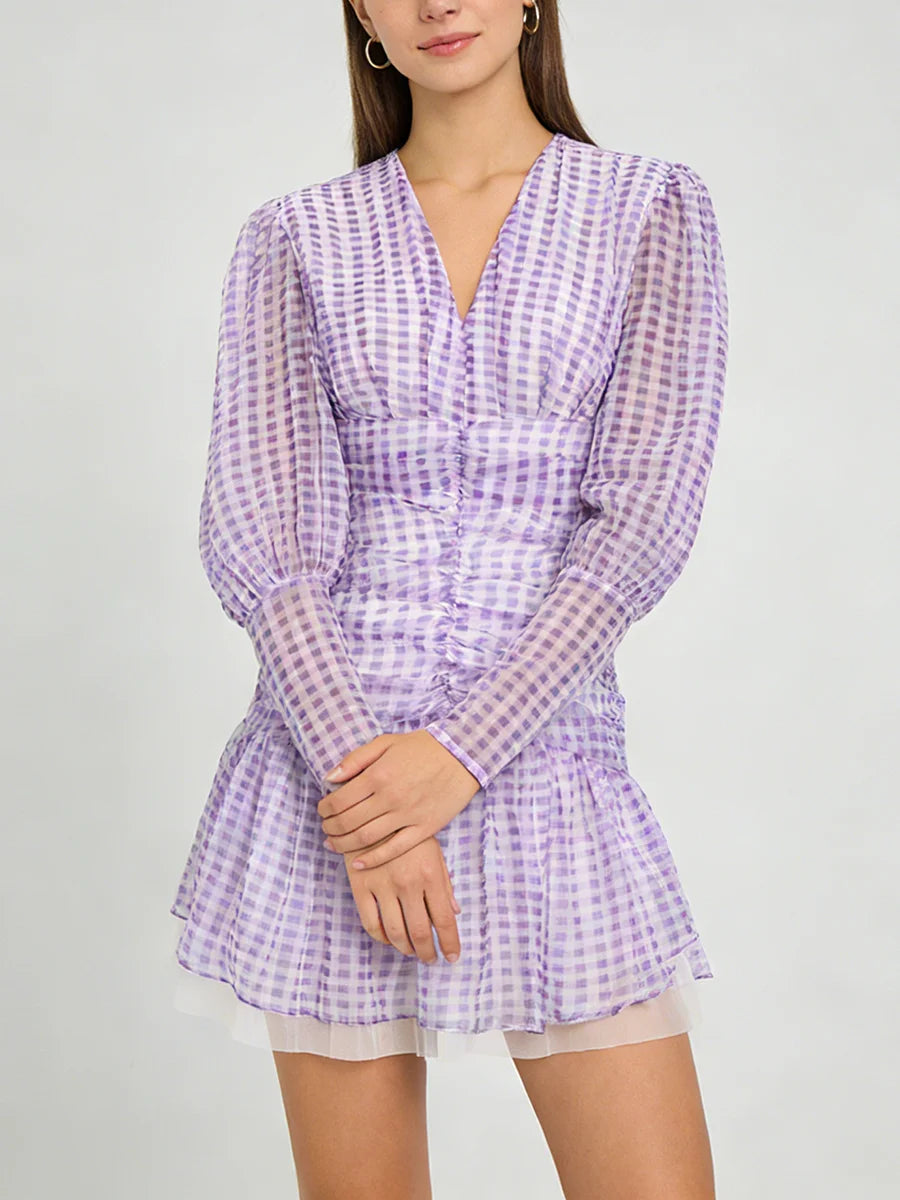 The elegant V-neckline elongates your frame, while the ruched detailing cinches at all the right places for a figure-enhancing fit. Crafted from premium polyester with a sheer plaid pattern, this dress offers the perfect blend of coverage and allure for confident, contemporary style.