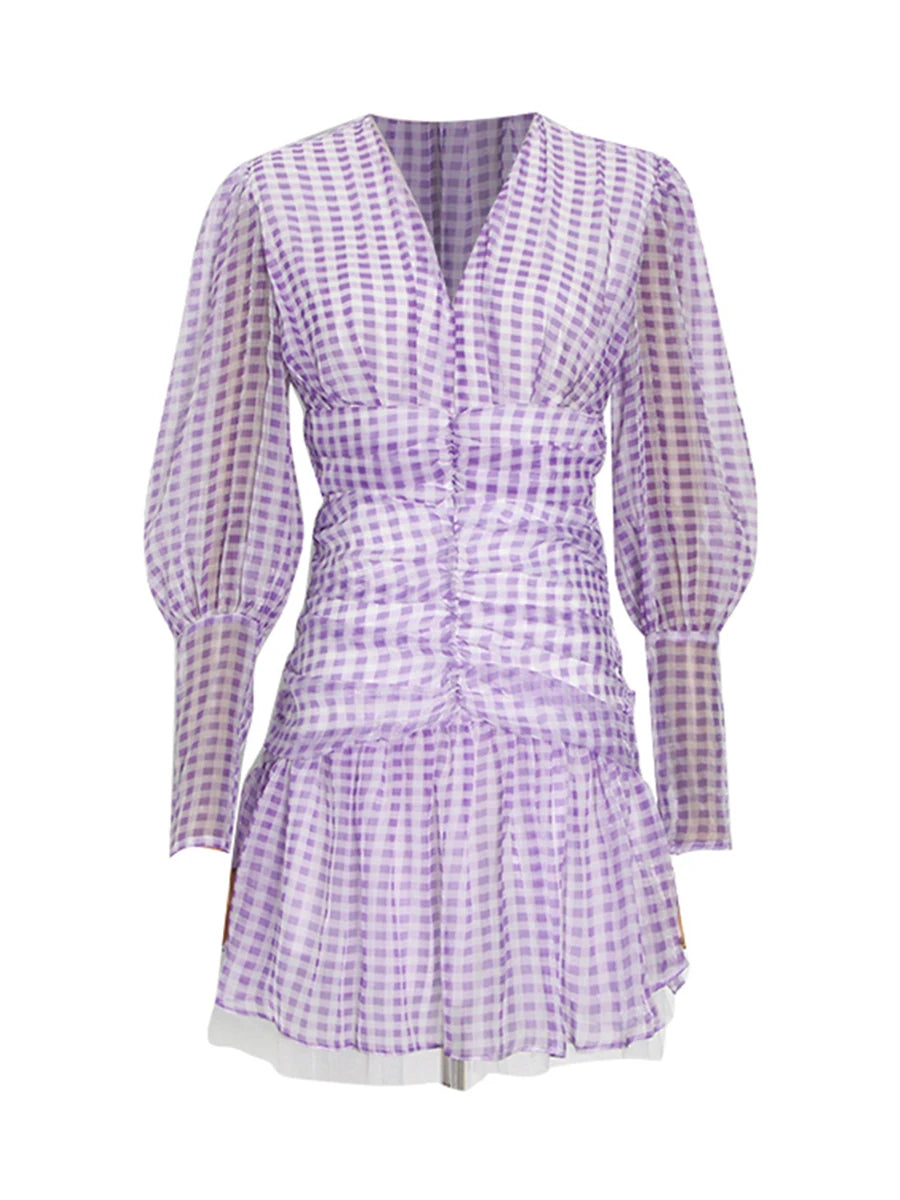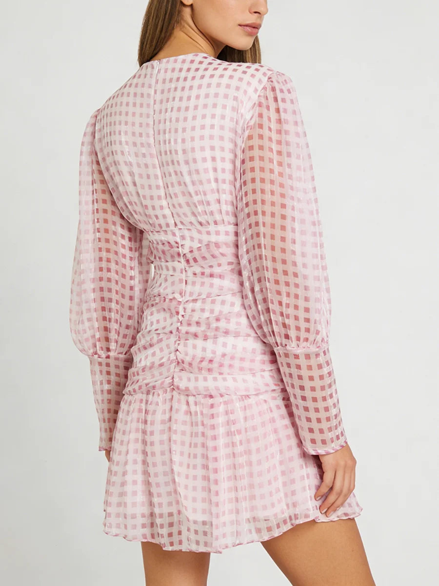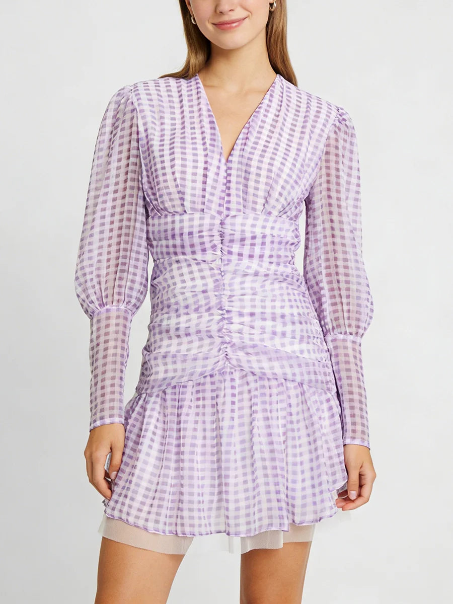 The elegant V-neckline elongates your frame, while the ruched detailing cinches at all the right places for a figure-enhancing fit. Crafted from premium polyester with a sheer plaid pattern, this dress offers the perfect blend of coverage and allure for confident, contemporary style.