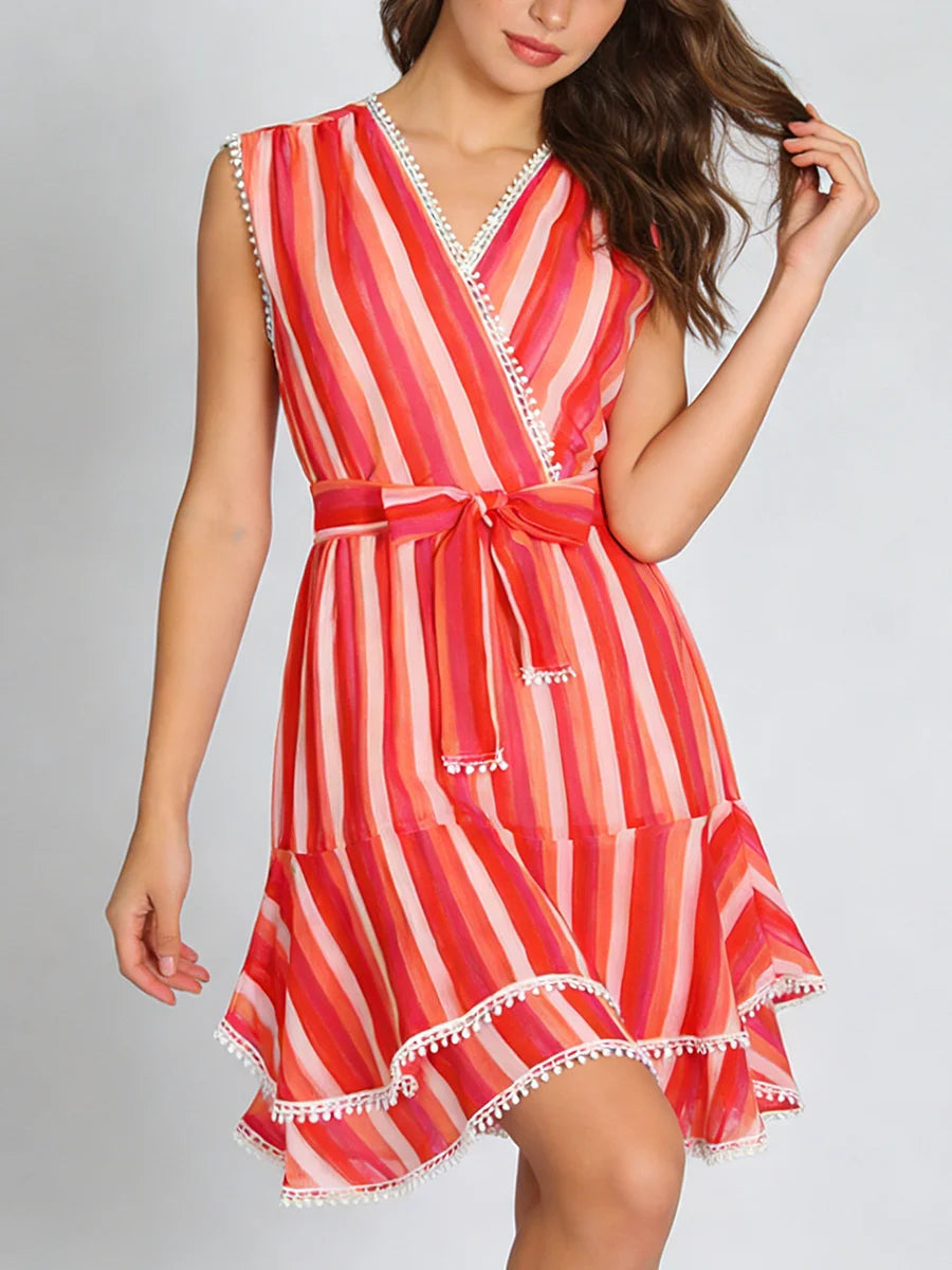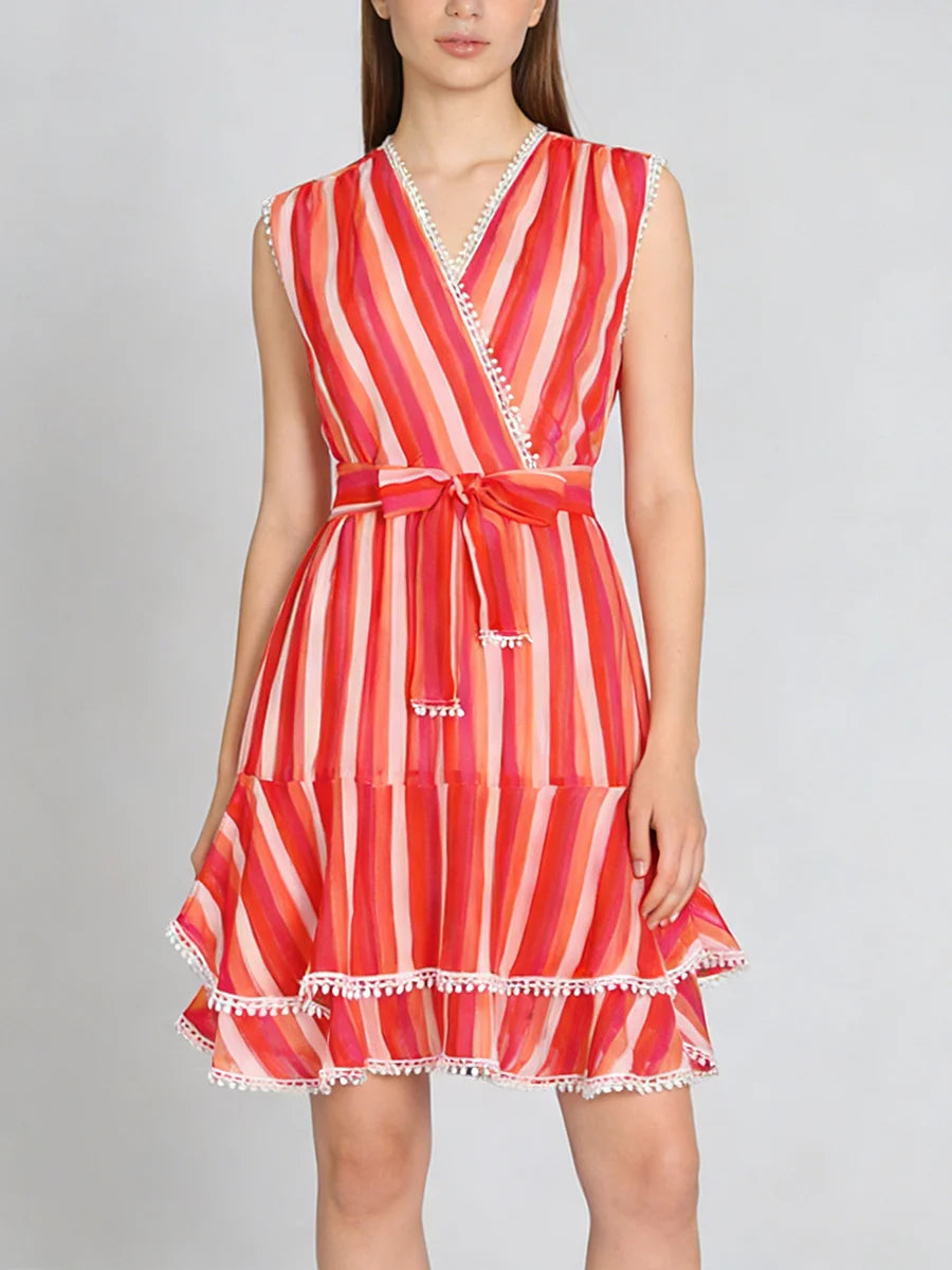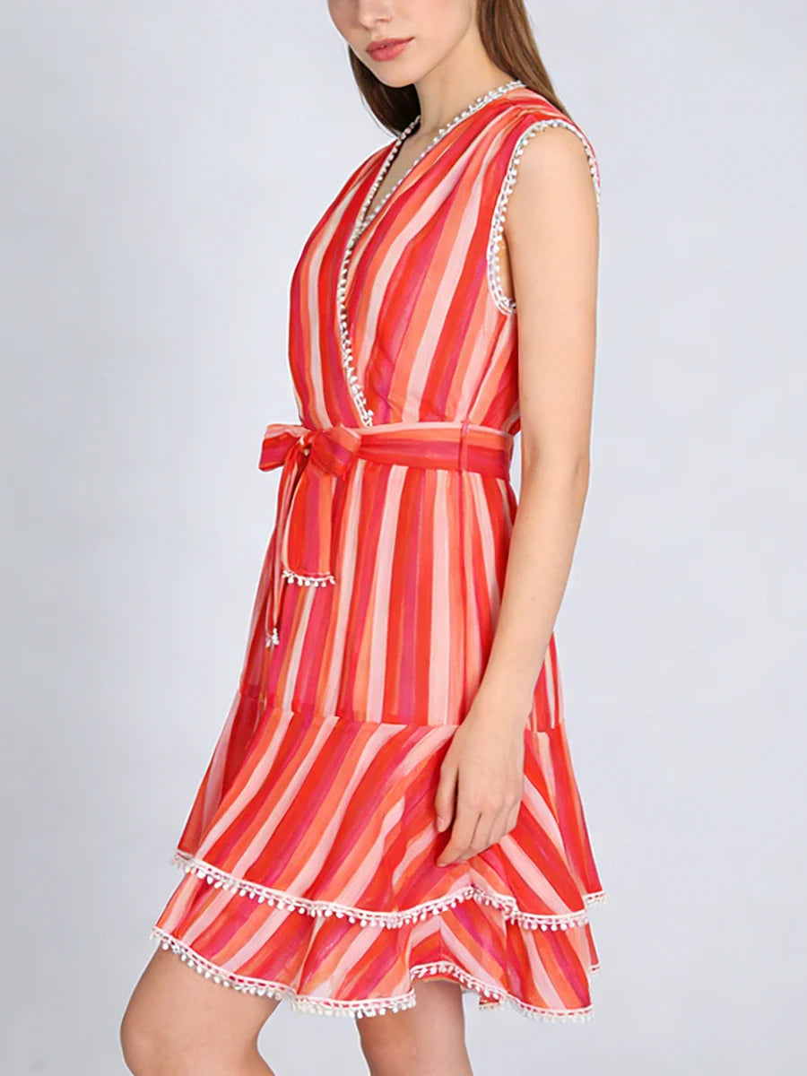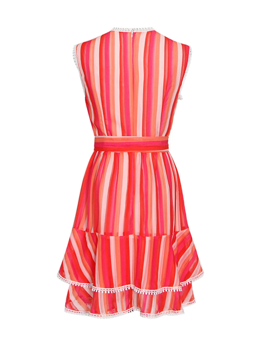 Embrace effortless charm in this playful striped mini dress. Designed with delicate lace trim and feminine ruffle details, this piece is perfect for the woman who loves casual elegance with a romantic touch.
