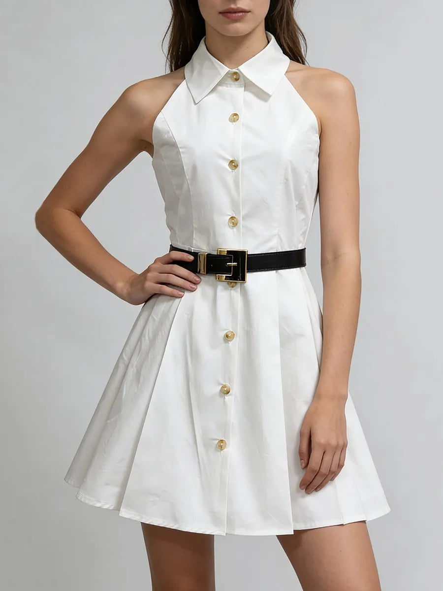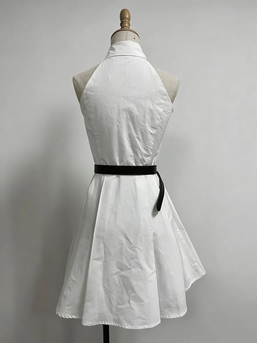This versatile mini dress transitions seamlessly from office to evening. The structured collar and button-front detailing create a sophisticated foundation, while the belted waist adds definition and polish. Pair with pointed-toe pumps and a blazer for professional settings, or style with ankle boots and statement jewelry for after-work events. The sleeveless design makes it perfect for layering with turtlenecks or blouses in cooler weather.