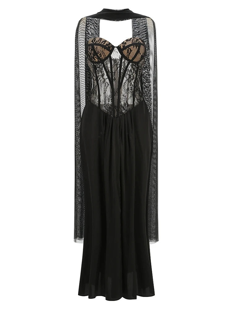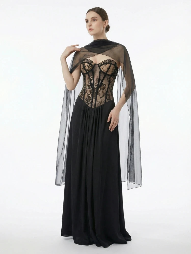 Trend4us Strapless Sheer Lace Corset Chiffon Shawl Maxi Gown
