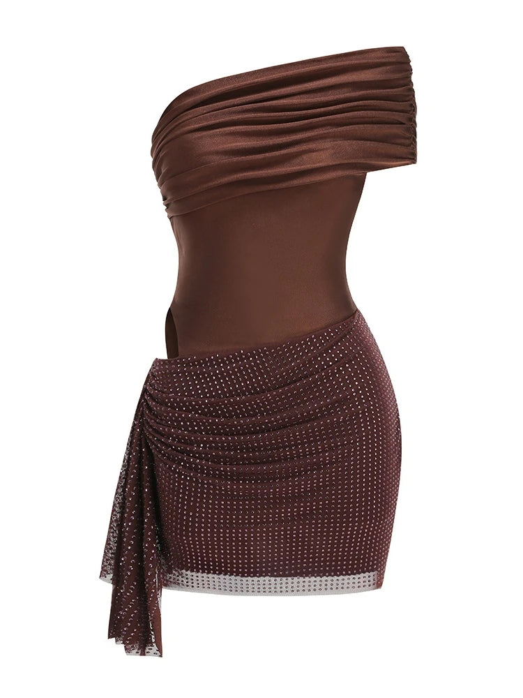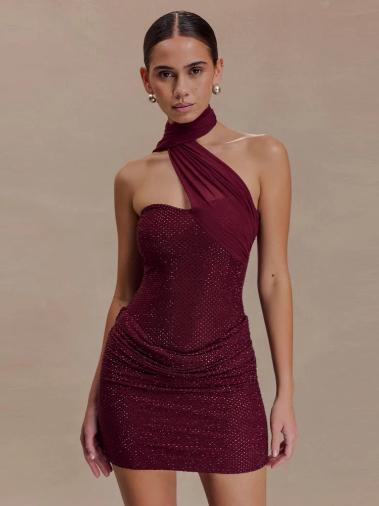 Trend4us Luxe One-Shoulder Sheer Crystal Draped Mini Dress