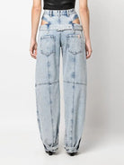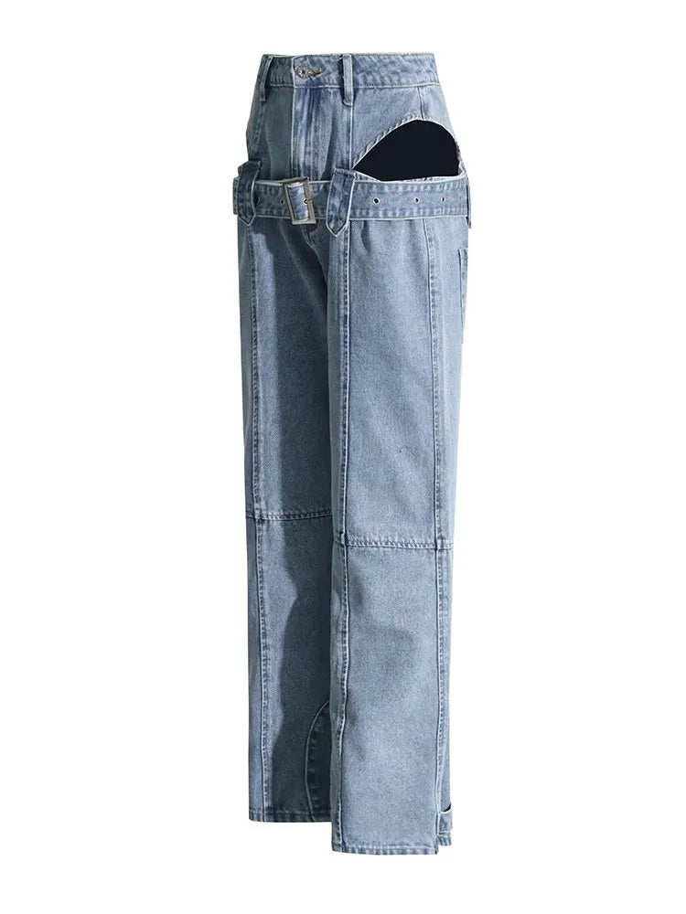 Make a fearless fashion statement with these avant-garde wide-leg jeans featuring bold cutout detailing and adjustable belt accents. The high-waisted silhouette and loose fit create a relaxed yet striking look, while the unique cutout design sets these jeans apart as a true conversation piece.