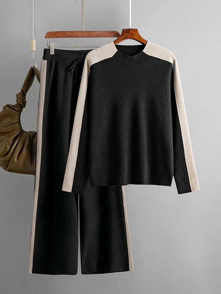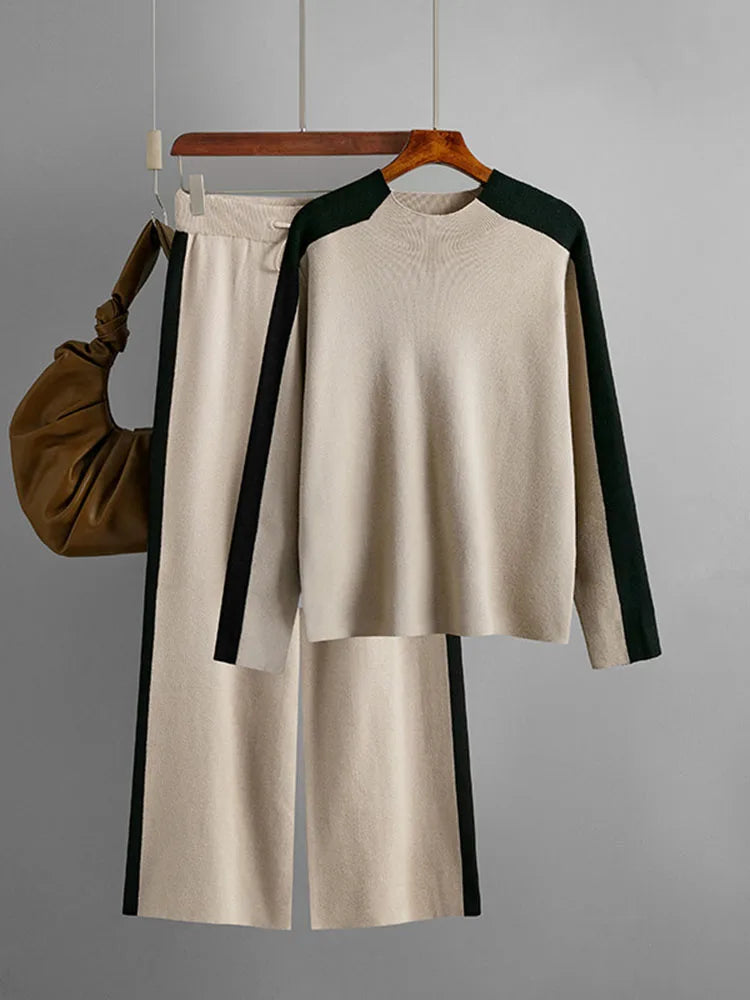 This stylish two-piece ensemble features a knit top with distinctive contrast trim detailing paired with high-waisted wide-leg pants, creating a sophisticated yet comfortable look. The pullover top with regular sleeves offers cozy warmth, while the elastic-waist wide-leg pants provide all-day comfort with a flattering silhouette. Crafted from a cotton, acrylic, spandex, and polyester blend with medium stretch, this casual set is perfect for lounging at home, running errands, or elevated everyday wear.