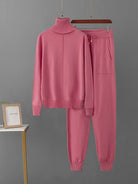 This coordinated two-piece ensemble features a classic turtleneck knit sweater paired with comfortable jogger pants, creating the perfect balance of warmth and ease. The pullover sweater with full-length sleeves offers cozy texture and coverage, while the elastic-waist joggers provide all-day comfort with a relaxed fit. Crafted from a cotton-polyester blend with medium stretch, this casual set is perfect for lounging at home, running errands, or casual outings.
