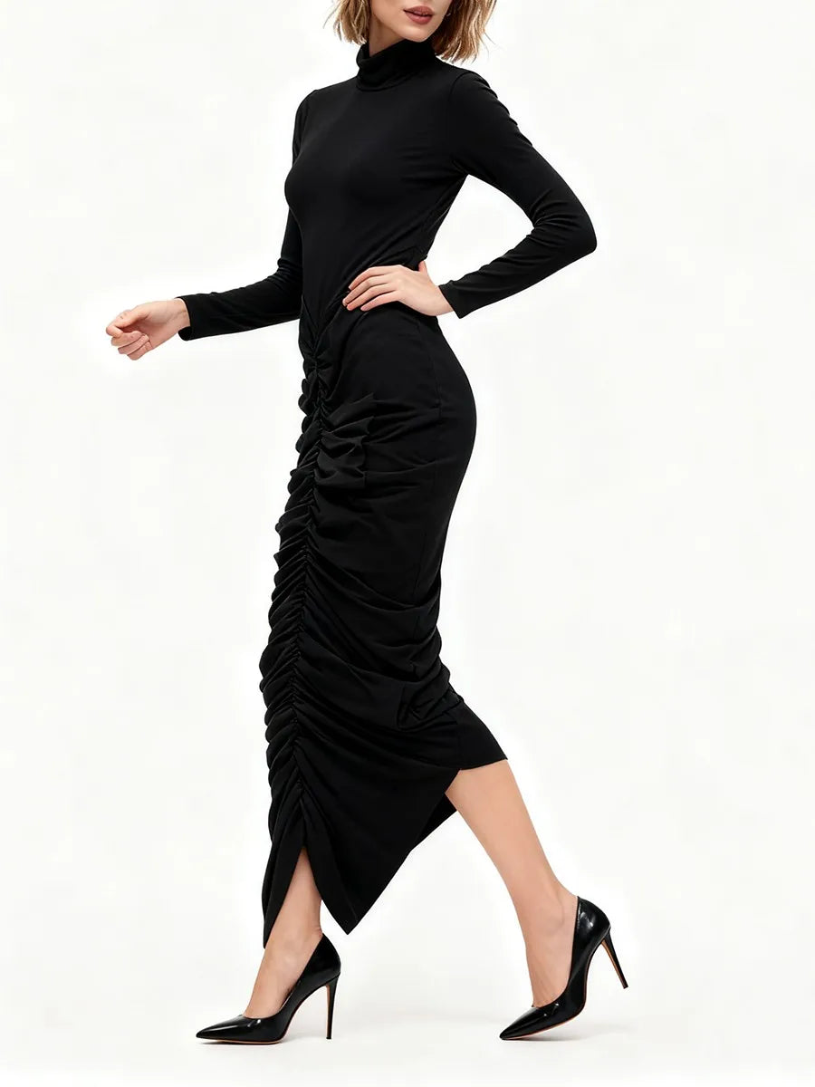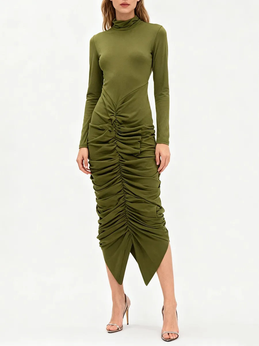 Elegant High-Neck Ruched Asymmetrical Midi Dress