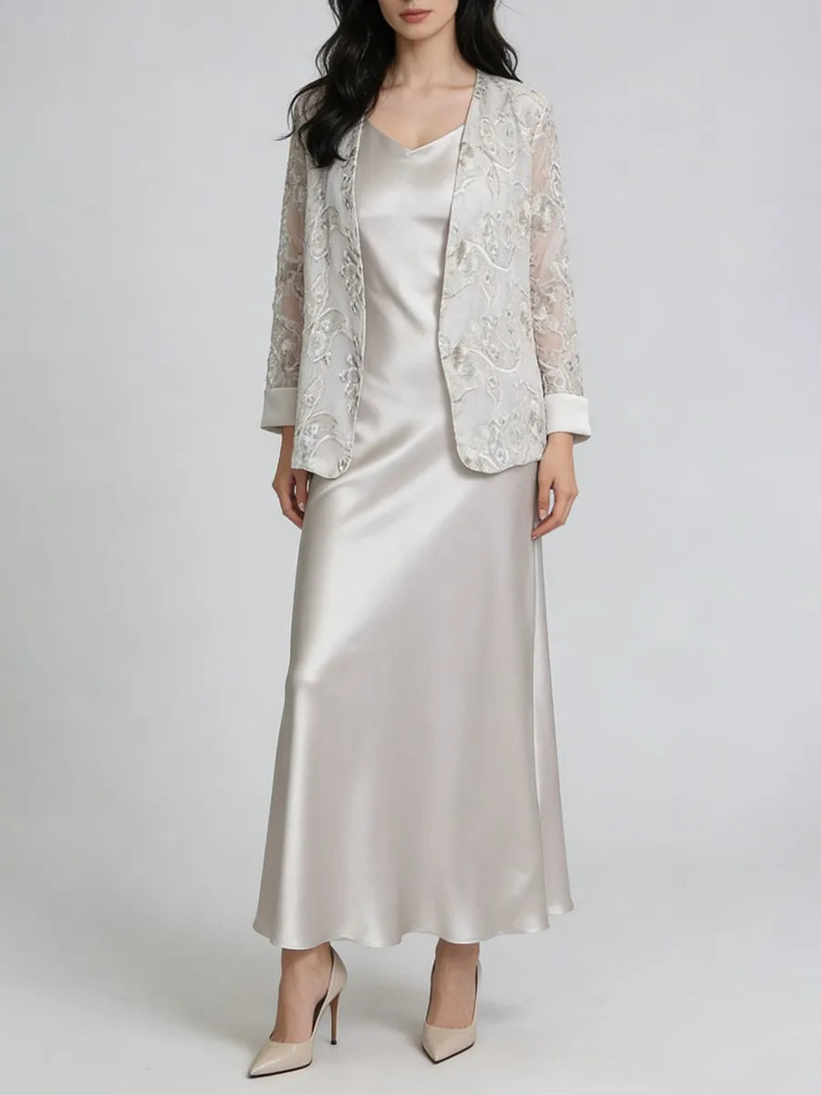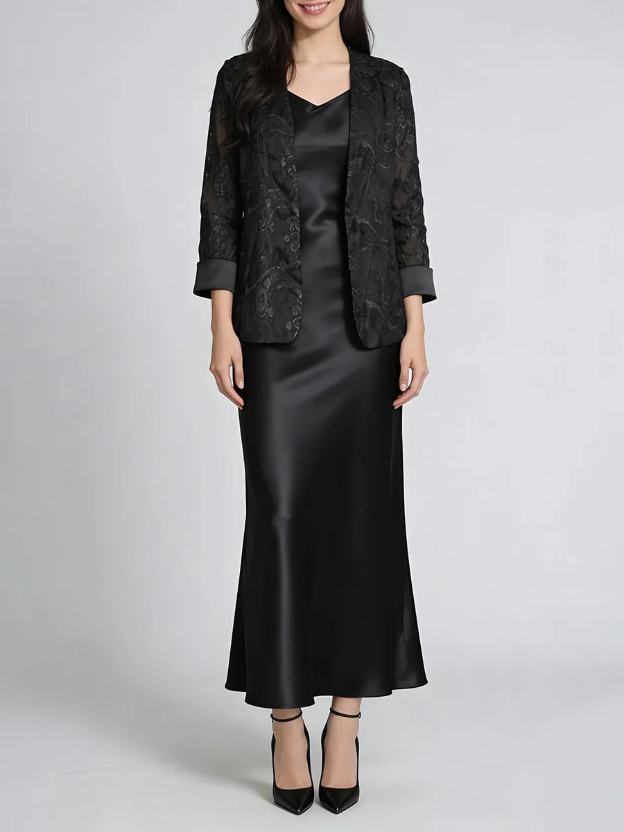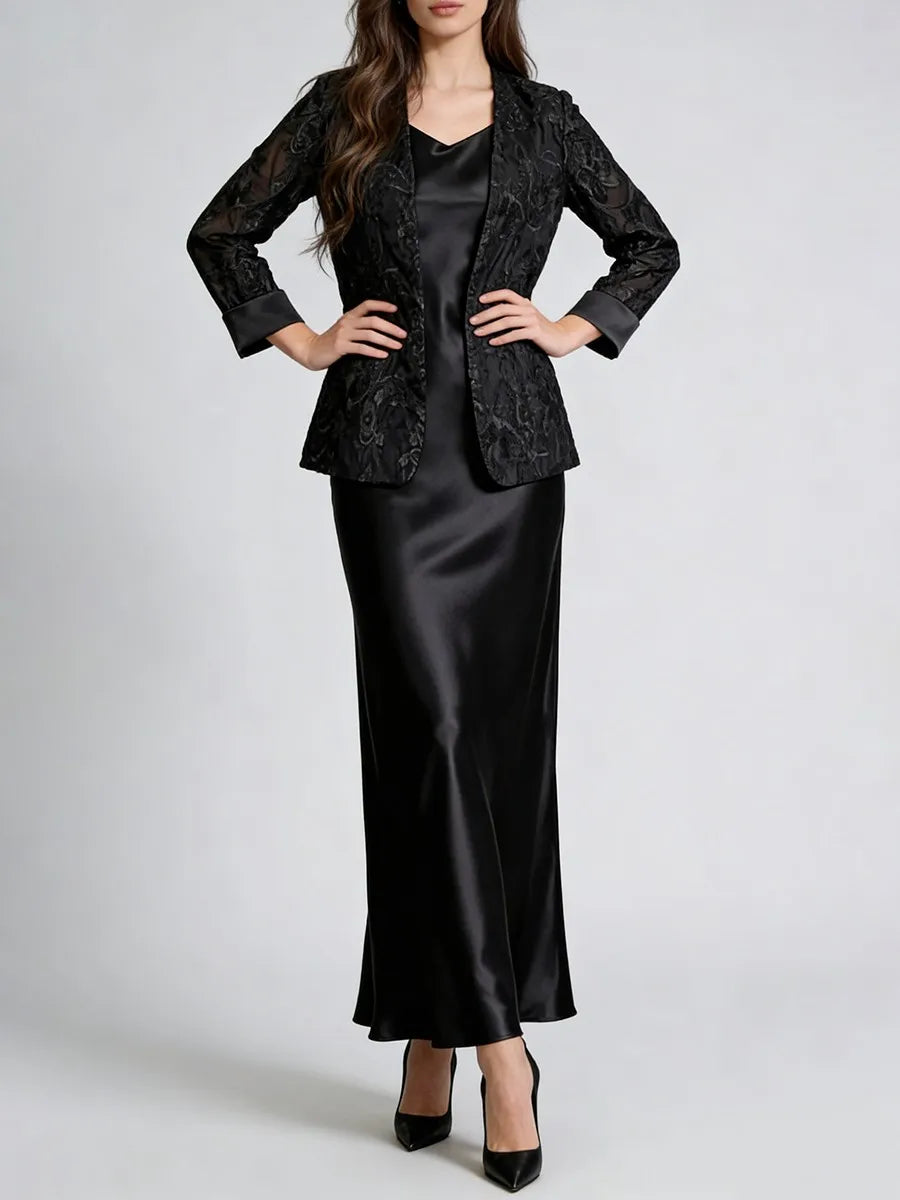 Trend4us Elegant Lace Blazer & Satin Maxi Dress Set