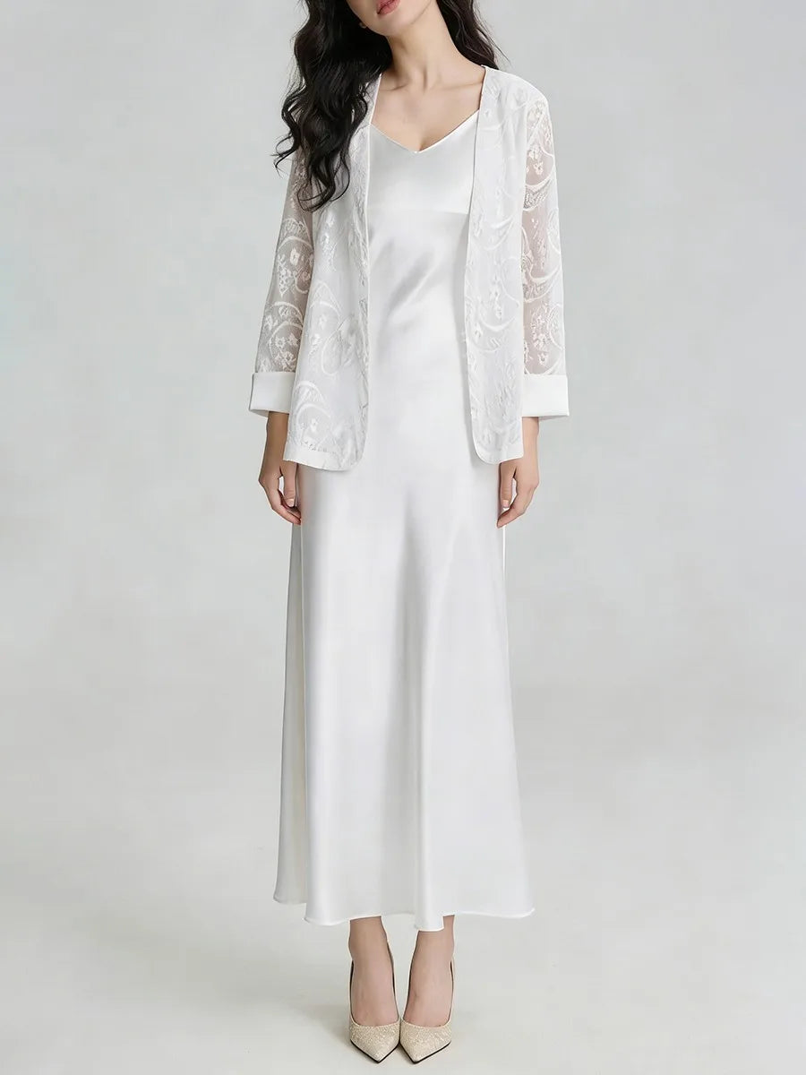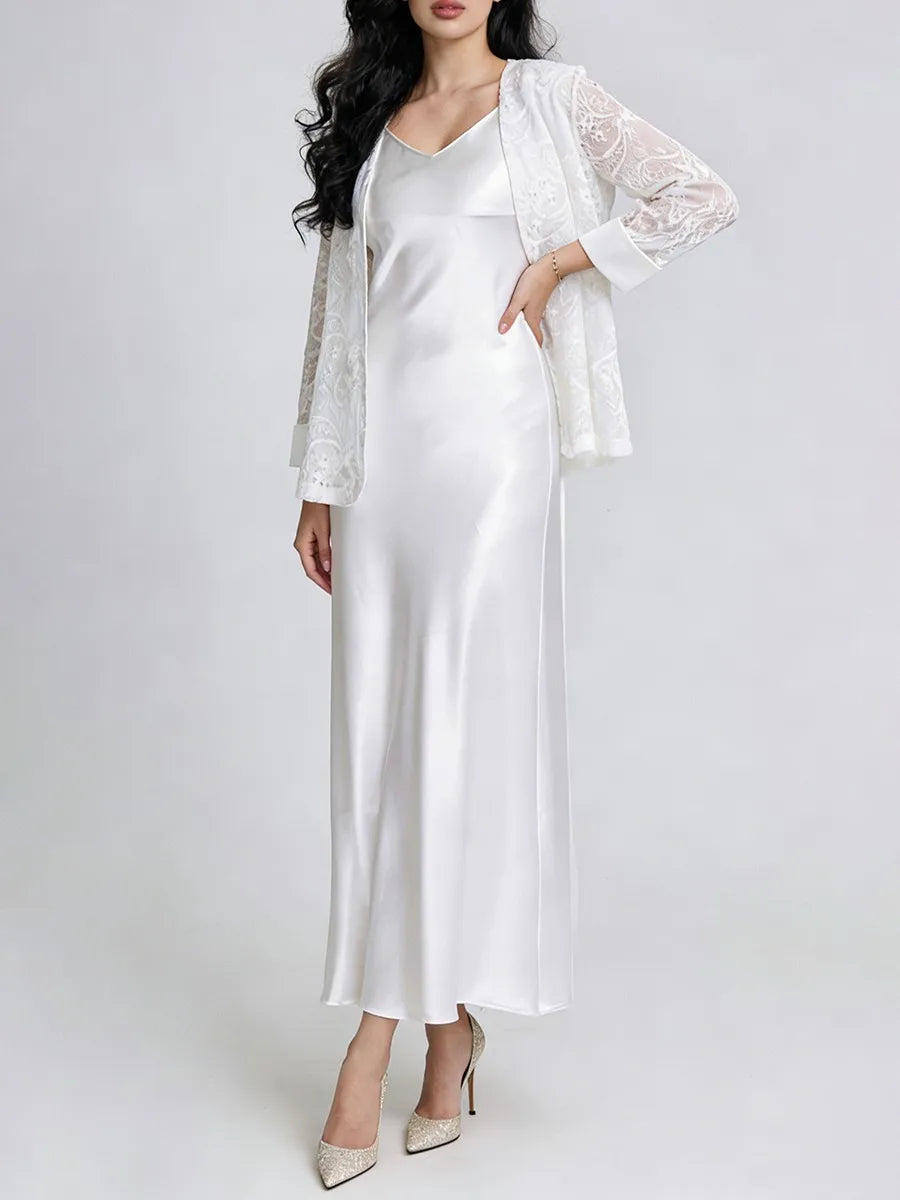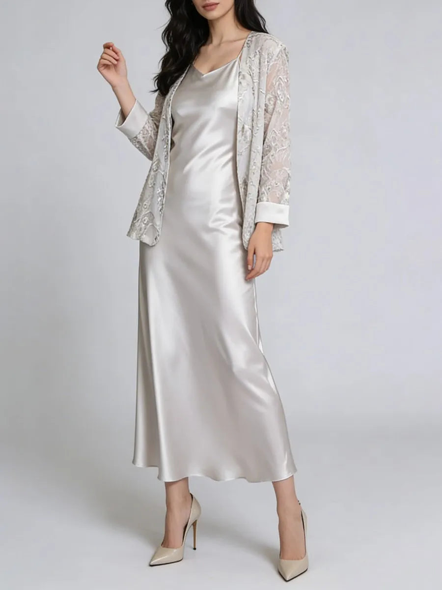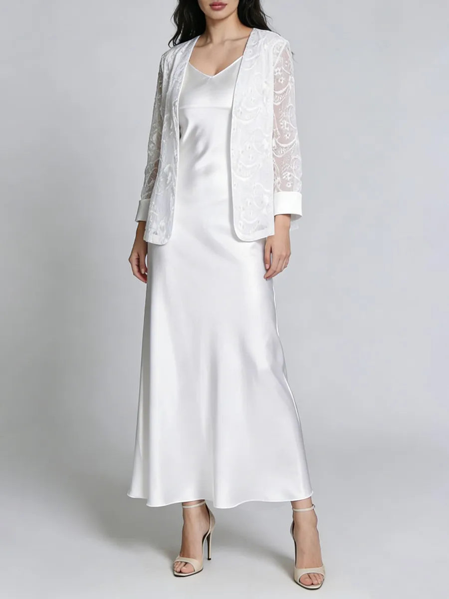 Trend4us Elegant Lace Blazer & Satin Maxi Dress Set