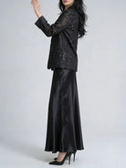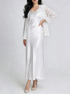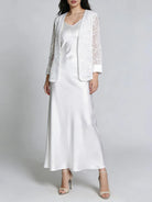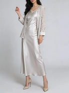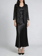 Command attention with effortless sophistication in the Trend4us Elegant Lace Blazer & Satin Maxi Dress Set, a stunning two-piece ensemble that perfectly balances refined elegance with modern versatility. This coordinated set features a delicate lace blazer with full-length sleeves and a classic V-neck, paired with a flowing satin maxi dress that falls gracefully to ankle length.