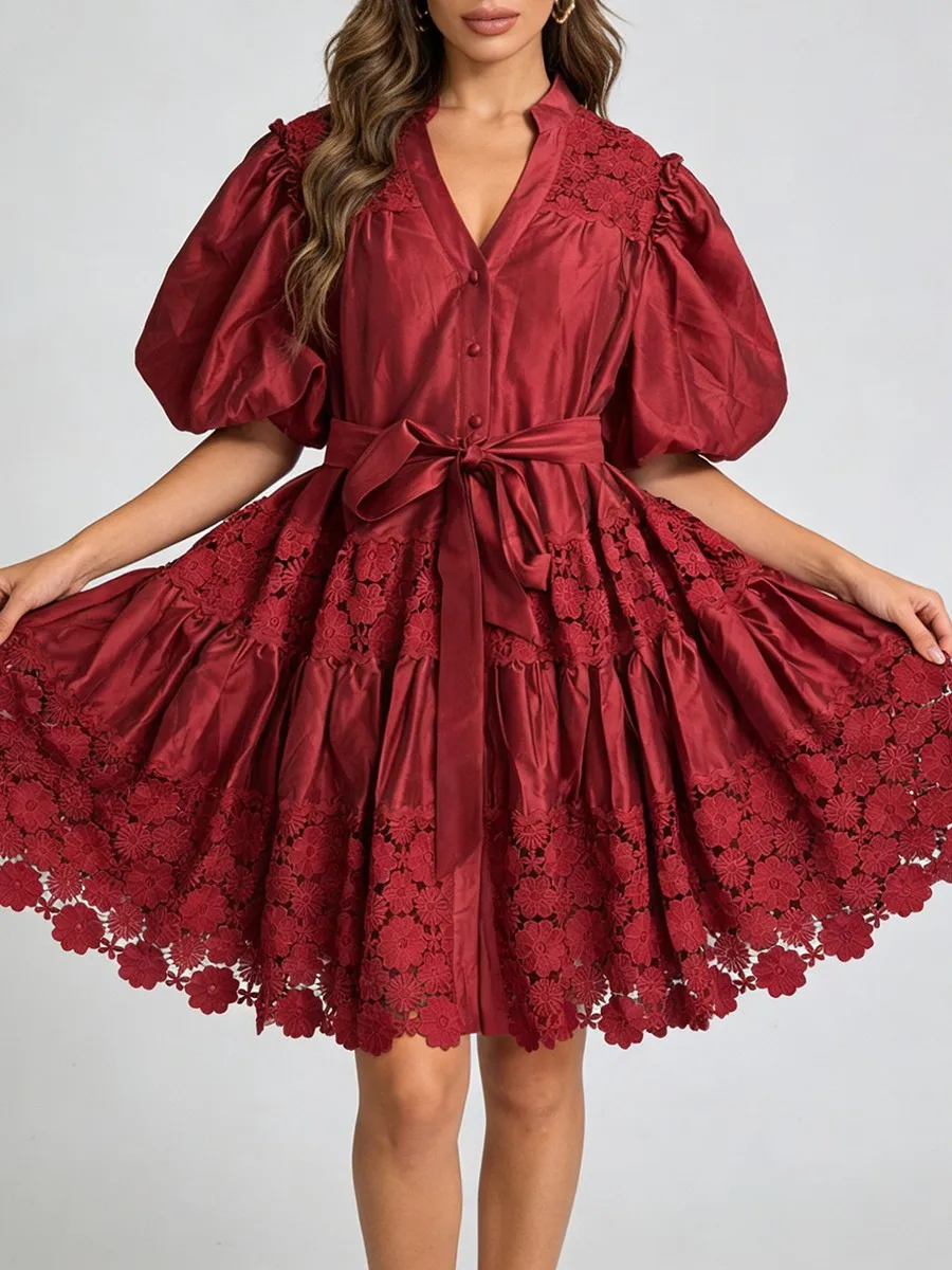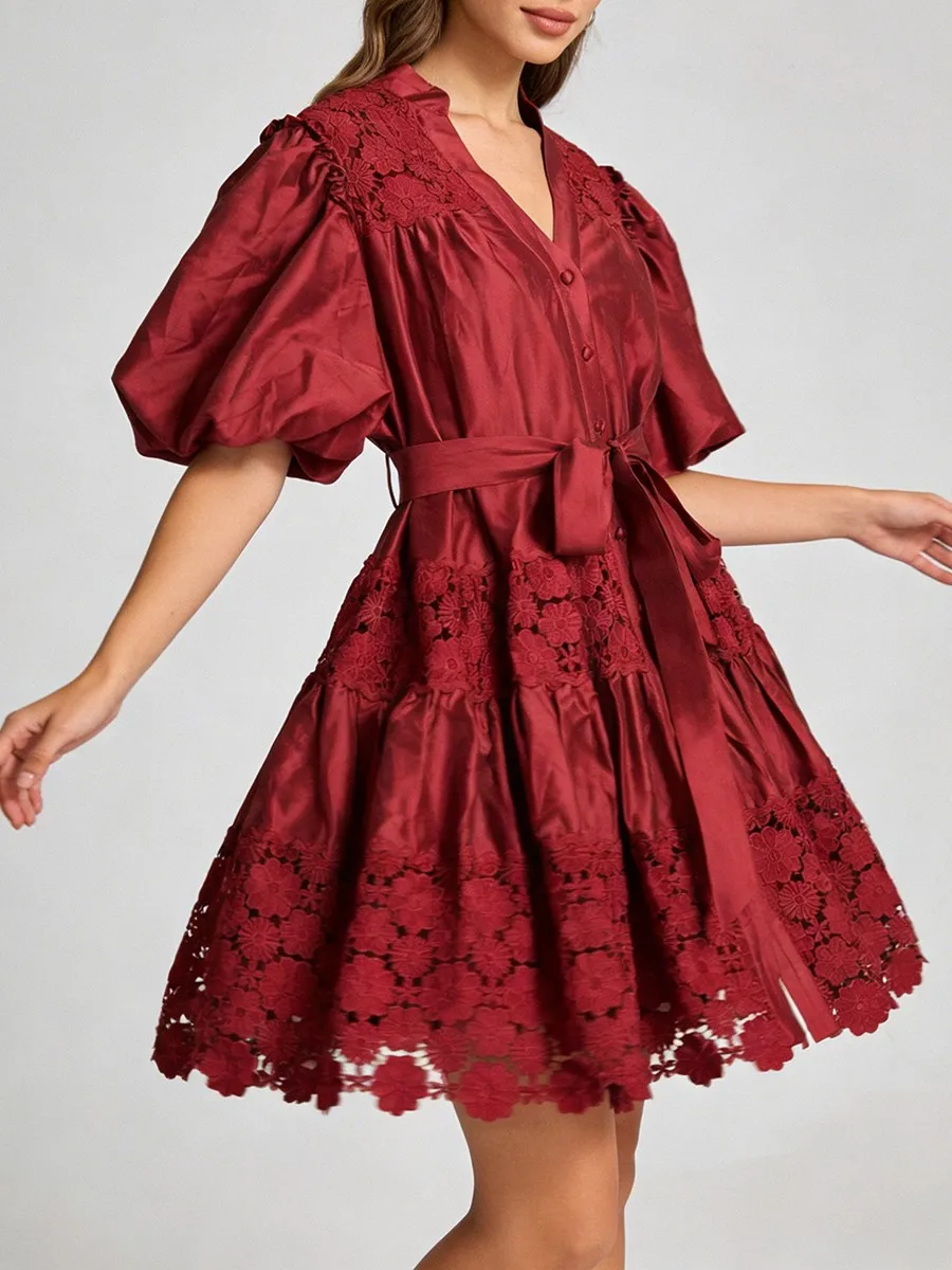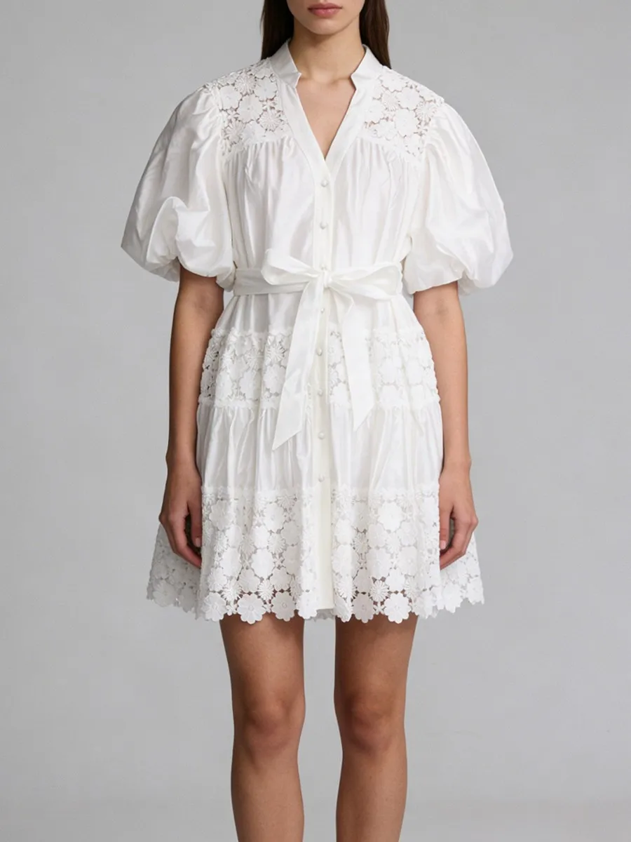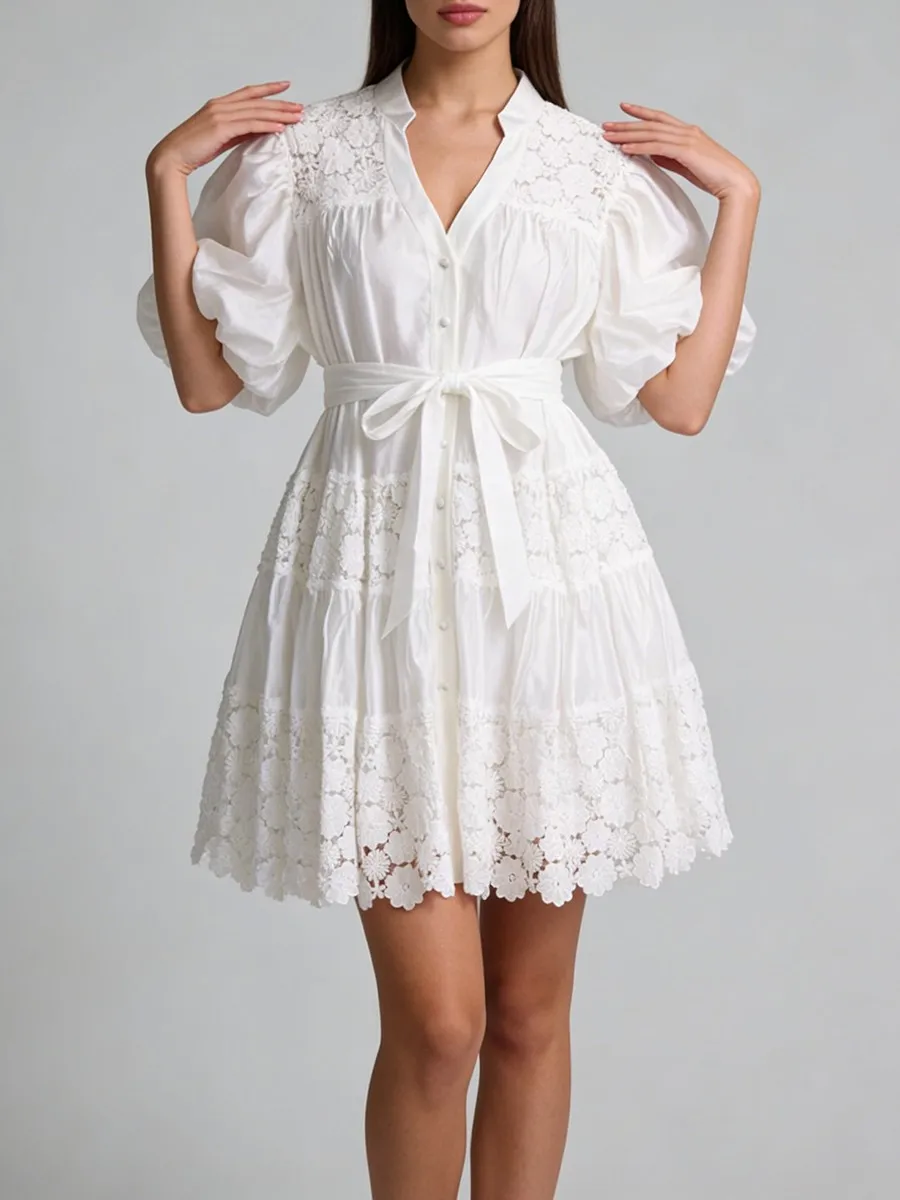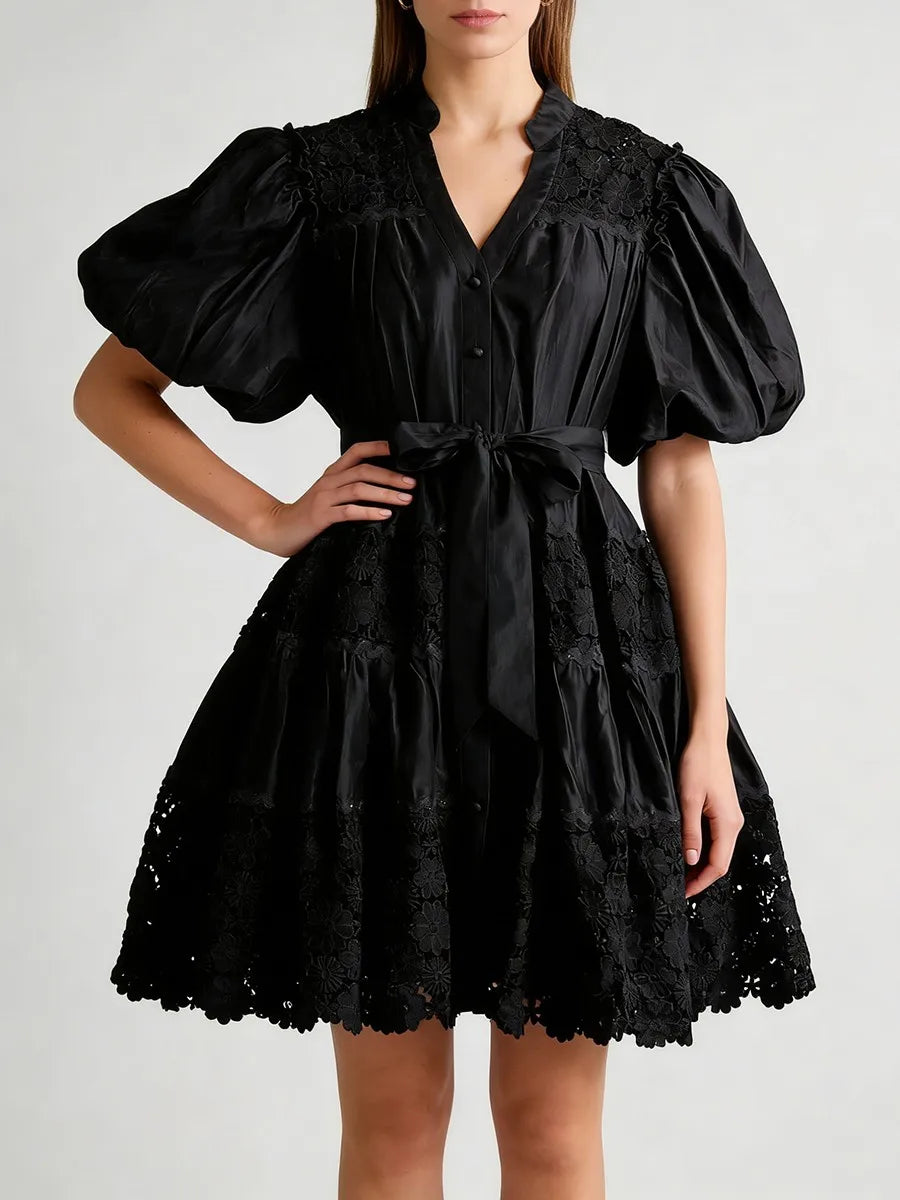 Trend4us Elegant Lace Puff Sleeve Tie-Waist Mini Dress