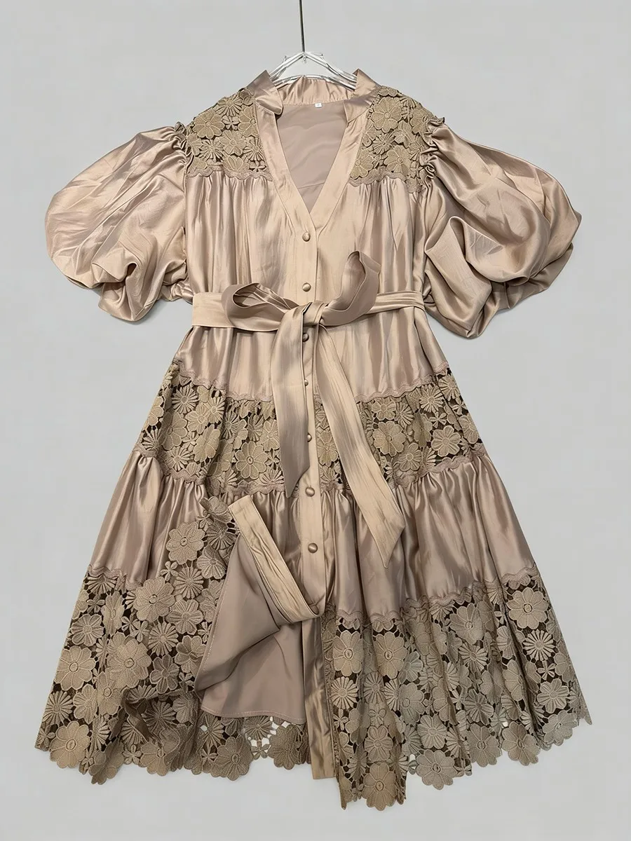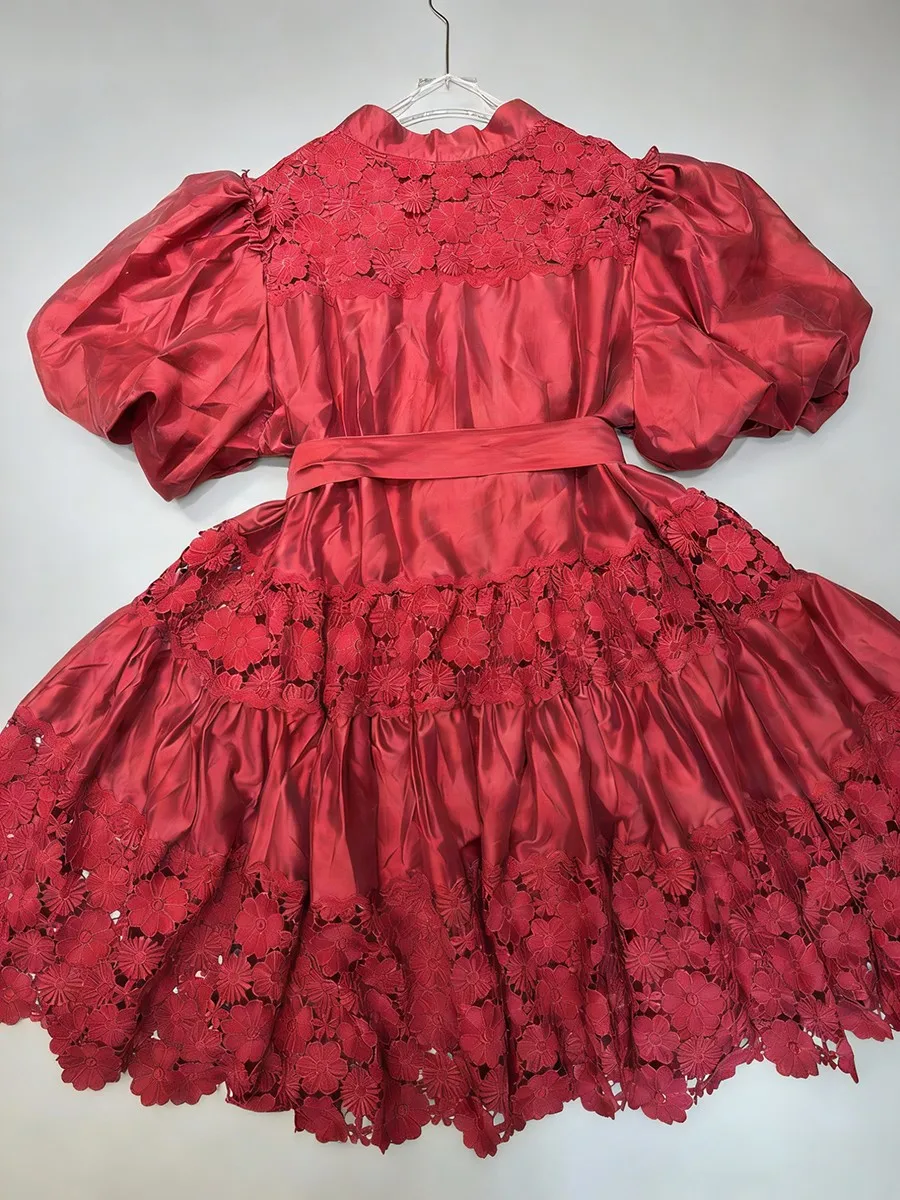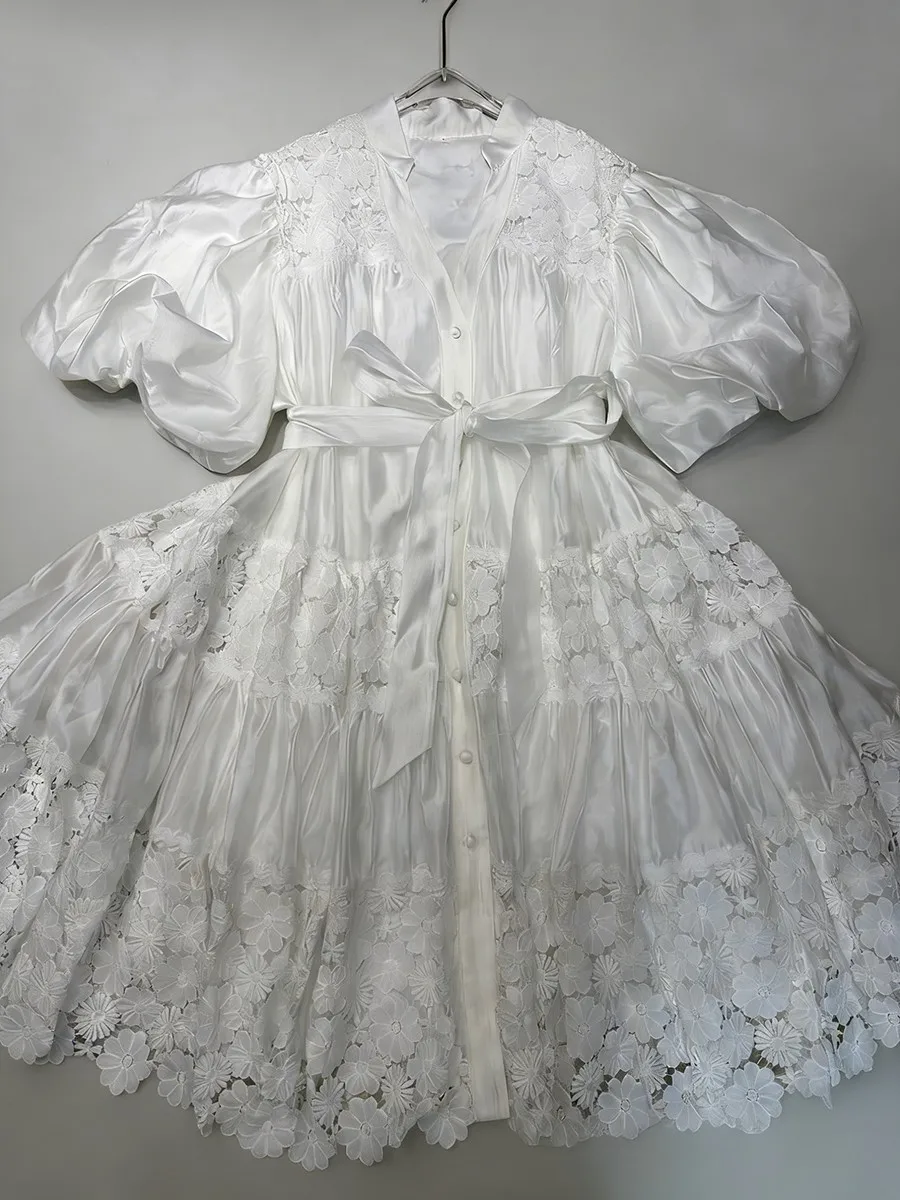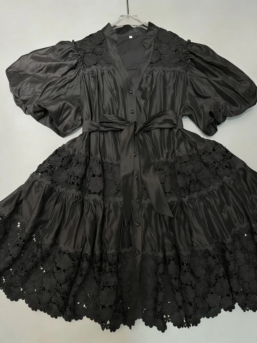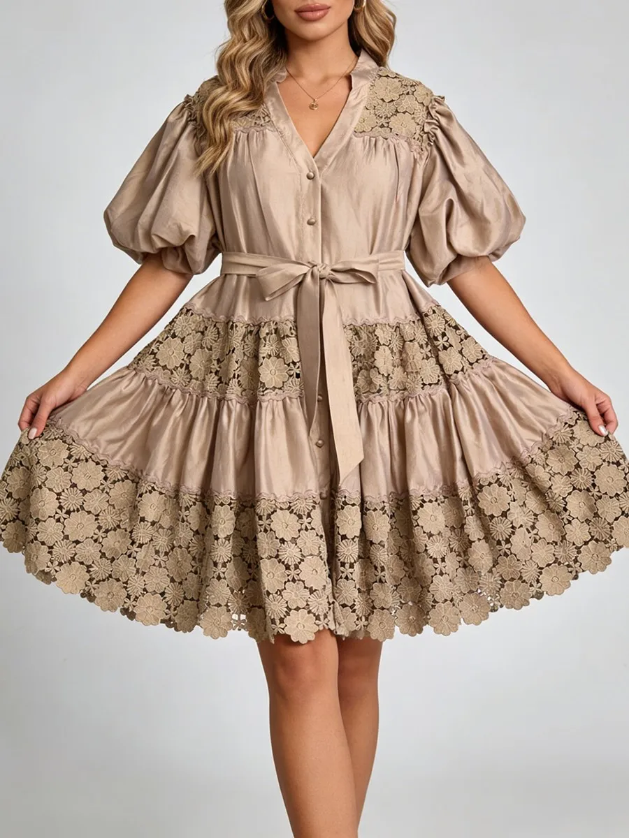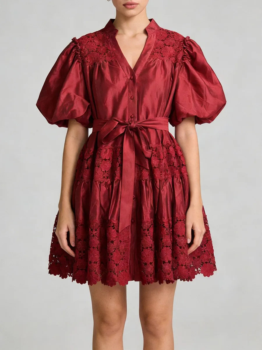 Trend4us Elegant Lace Puff Sleeve Tie-Waist Mini Dress