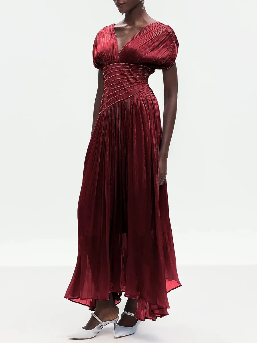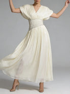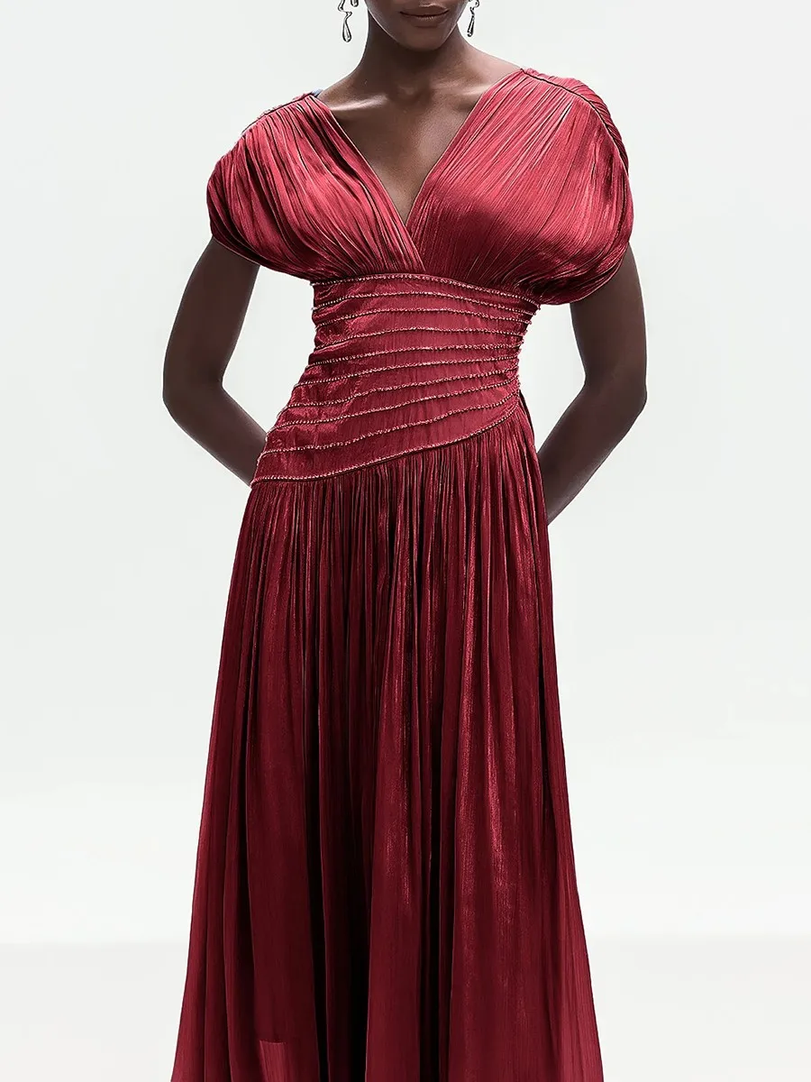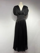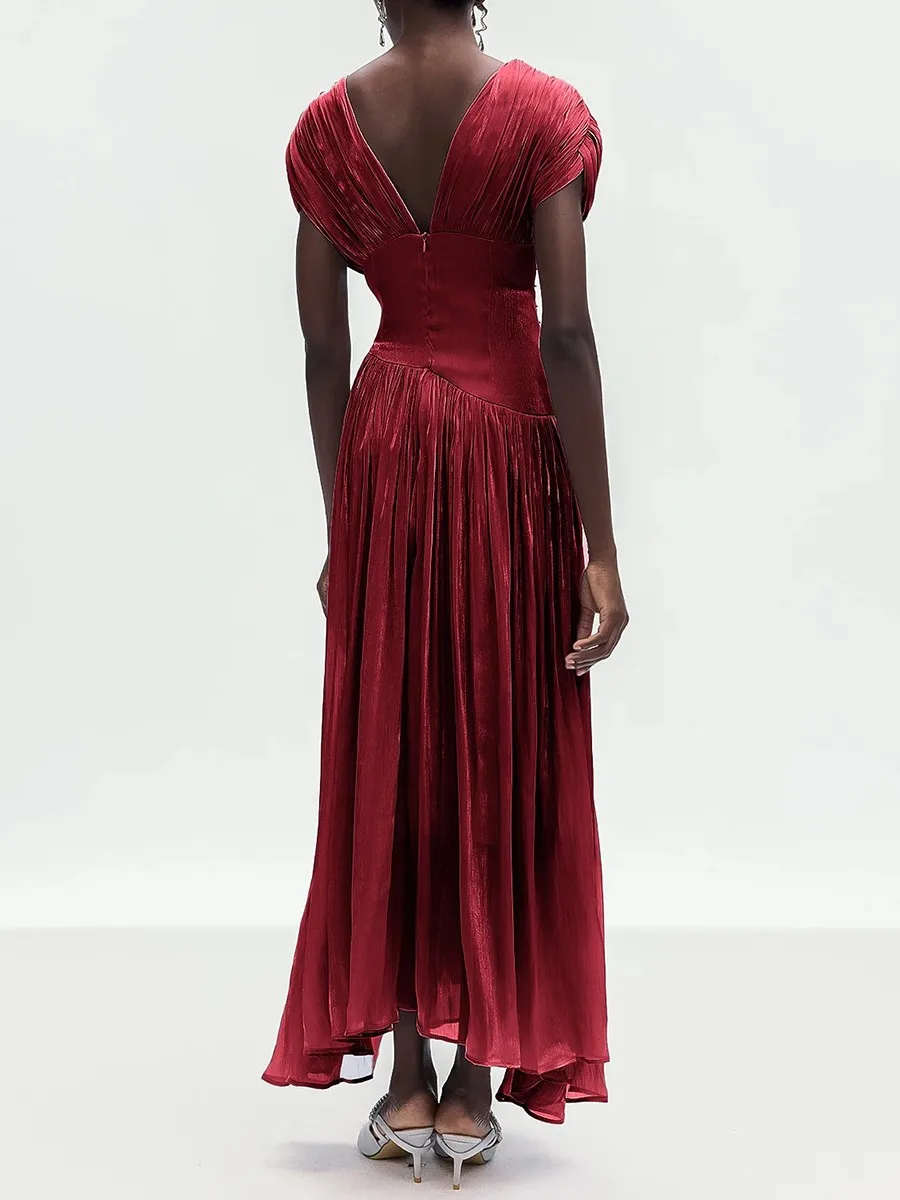 The deep V neckline at the front and back adds a subtle allure, balanced by delicate pleated shoulders and a flowing maxi skirt that drapes beautifully with every step. Ideal for formal evenings, weddings, and upscale events, this dress embodies classic femininity with modern luxury appeal.