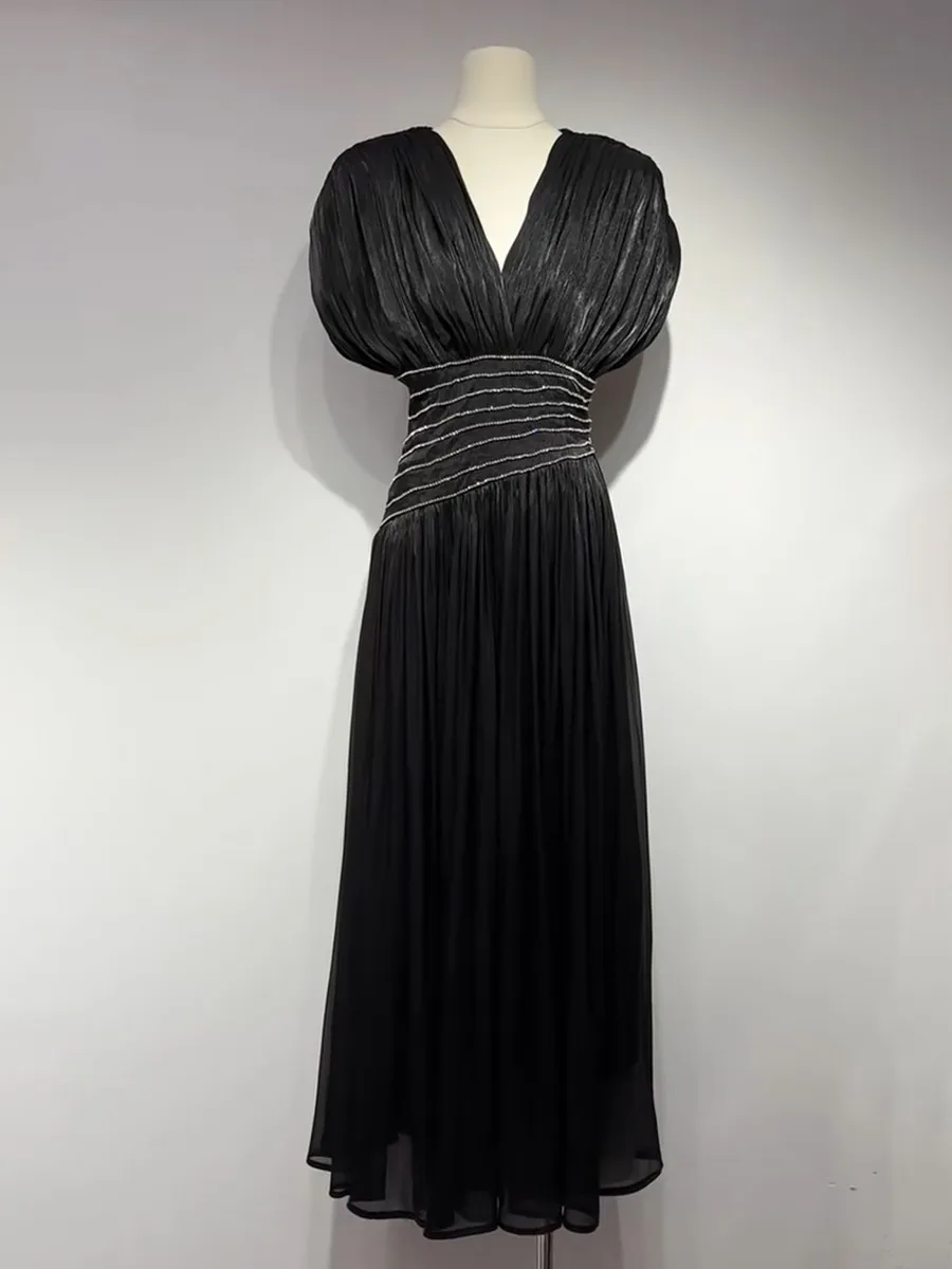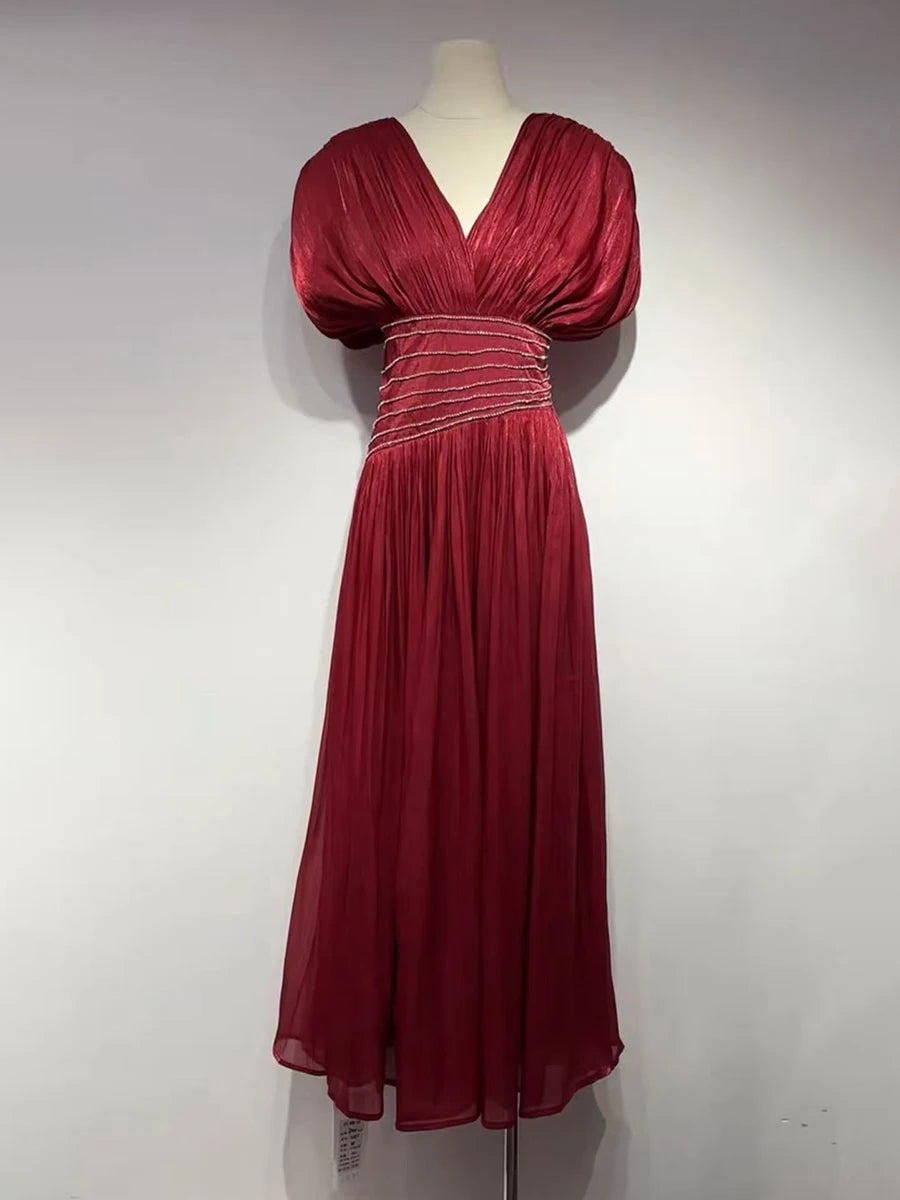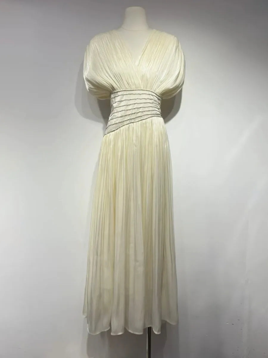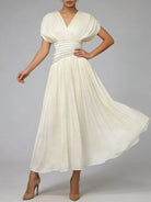 The deep V neckline at the front and back adds a subtle allure, balanced by delicate pleated shoulders and a flowing maxi skirt that drapes beautifully with every step. Ideal for formal evenings, weddings, and upscale events, this dress embodies classic femininity with modern luxury appeal.