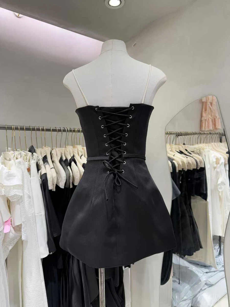 Effortlessly seductive, impeccably refined — this elegant satin corset lace-up mini dress is a wardrobe essential that delivers a polished, evening-ready glamour with a bold, contemporary edge. The square collar neckline frames the décolletage with a clean, geometric precision that feels both modern and timeless, while delicate spaghetti straps add a light, feminine elegance that keeps the look fresh and seasonally versatile. The corset-inspired lace-up detail cinches the silhouette with a sculpted, body-defining confidence that flatters every figure with a tailored, structured precision. An empire waistline lifts and defines the look with a graceful, feminine quality, and the slim A-line silhouette falls to a mini-length hem with a sleek, polished ease that makes this dress a true evening wardrobe hero. Crafted in a slight-stretch polyester satin for a smooth, luxurious drape that moves beautifully and holds its shape through long nights. Available in Black and Apricot — two timeless, high-impact shades. Sizes S–L.
