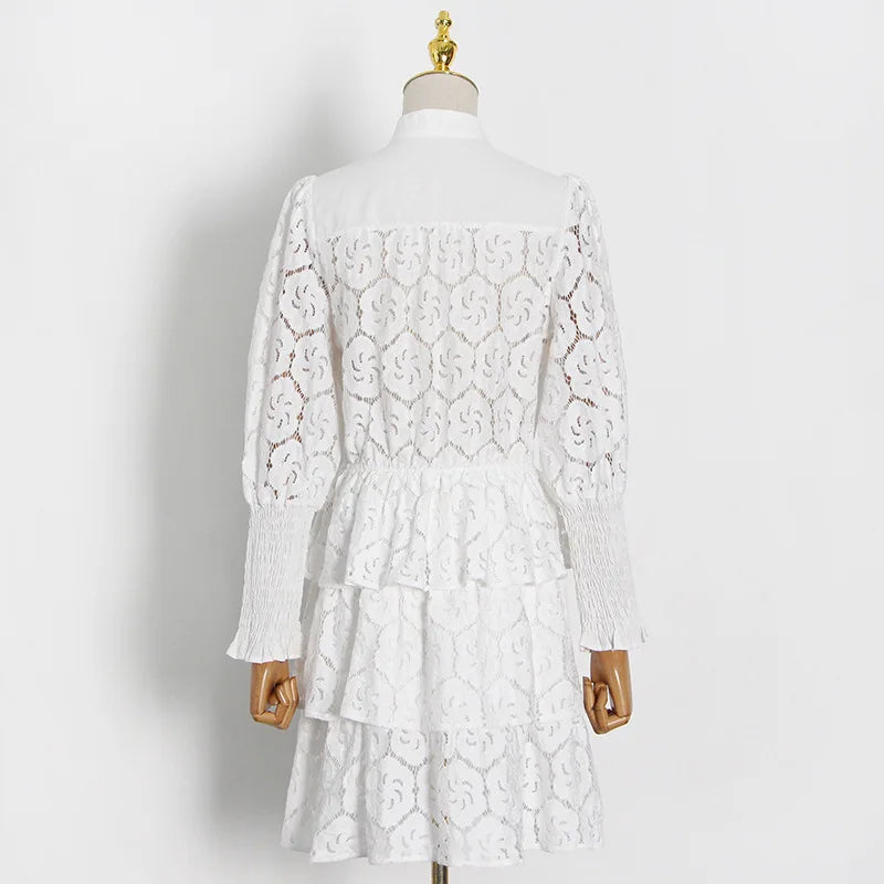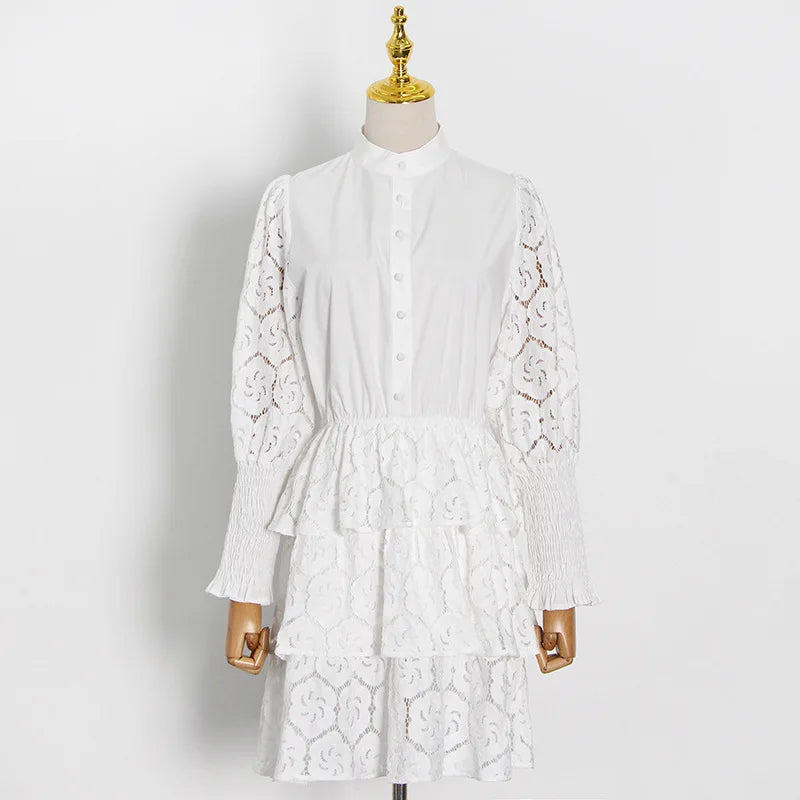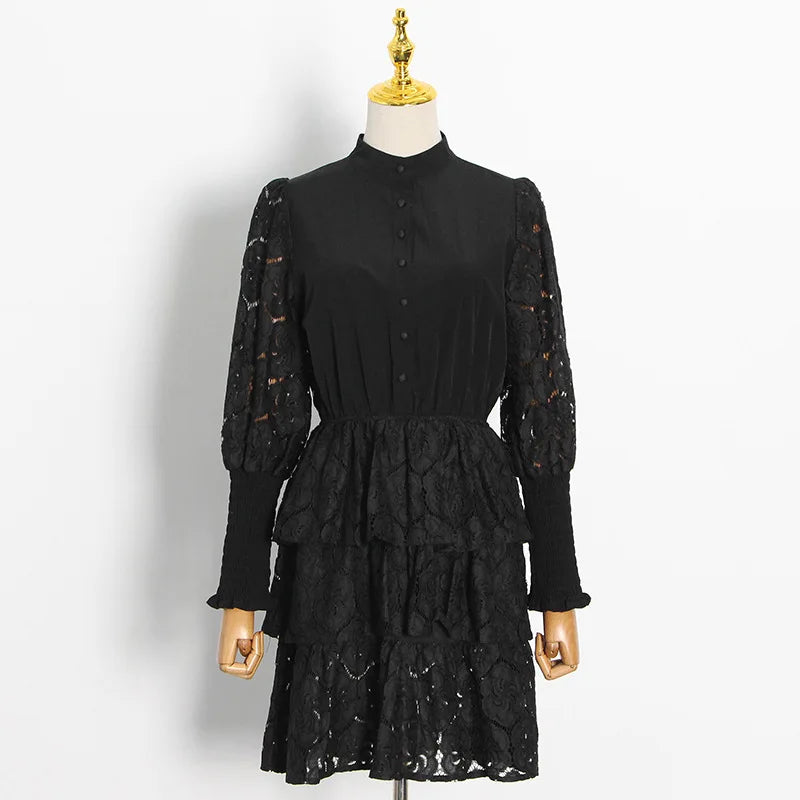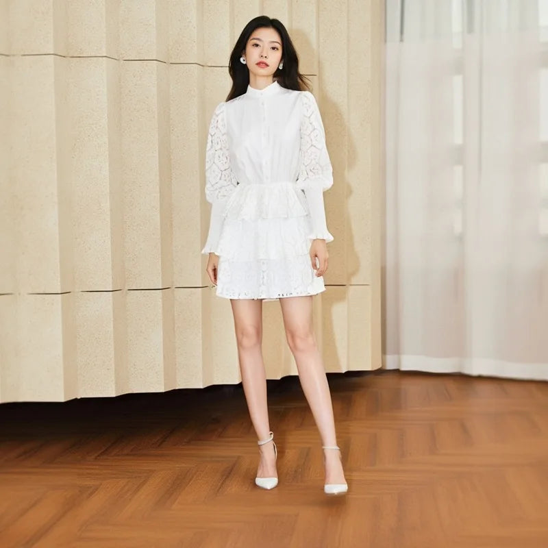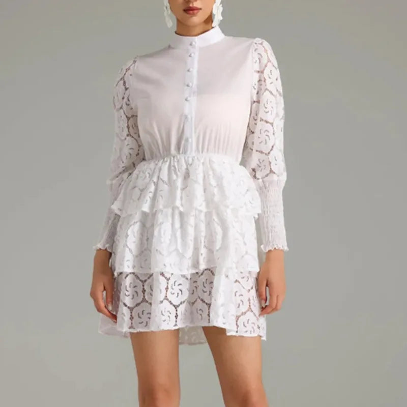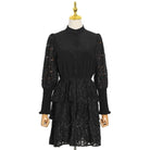 A sophisticated mini dress featuring delicate sheer lace construction with romantic tiered detailing. The high neckline and full-length lantern sleeves create an elegant silhouette, while the empire waistline flatters every figure. Crafted from premium polyester lace, this dress transitions seamlessly from evening events to special occasions.