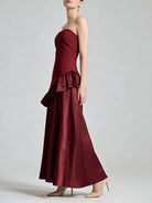 Command attention at your next formal event with this breathtaking strapless maxi dress featuring cascading ruffles and luxurious satin fabric. The elegant silhouette flows gracefully to ankle length, creating a timeless look that exudes sophistication and romance.