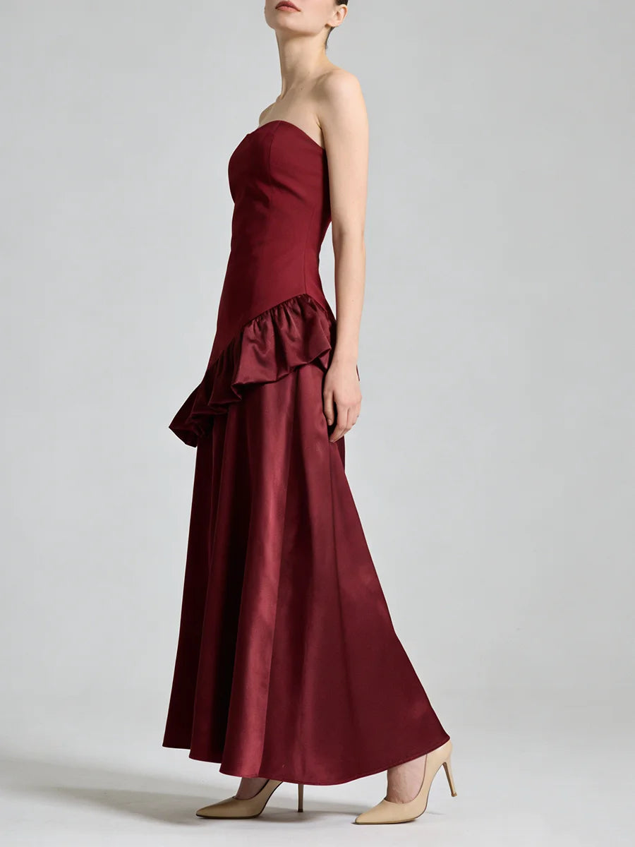 Trend4us Elegant Strapless Ruffle Satin Maxi Dress