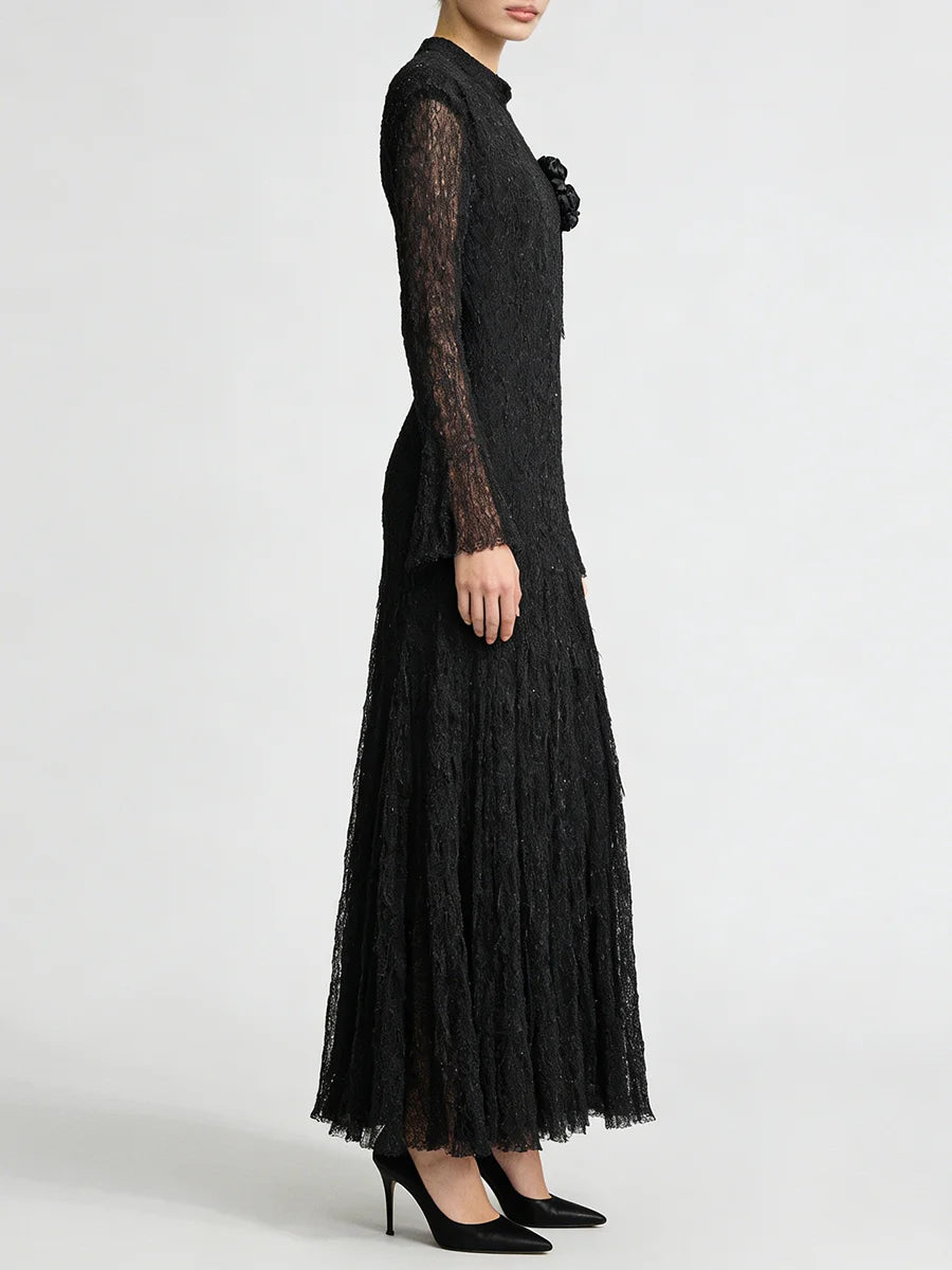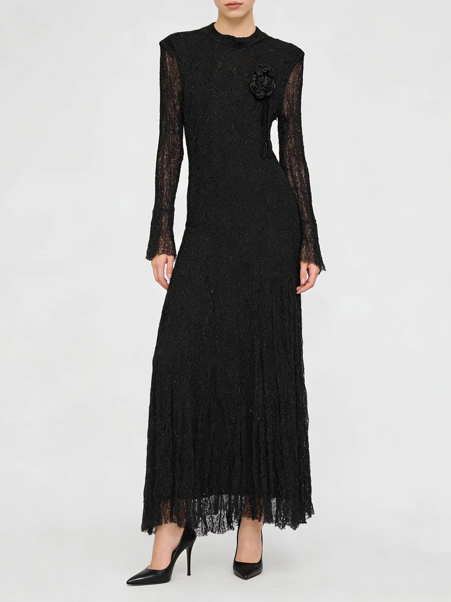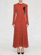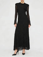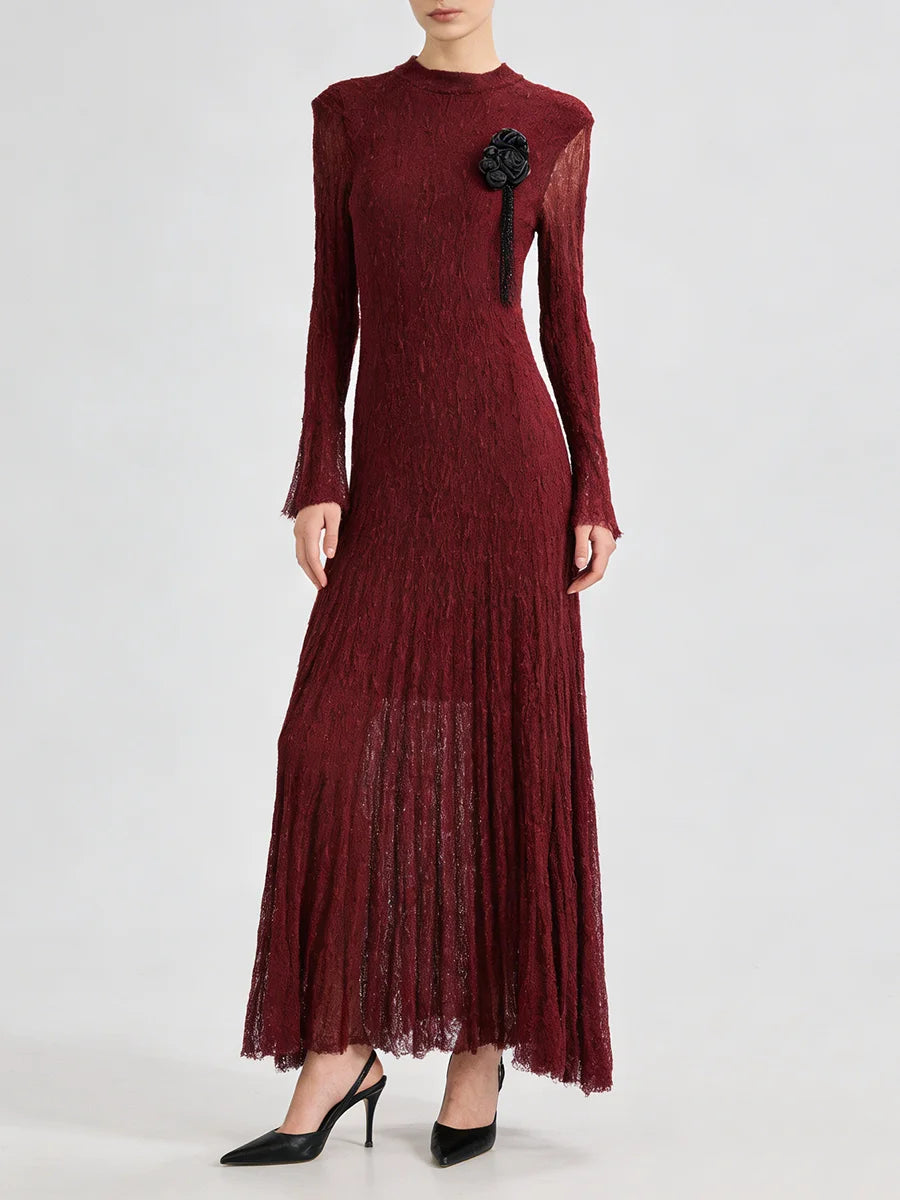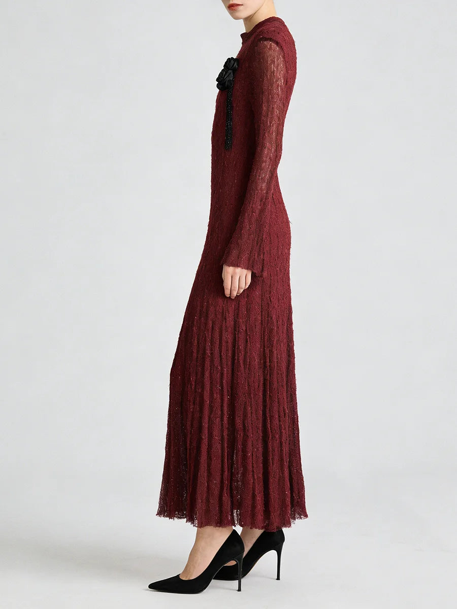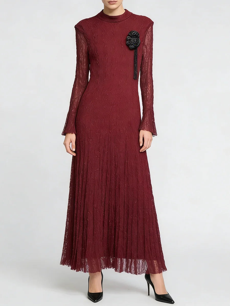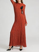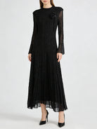Embrace timeless elegance in this sophisticated textured pleated dress featuring delicate appliqué details and graceful long sleeves. This refined piece combines classic design with contemporary styling, perfect for spring and summer weddings, garden parties, formal events, or any occasion where polished femininity is called for.