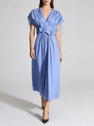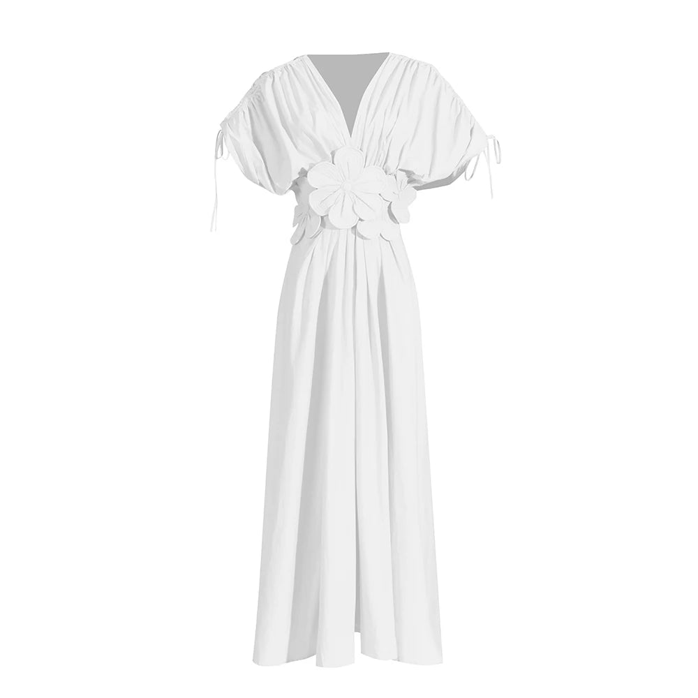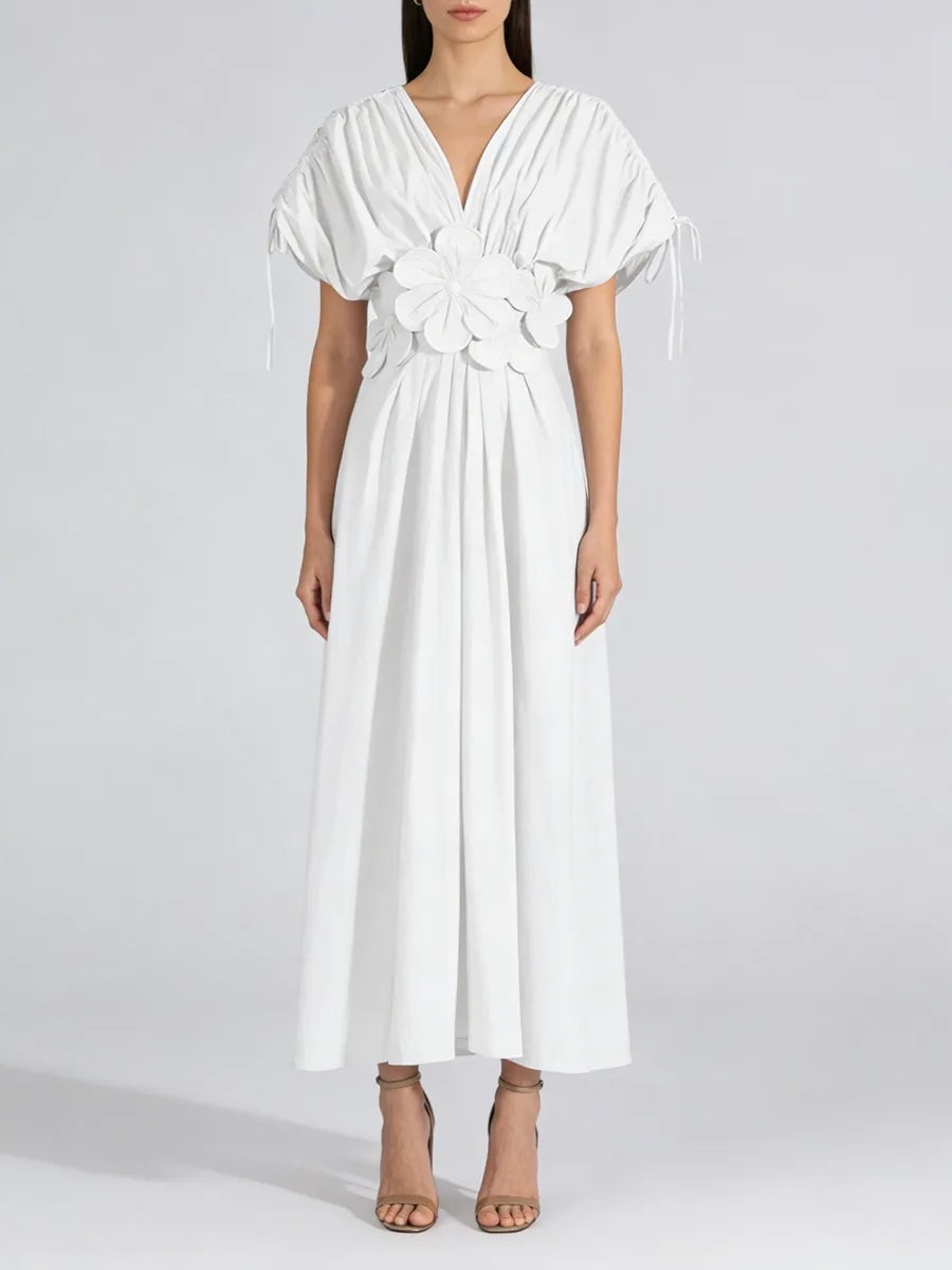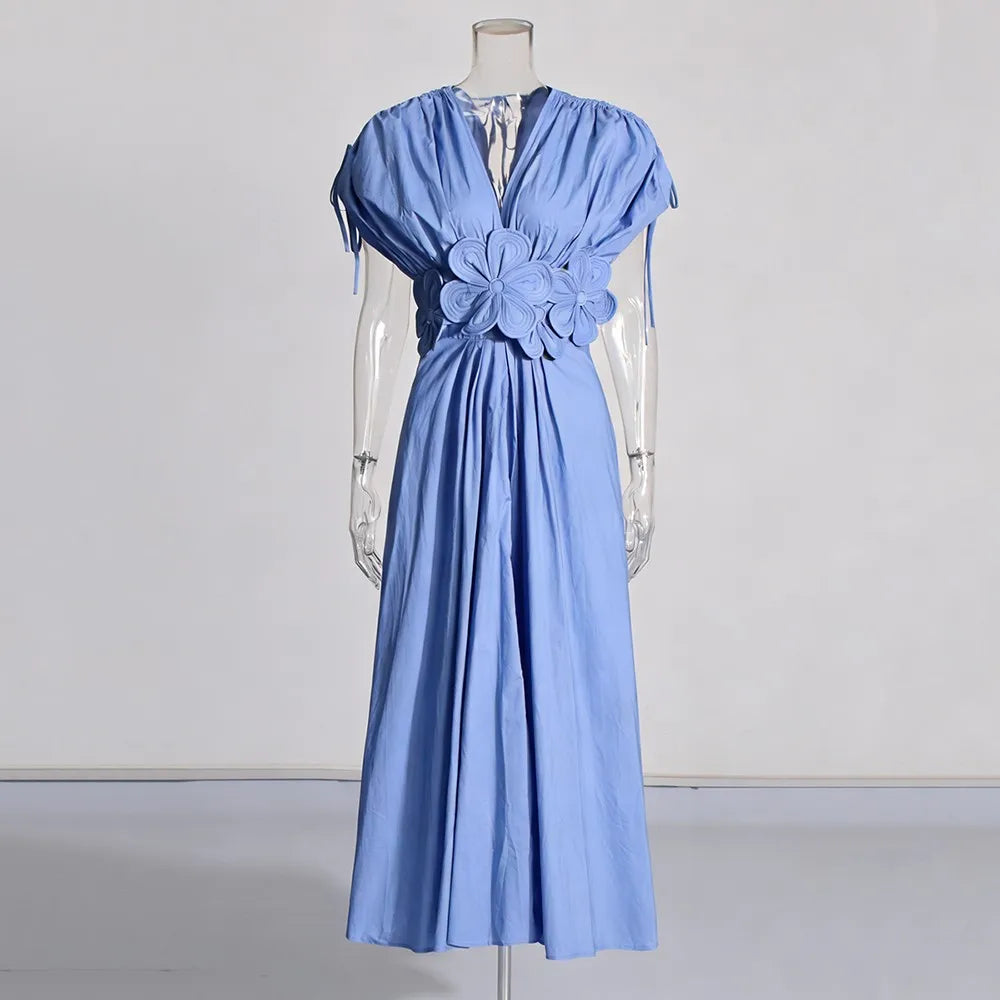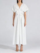 Make a statement in this stunning midi dress featuring intricate 3D floral appliqués that bring texture and dimension to your look. The flattering V-neckline and empire waistline create an elegant silhouette, while the ankle-length hem adds sophisticated drama.