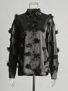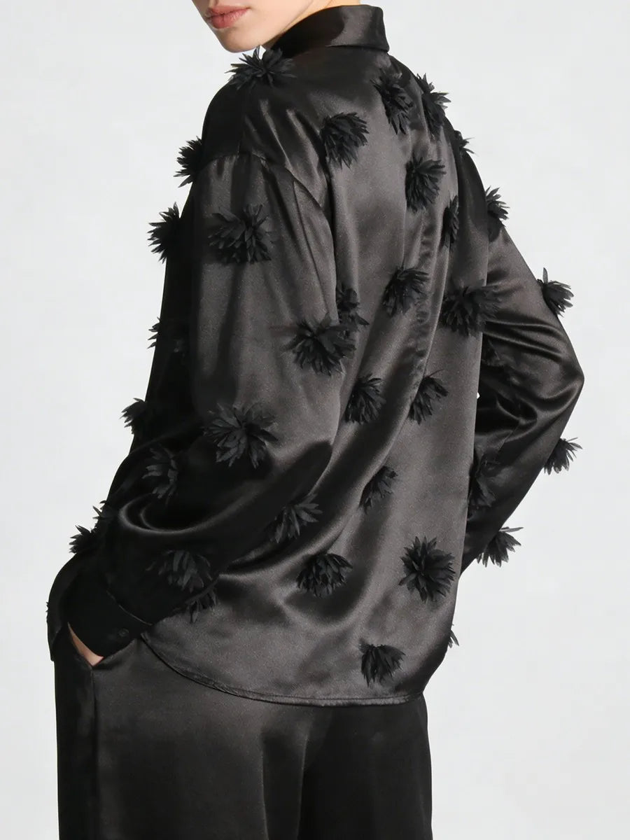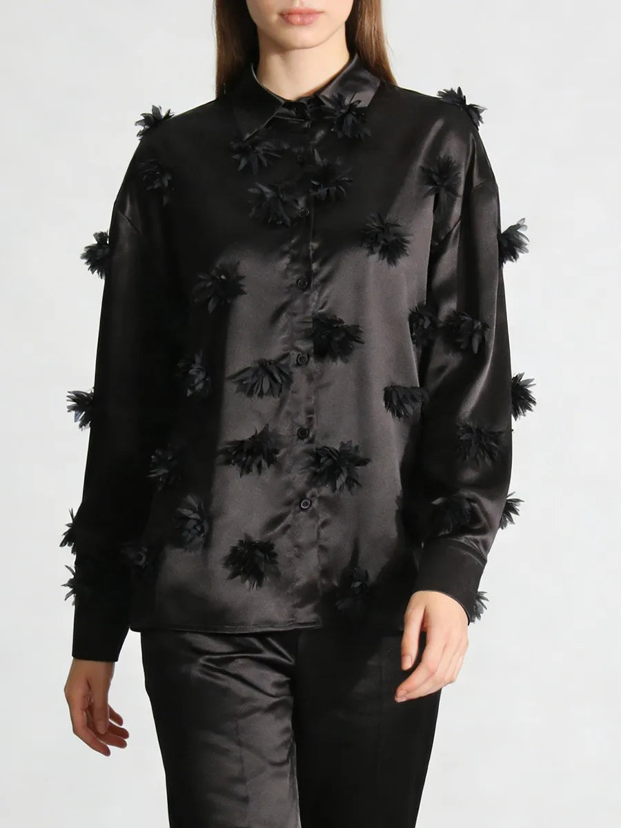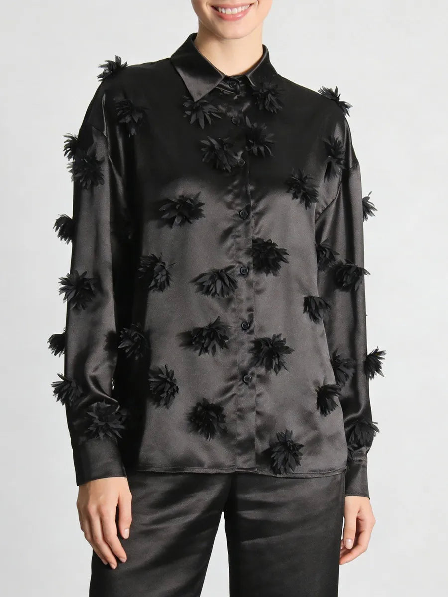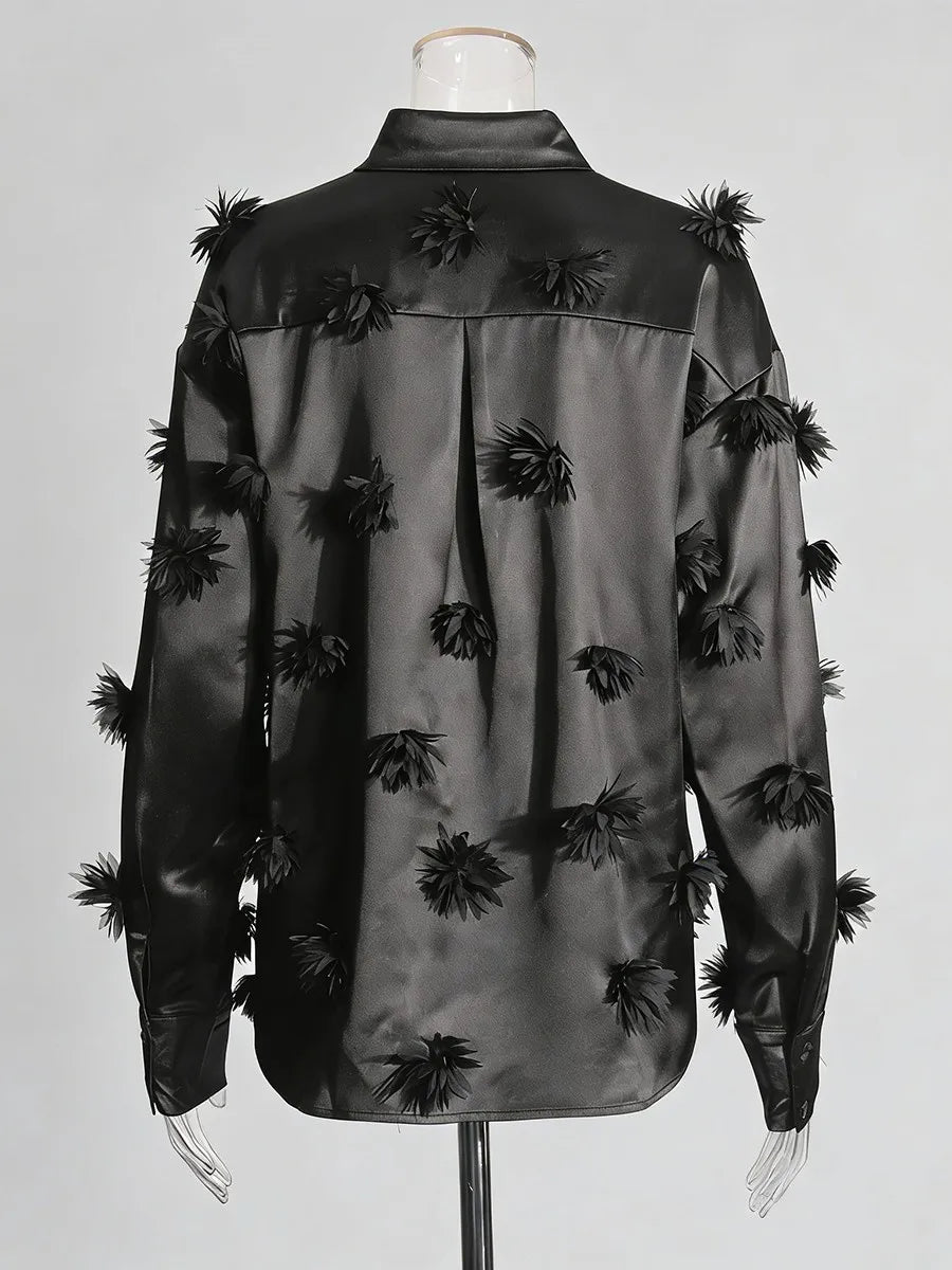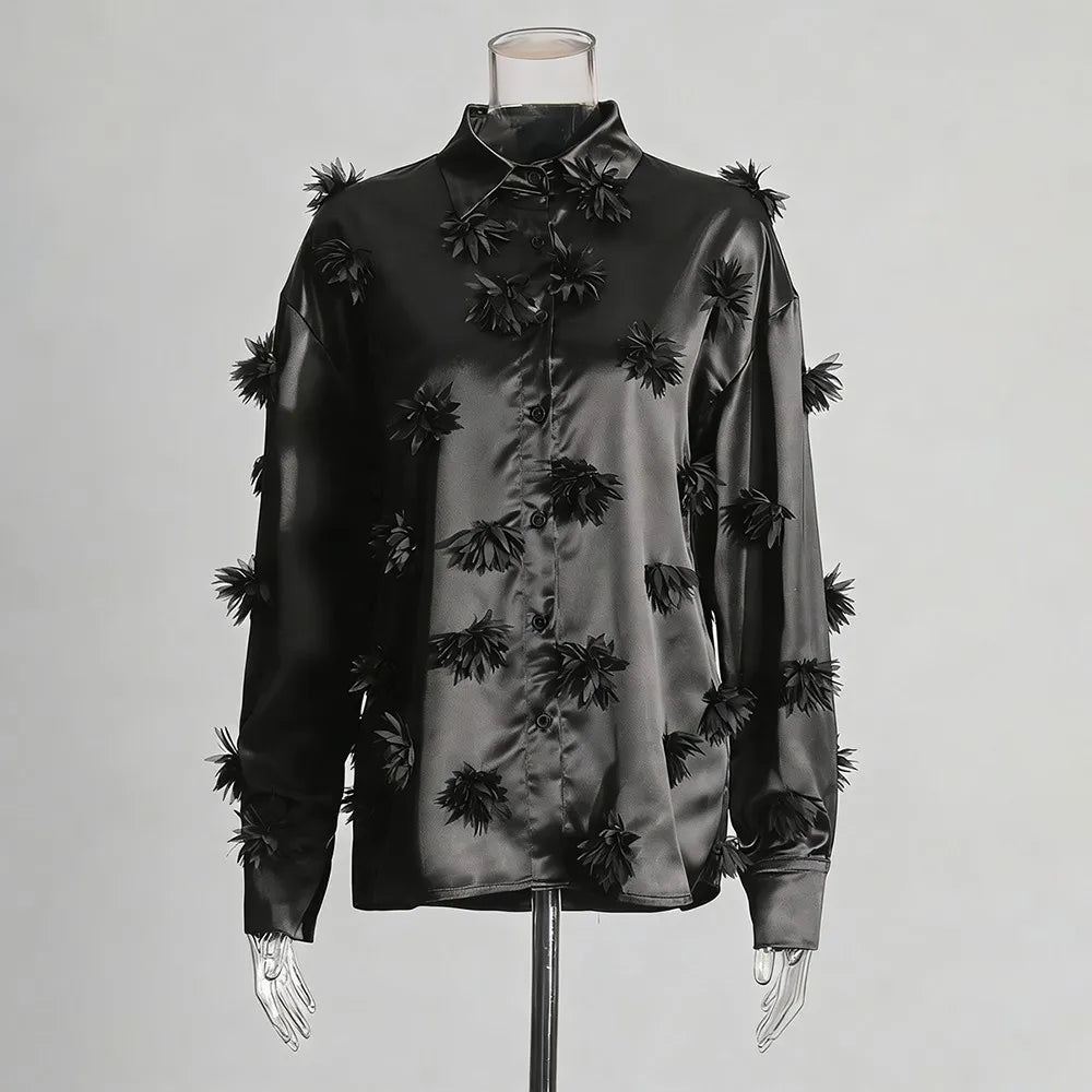 Elevate your wardrobe with this luxurious satin shirt featuring exquisite 3D floral embellishments that add dimensional texture and romantic appeal. The lustrous satin fabric creates beautiful drape and movement, while the classic turn-down collar and loose fit deliver effortless sophistication for any occasion.