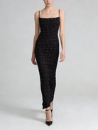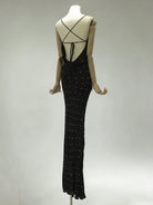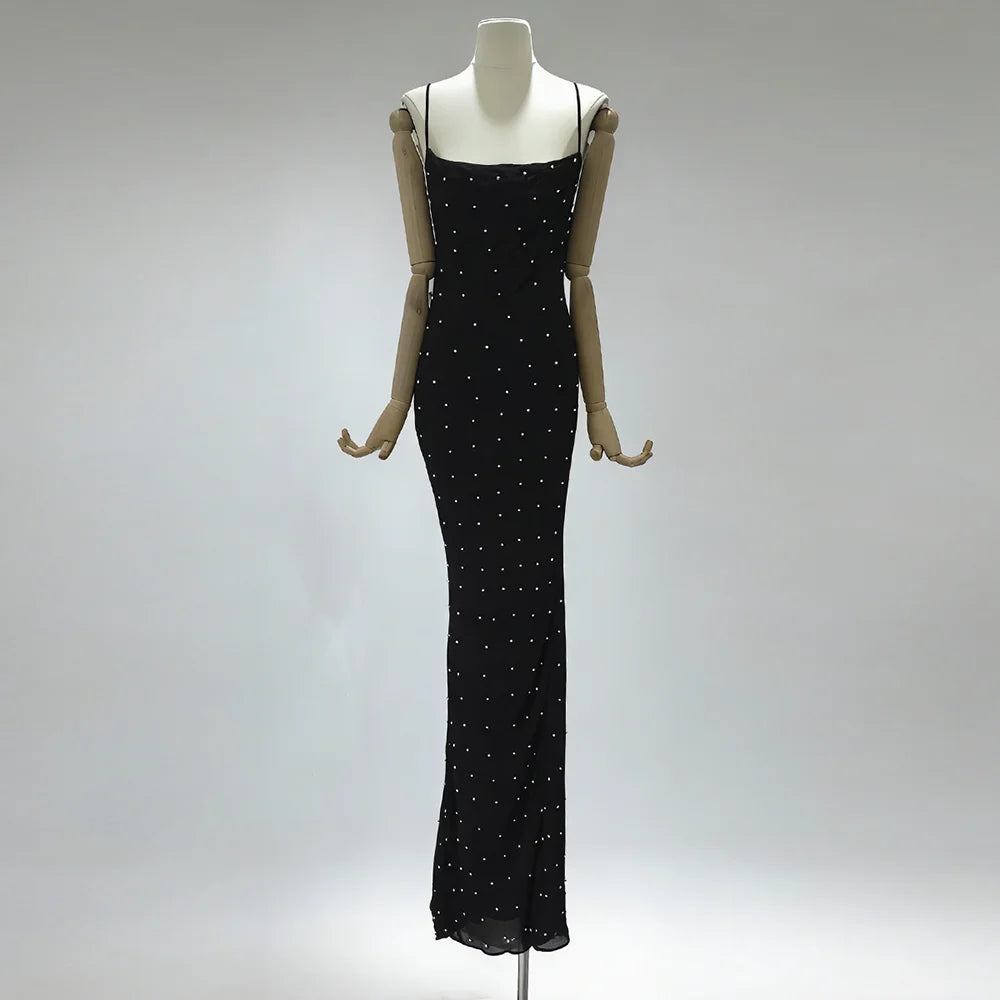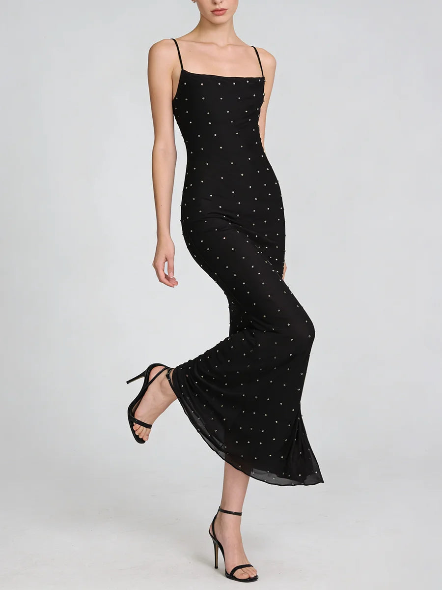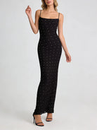 Turn heads with this luxe crystal-studded backless slip maxi dress, a stunning blend of sultry elegance and modern glamour. This ankle-length dress features delicate spaghetti straps, a sophisticated square neckline, and sparkling crystal embellishments that catch the light beautifully. The daring backless design adds allure while the slim-fit silhouette creates a sleek, elongating effect. Perfect for the confident woman who loves to make a statement with effortless sophistication.