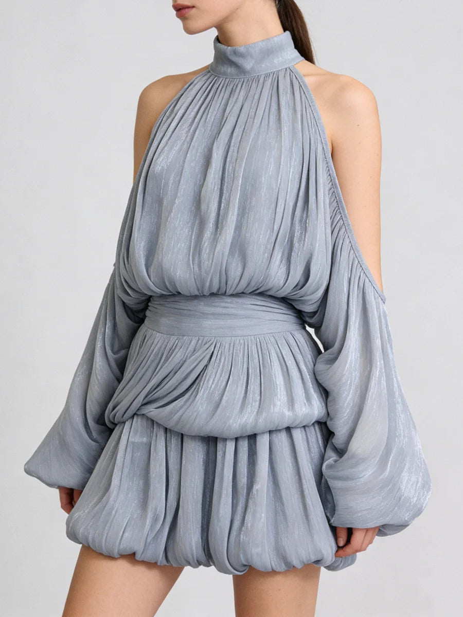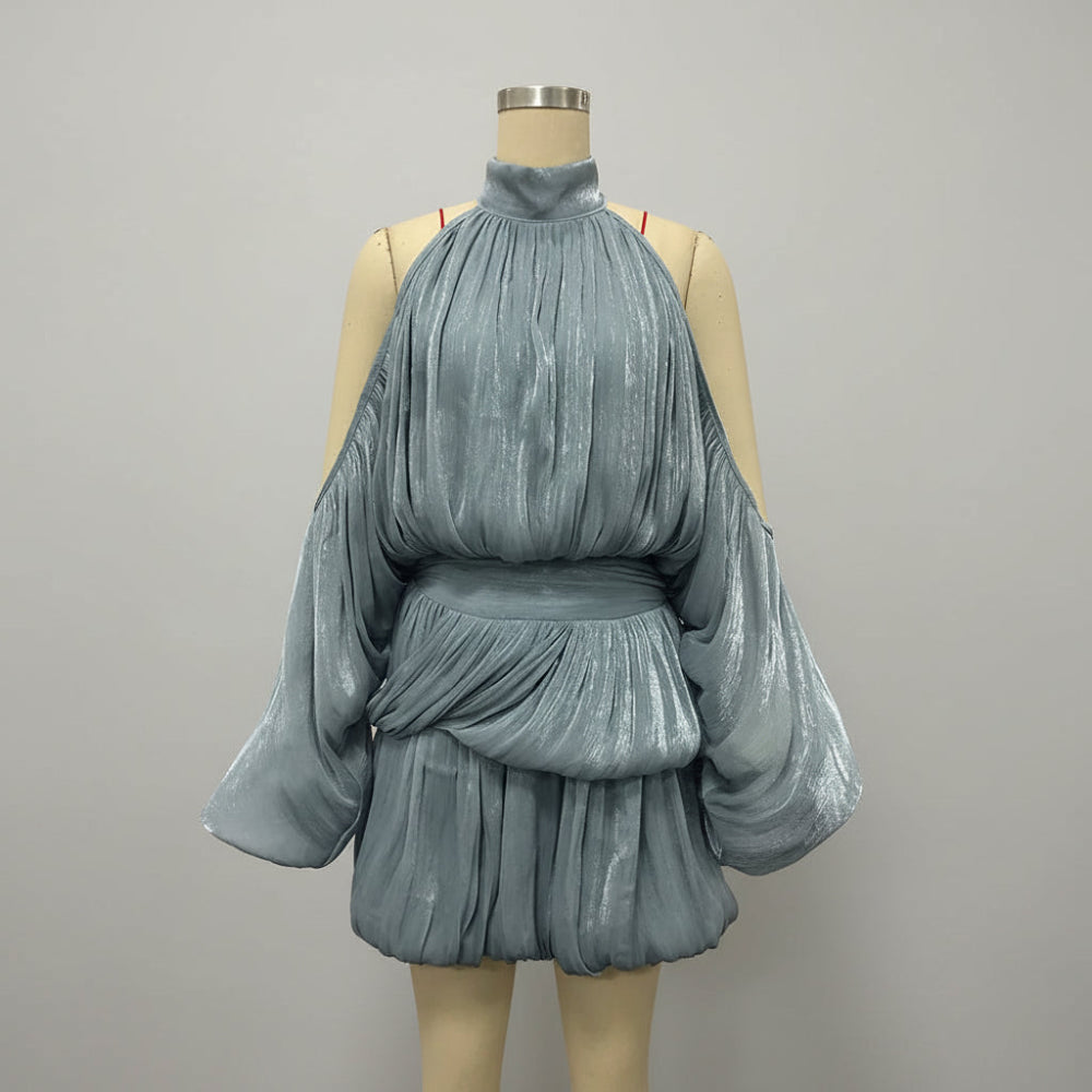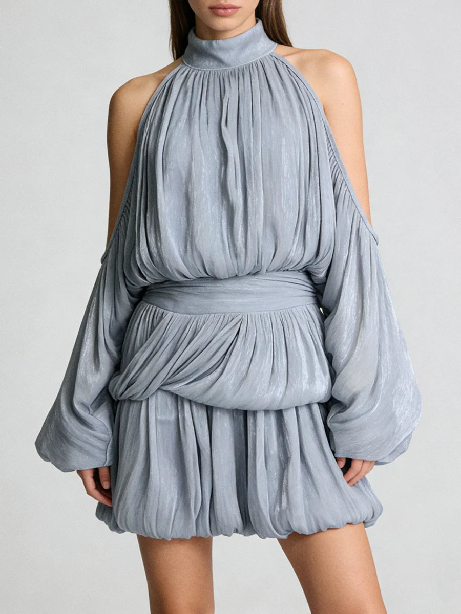 Make a sophisticated statement in this luxurious draped mini dress that perfectly balances elegance with contemporary edge. The striking combination of a high turtleneck and cold-shoulder cutouts creates an alluring contrast, while dramatic puff sleeves add romantic volume. The empire waist and artful draping deliver a flattering silhouette that's perfect for special occasions.